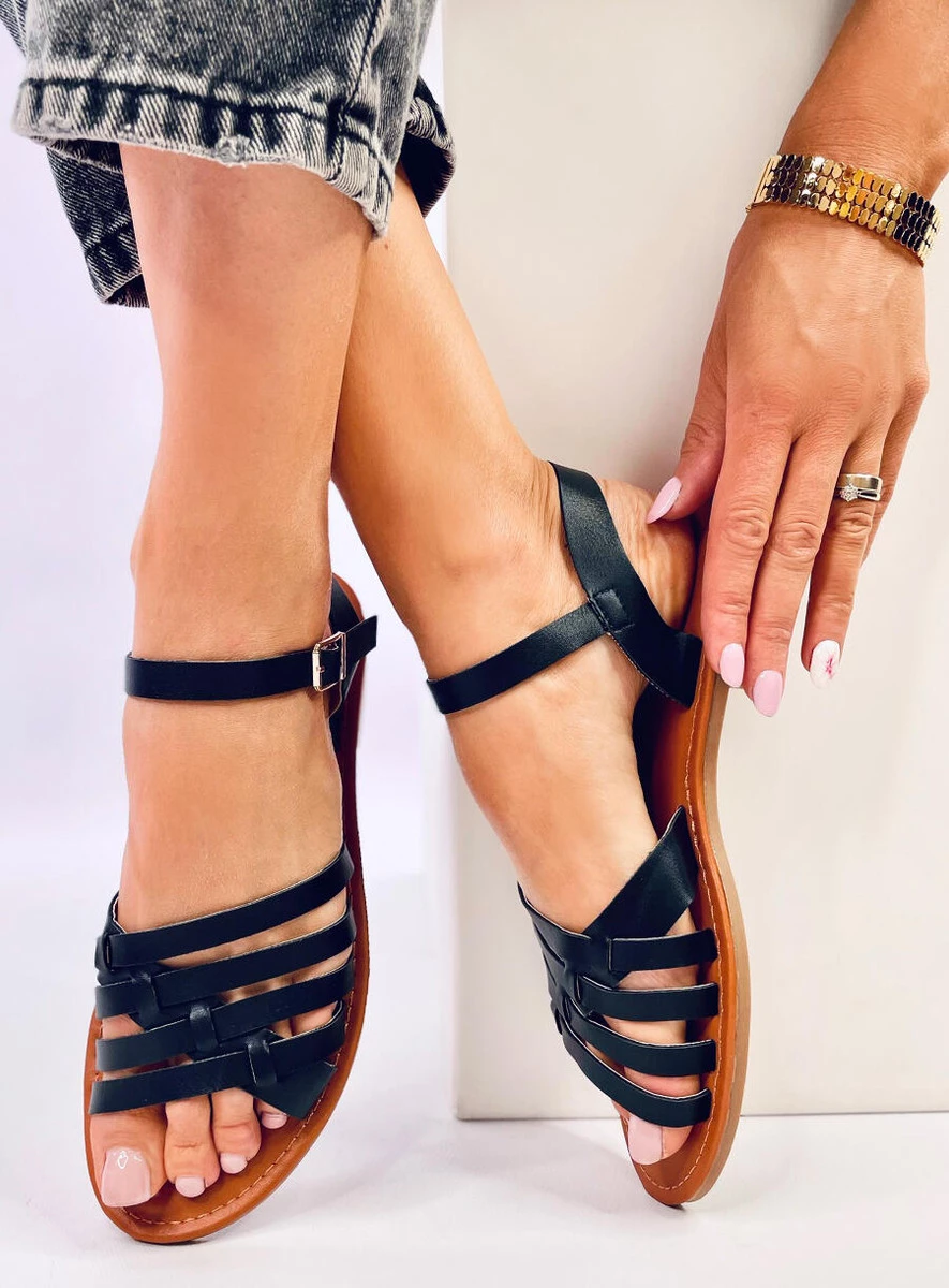 Sandałki damskie płaskie. Krzyżujące się paseczki pięknie podkreślają stopę... Dzięki tym sandałkom zabłyśniesz latem, a komfortowa płaska podeszwa zapewni wygodę na każdym kroku. Mają tak zwane „to coś” : ) Materiał zewnętrzny – skóra ekologiczna.