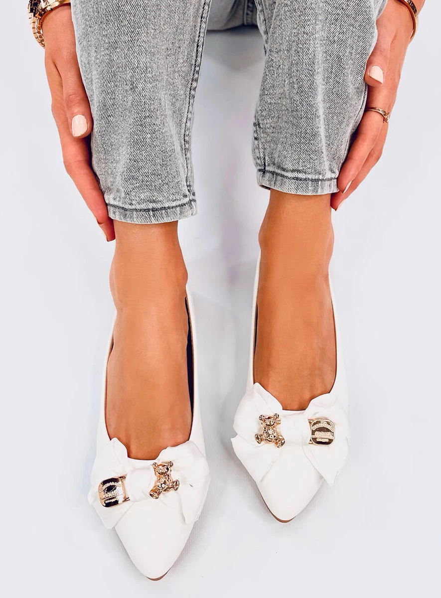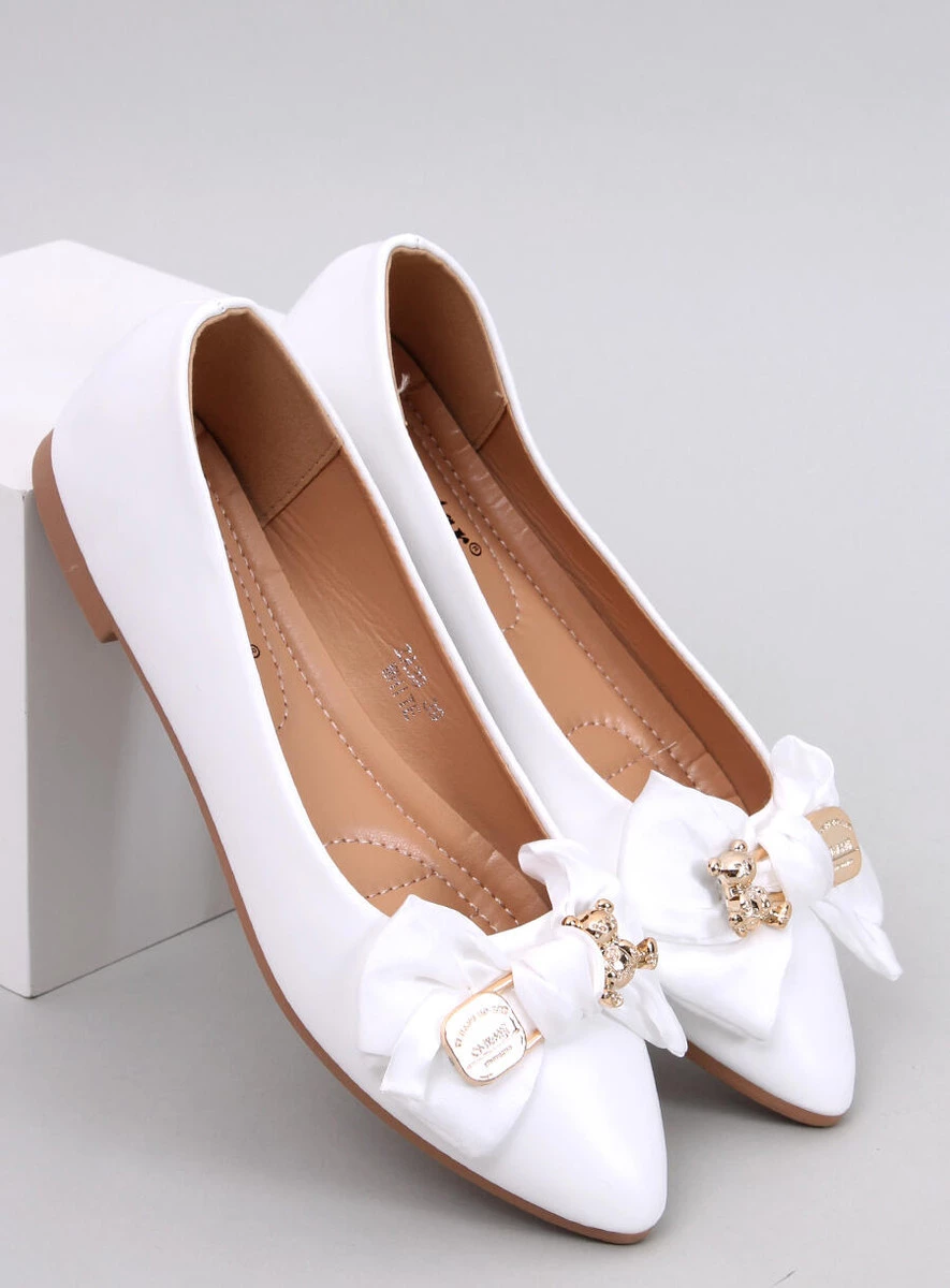 Zgrabne baleriny damskie. Model wyróżnia przepiękna, satynowa kokarda ze złotą agrafką i misiem - zakochacie się w nich po uszy! Buty prezentują się bardzo zgrabnie, a dodatkowo są wyjątkowo wygodne - mają mięciutką wkładkę wewnętrzną z poduszeczką. Materiał zewnętrzny - zamsz ekologiczny (kolor black, beige)/ skóra ekologiczna (kolor white).