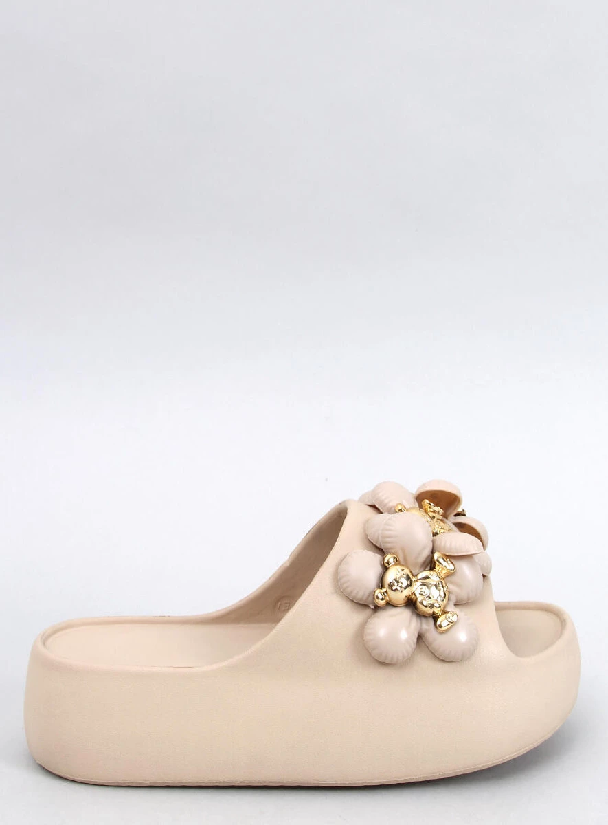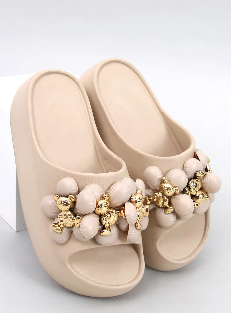 Klapki damskie na platformie - 5 cm. Przesłodkie misie w złotym kolorze nadają butom wyjątkowego uroku : ) Ten hitowy model to najwygodniejsze i najmodniejsze rozwiązanie na letnie dni... Nie czekaj i zamów je już dziś! Materiał zewnętrzny - tworzywo piankowo-gumowe.