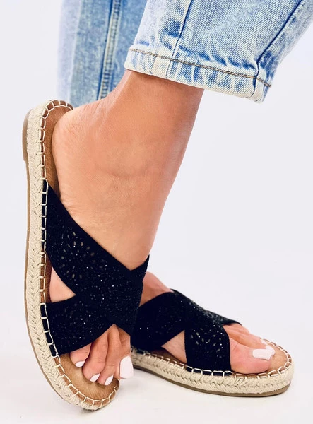 Ażurowe klapki damskie – espadryle. Połączenie plecionej lnianym sznurkiem podeszwy oraz błyszczących kamieni daje niesamowity efekt : ) Ażurowy wzór podkreśla ich wyjątkowy styl... To idealne buty na lato! Materiał zewnętrzny – zamsz ekologiczny.