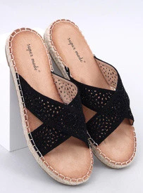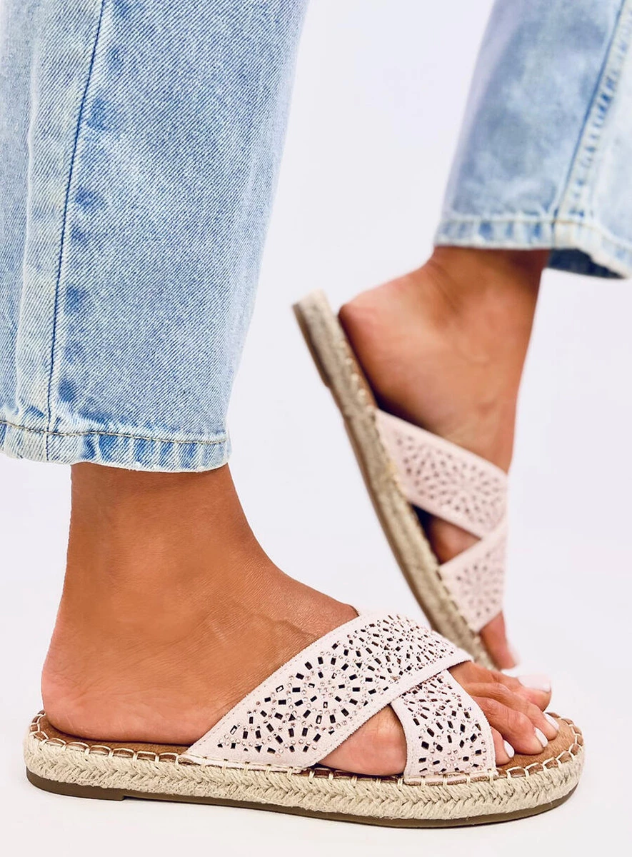 Ażurowe klapki damskie – espadryle. Połączenie plecionej lnianym sznurkiem podeszwy oraz błyszczących kamieni daje niesamowity efekt : ) Ażurowy wzór podkreśla ich wyjątkowy styl... To idealne buty na lato! Materiał zewnętrzny – zamsz ekologiczny.
