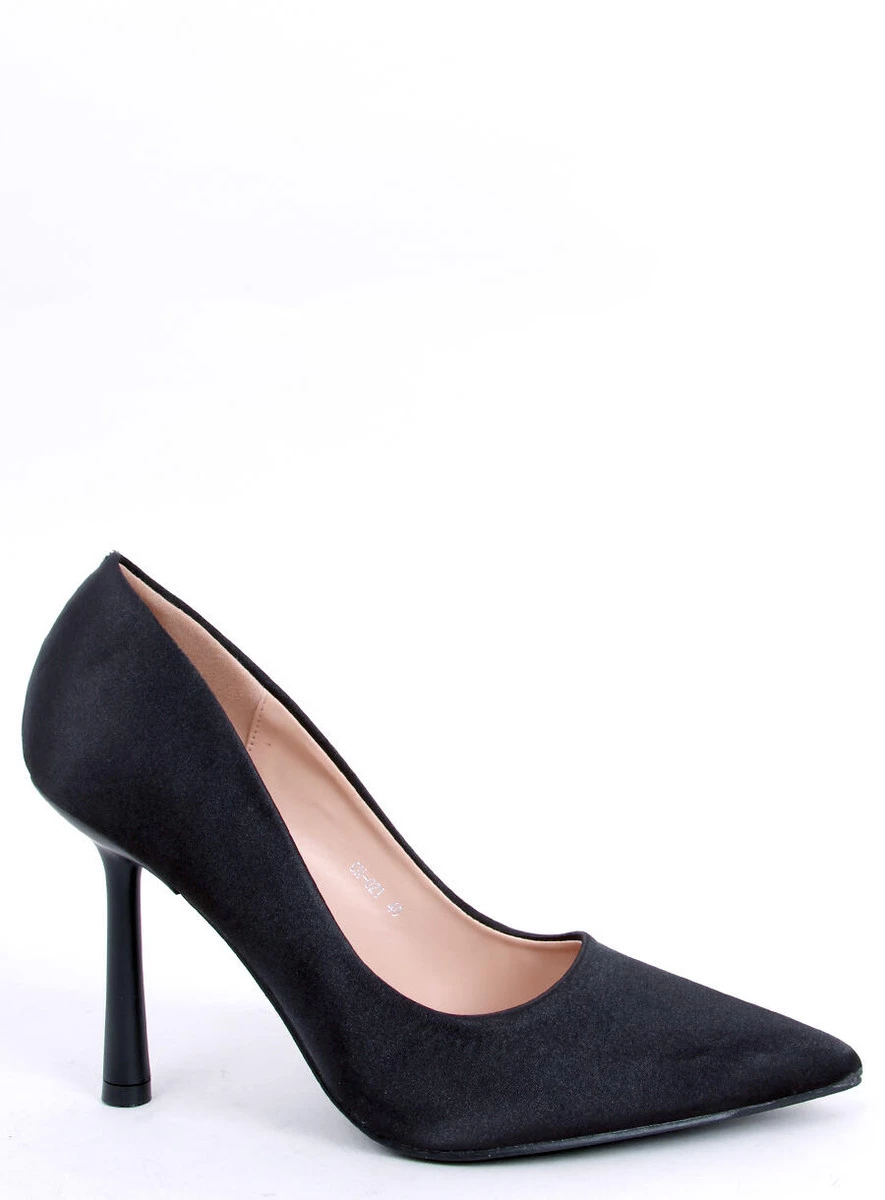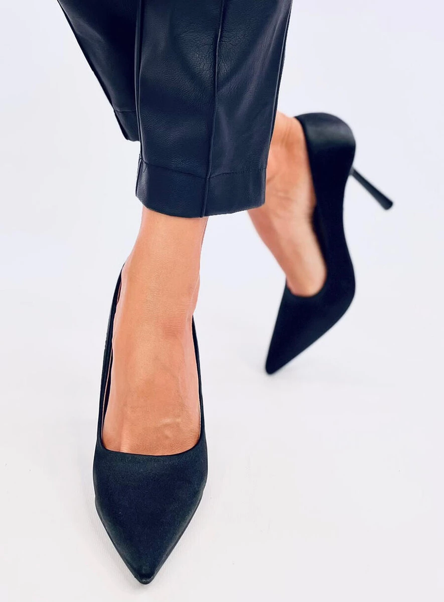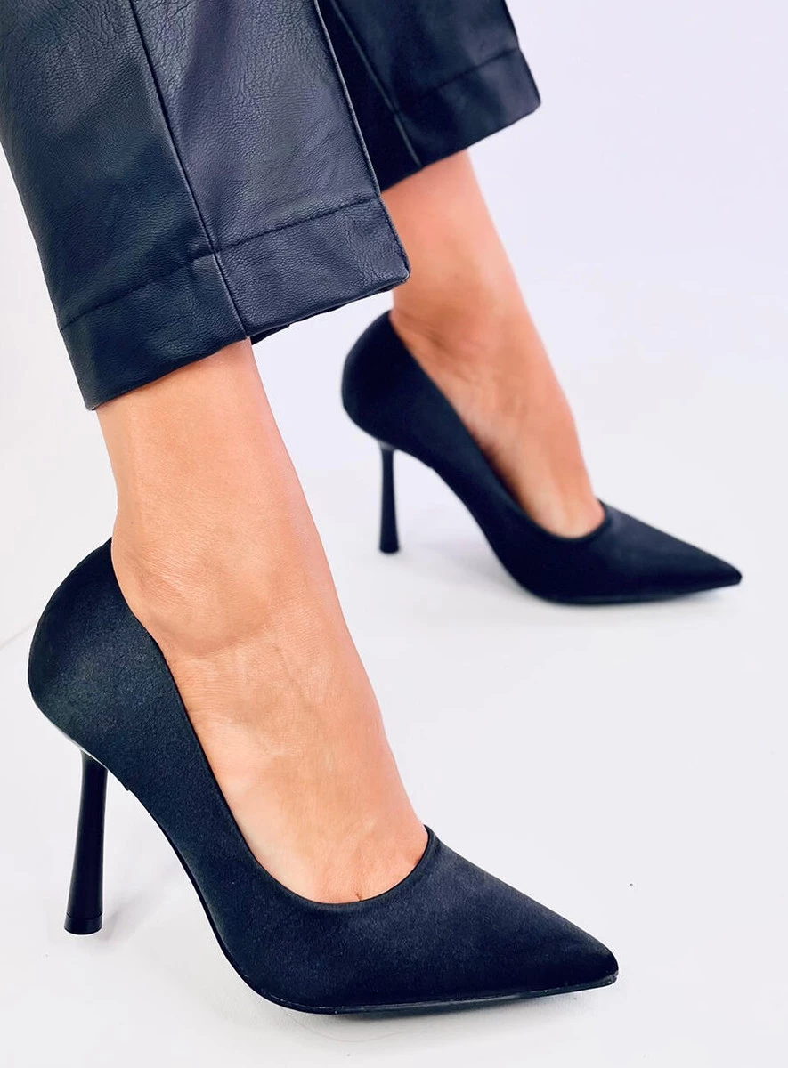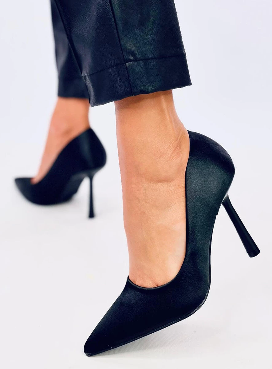 Czarne czółenka damskie na wyjątkowym obcasie. Model ma zgrabne noski w delikatny szpic - pięknie prezentuje się na nodze... Szpilka o wysokości 10 cm w matowym wykończeniu gwarantuje niesamowity komfort na każdym kroku (usytuowana jest na środku pięty) - przekonaj się o tym sama : ) Wykonane są z tkaniny imitującej satynę, która podkreśla ich wyjątkowy styl.