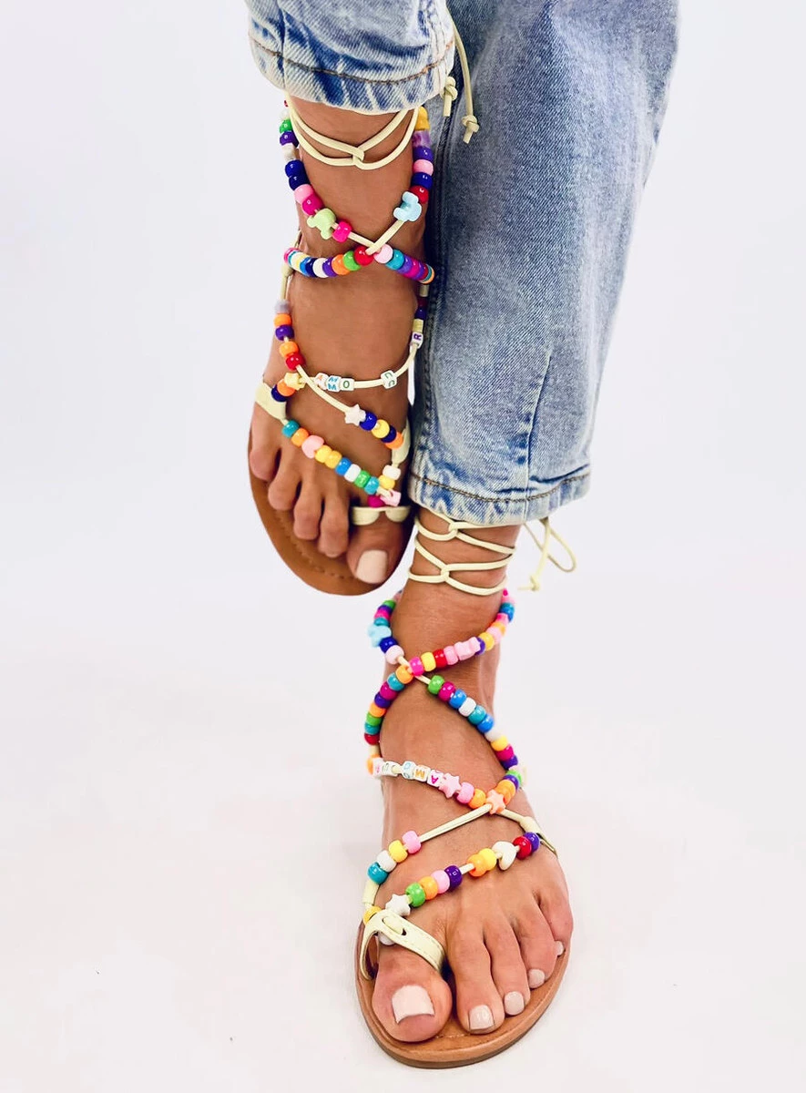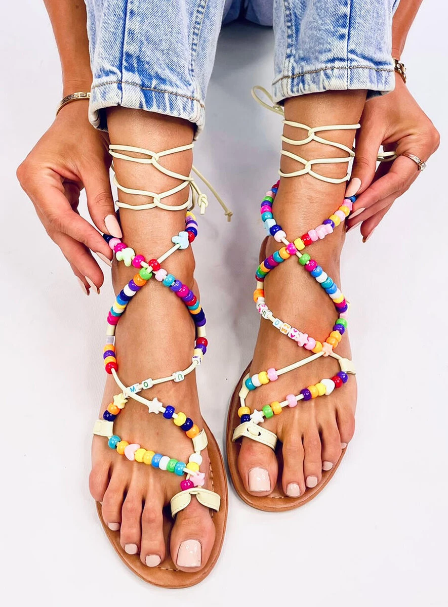 Płaskie sandałki damskie - rzymianki o kroju japonek. To absolutny hit tego lata! Wiązanie wokół kostki pięknie ją podkreśla, a kolorowe koraliki sprawiają, że nie można od nich oderwać oczu... To buty, które kojarzą się z wakacjami, słońcem i luzem : ) Materiał zewnętrzny - skóra ekologiczna.