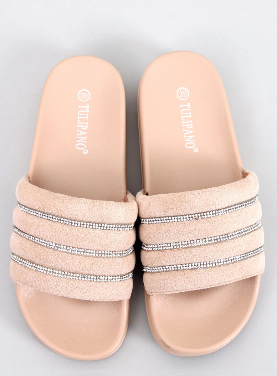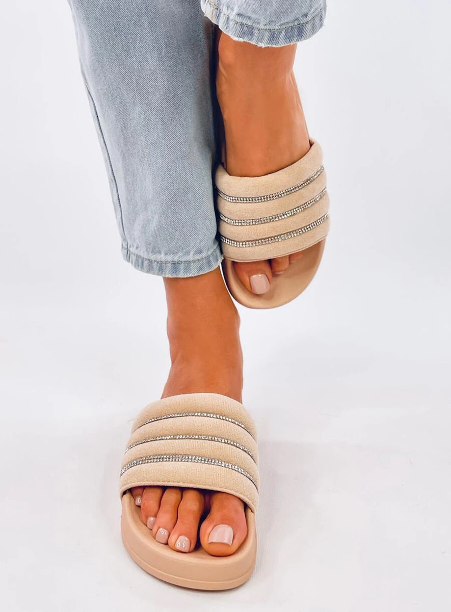 Klapki damskie na gumowej podeszwie. Model urzeka błyszczącą aplikacją z delikatnych cyrkonii... Świetnie wyprofilowana wkładka wewnętrzna zapewni wygodę na każdym kroku. Z pewnością spełnią Twoje oczekiwania : ) Materiał zewnętrzny – zamsz ekologiczny.