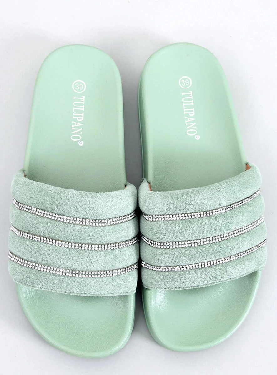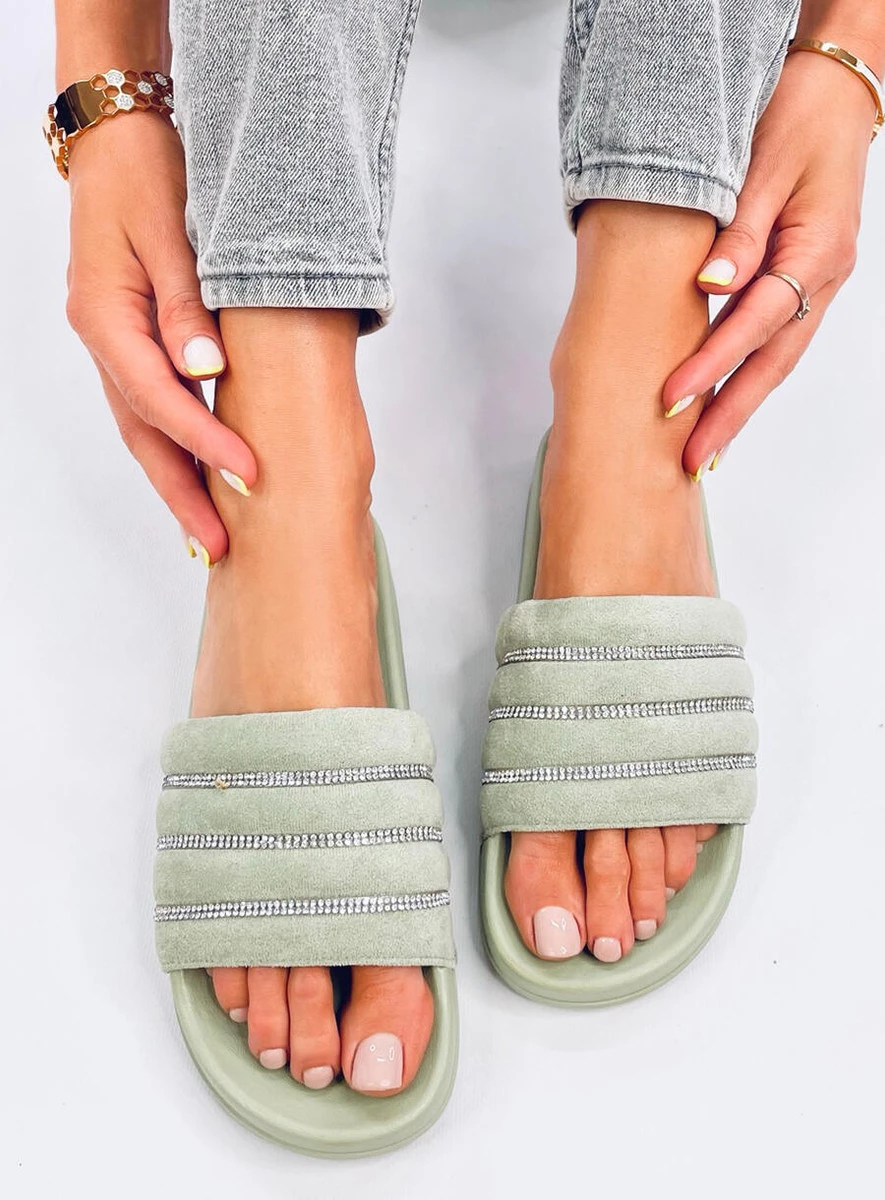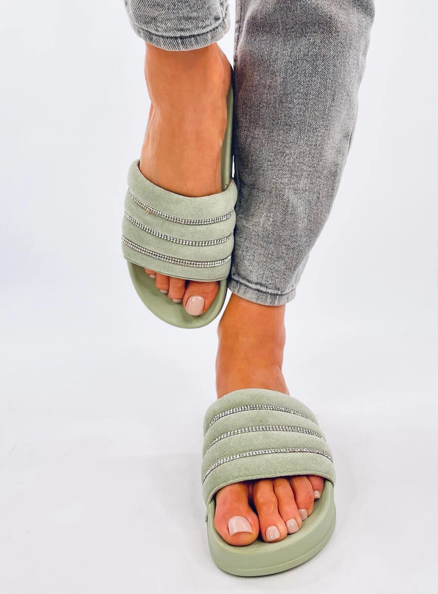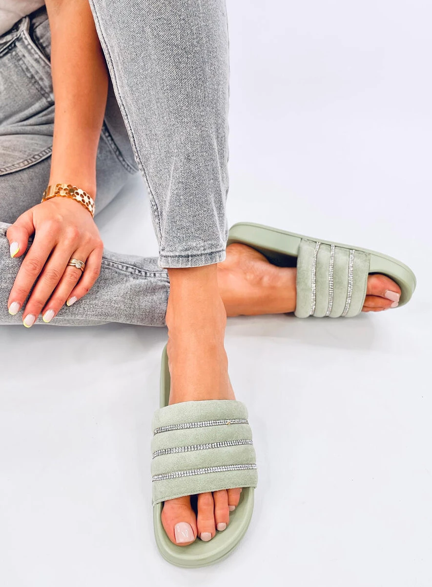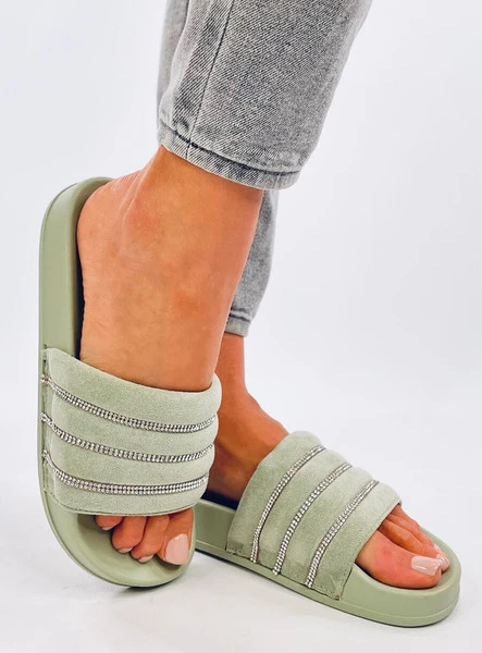 Klapki damskie na gumowej podeszwie. Model urzeka błyszczącą aplikacją z delikatnych cyrkonii... Świetnie wyprofilowana wkładka wewnętrzna zapewni wygodę na każdym kroku. Z pewnością spełnią Twoje oczekiwania : ) Materiał zewnętrzny – zamsz ekologiczny.