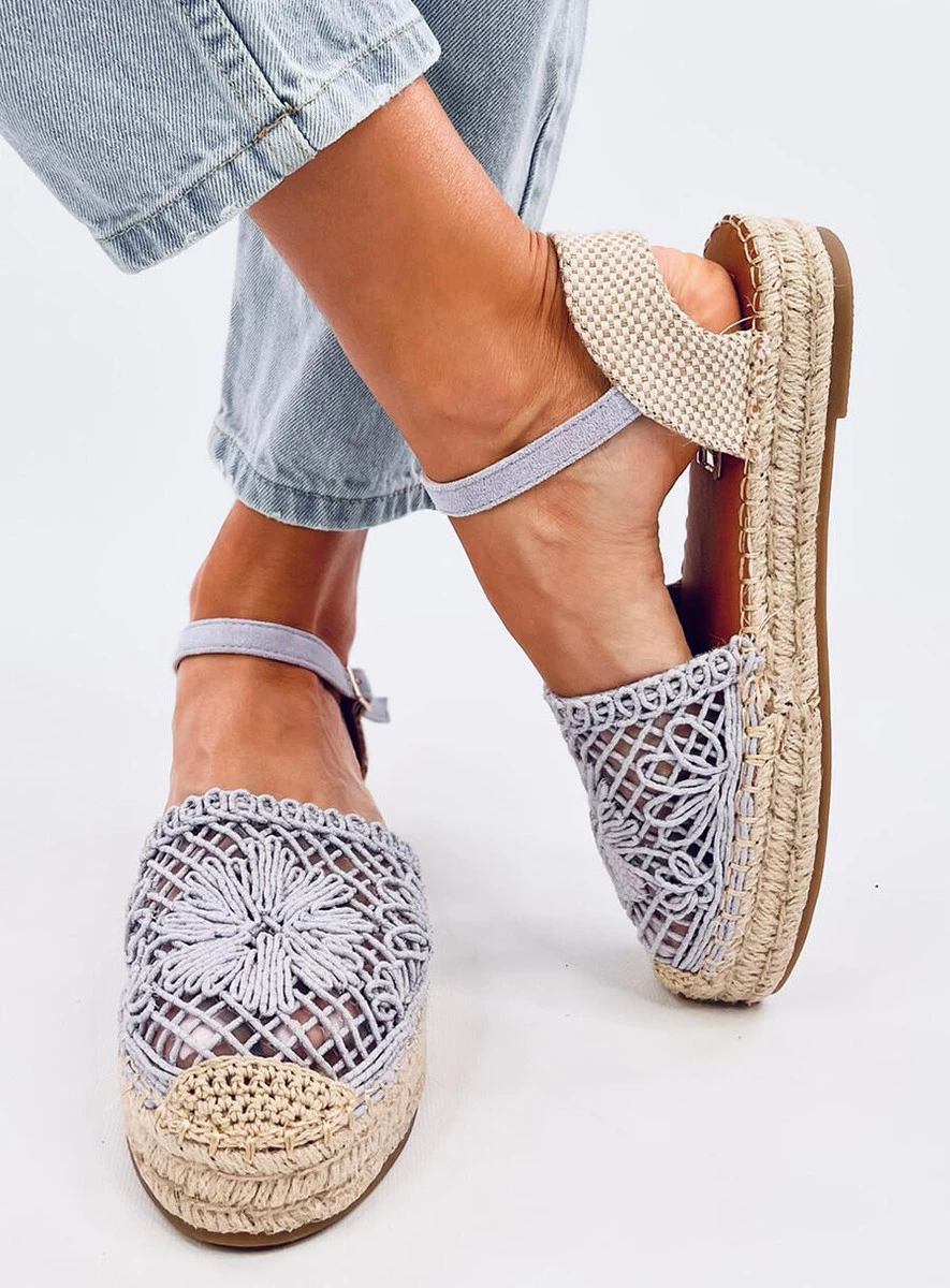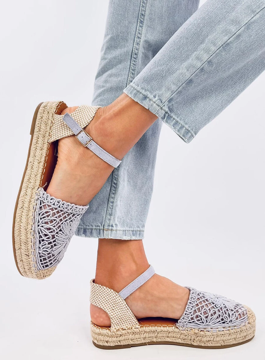 Espadryle - sandałki damskie na lnianej podeszwie. Ten wyjątkowy model jest bardzo delikatny i romantyczny dzięki niepowtarzalnemu, ażurowemu wykończeniu... Natomiast regulowane zapięcie podkreśla kostkę. To pozycją obowiązkowa w wiosenno-letniej garderobie : ) Wnętrze butów wyścielone jest tkaniną. Materiał zewnętrzny – tkanina + zamsz ekologiczny.
