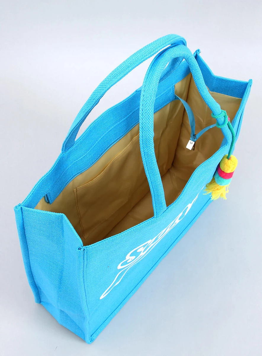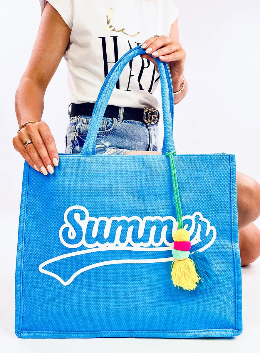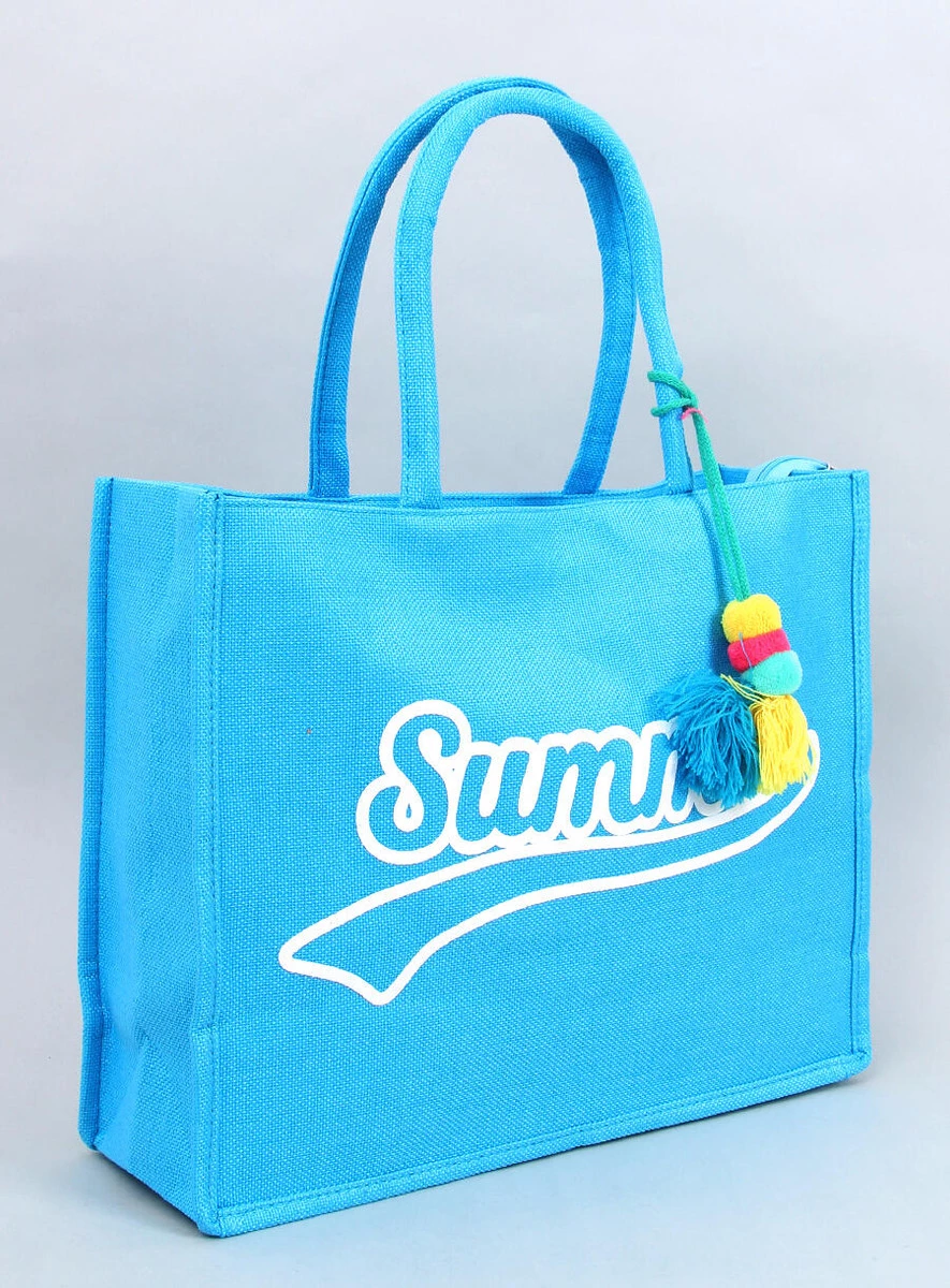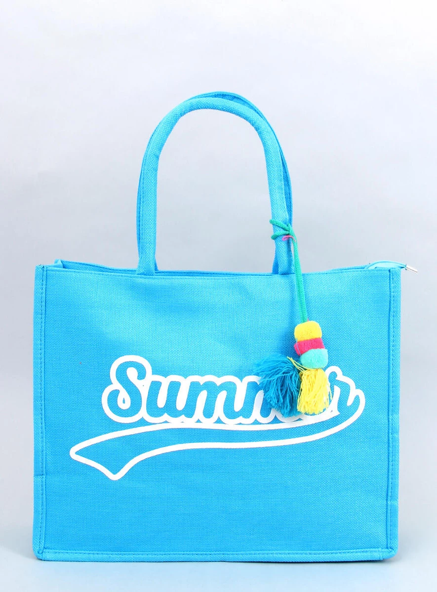 Torba plażowa damska z kolorowym frędzelkiem. Front zdobi wakacyjny napis "SUMMER". Torba zapinana na całej długości na zamek błyskawiczny, wnętrze obszyte jest podszewką z małą zakładką. Jest bardzo pojemna, a przy tym bardzo lekka. Z łatwością pomieści wszystkie najpotrzebniejsze rzeczy, które przydadzą się na plażę lub spacer.
