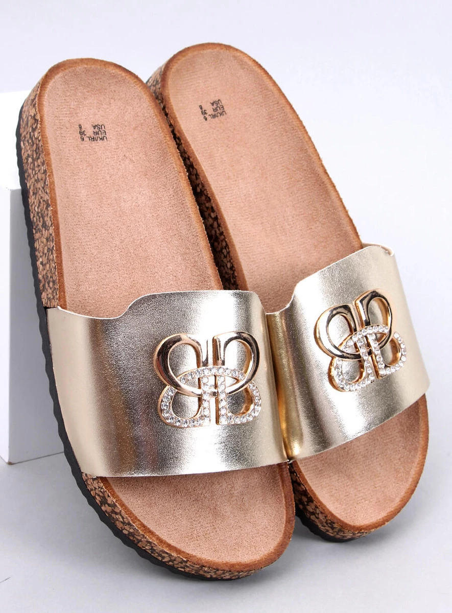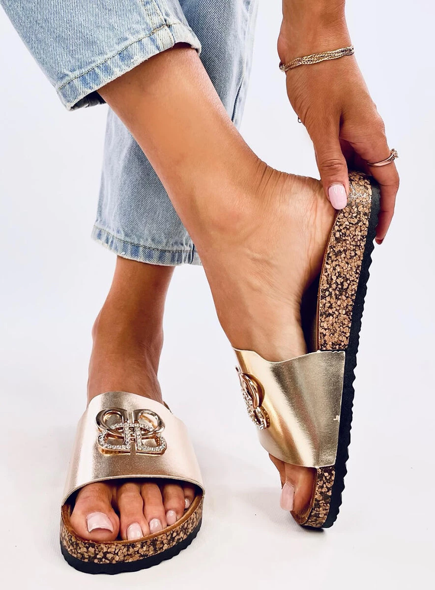 Licowe klapki damskie na korkowej podeszwie. Mają szeroki pas ze stylową ozdobą i cyrkoniami, która na pewno wpadnie Wam w oko : ) Te niesamowicie wygodne klapki z profilowaną wkładką wewnętrzną muszą obowiązkowo znaleźć się w każdej szafie! Materiał zewnętrzny - skóra ekologiczna.