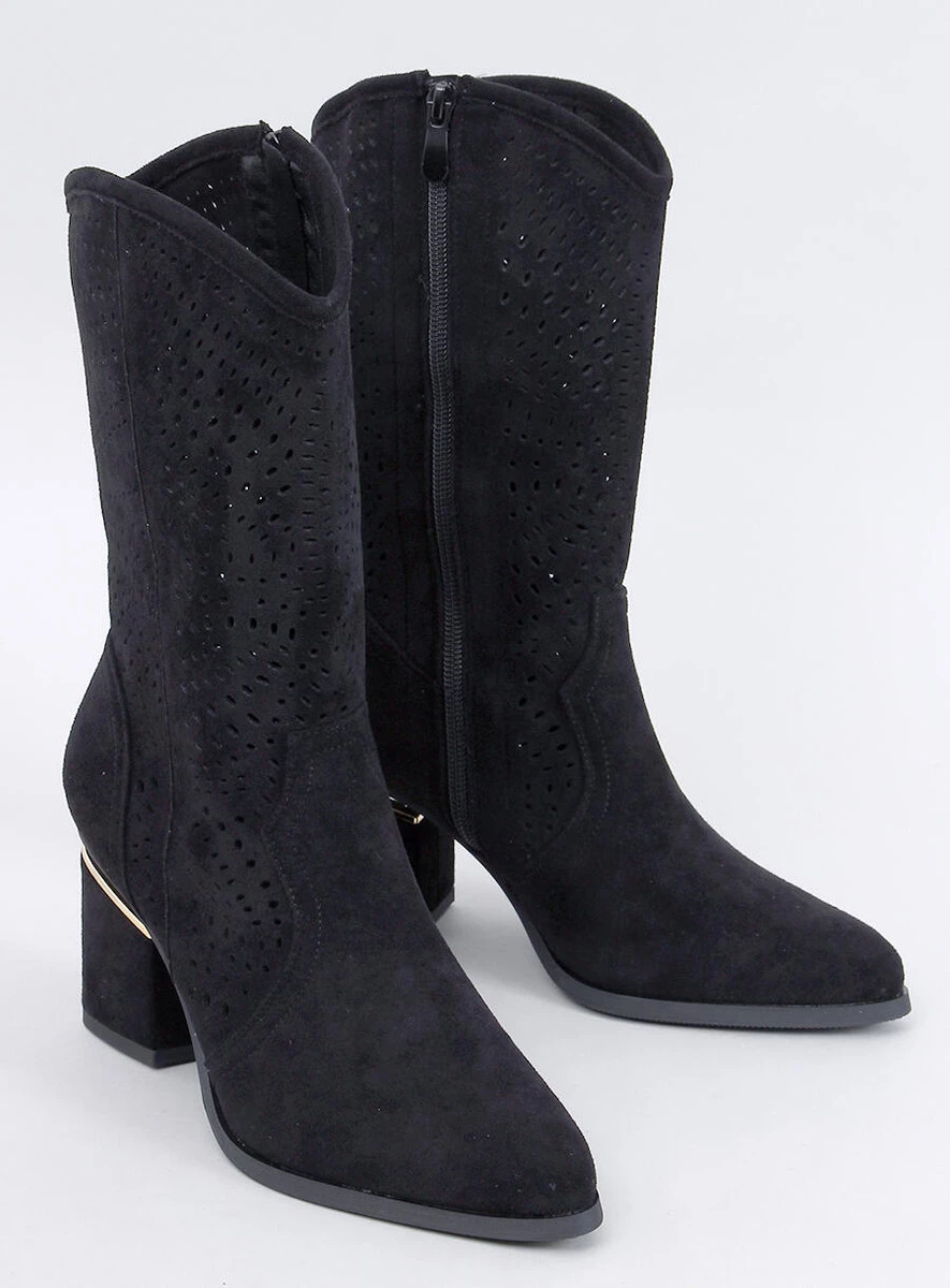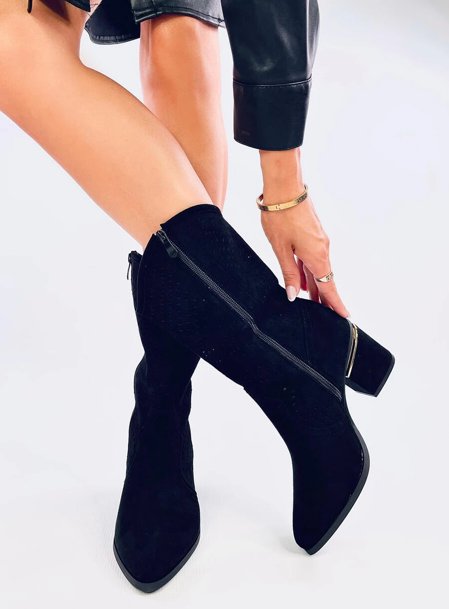 Kozaki na obcasie z ażurową cholewką, wyciętą subtelnym wzorem. Wykonane są z miękkiego zamszu eko. Po wewnętrznej stronie mają suwak na całej wysokości ułatwiający zakładanie. Mają szeroki i stabilny obcas z delikatną złotą wstawką, dodającą nutki elegancji. Ciężko przejść obok nich obojętnie.