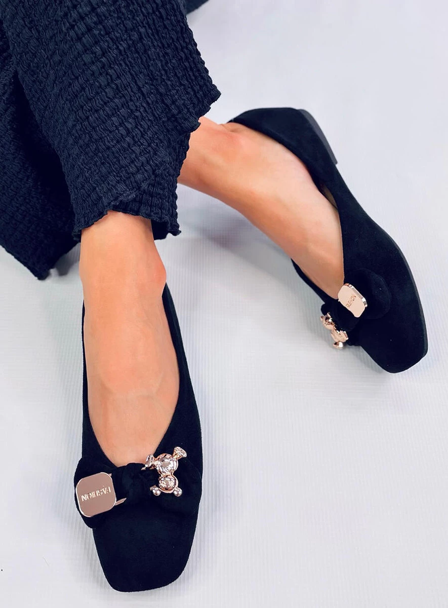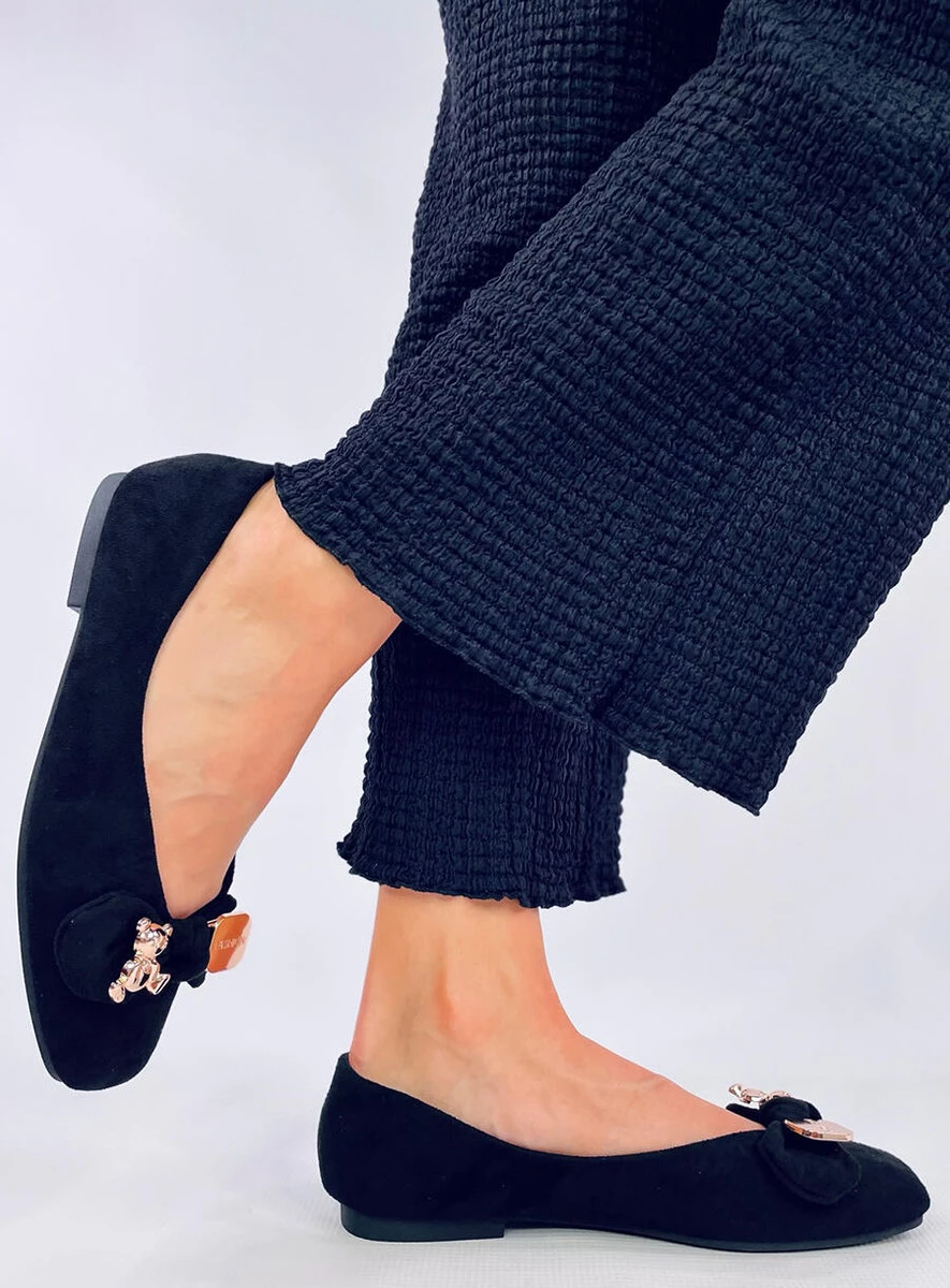 Zamszowe baleriny damskie. Kokarda ze złotą agrafką i uroczym misiem na pewno sprawi, że nie oderwiecie od nich wzroku : ) Buty prezentują się bardzo zgrabnie - mają fason z kwadratowymi noskami. Ponadto są wyjątkowo wygodne, dzięki miękkiej wkładce wewnętrznej z poduszeczką. Materiał zewnętrzny - zamsz ekologiczny.