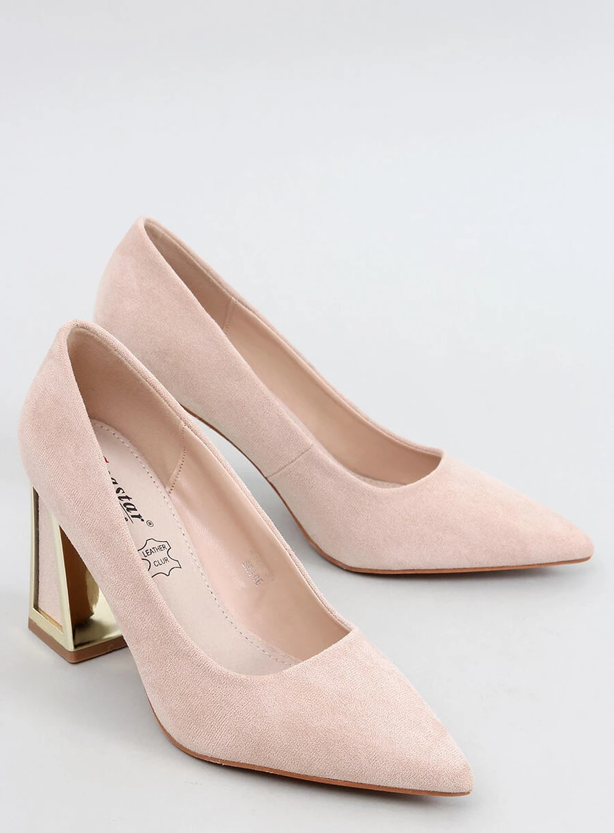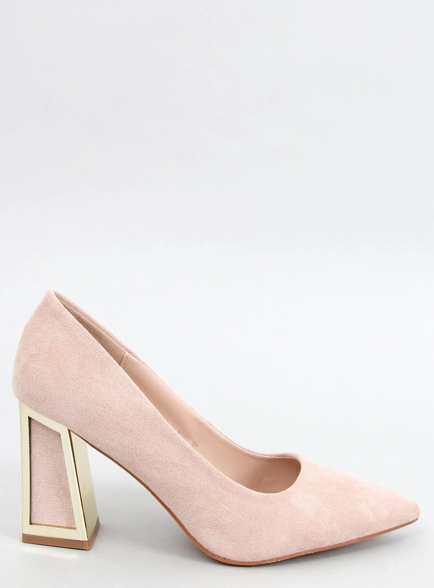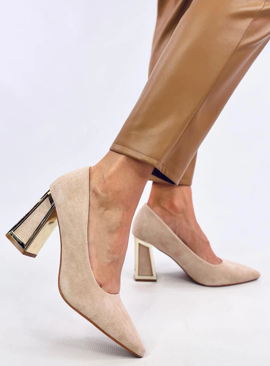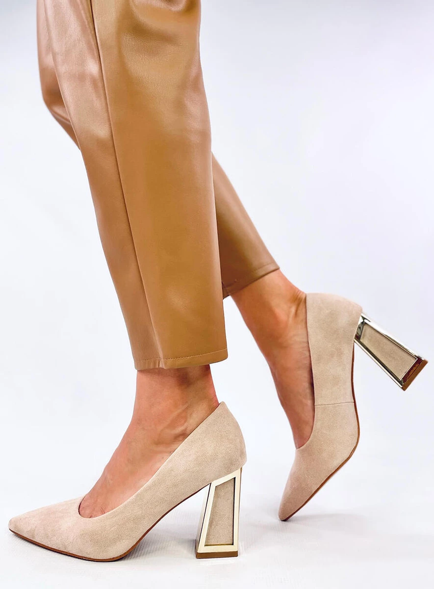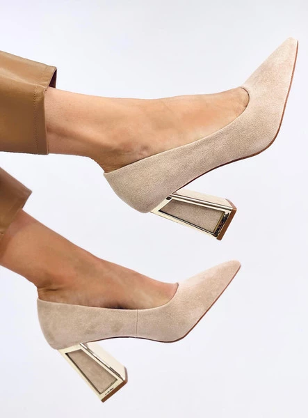 Zamszowe czółenka damskie na geometrycznym obcasie o wysokości 9 cm. Ich zgrabny fason w połączeniu ze złotymi wstawkami daje niepowtarzalny efekt... Pięknie prezentują się na nodze! Jeśli chcesz wyglądać wyjątkowo i cieszyć się komfortem to musisz je mieć - mają wkładkę wewnętrzną ze skóry naturalnej : ) Materiał zewnętrzny - zamsz ekologiczny.