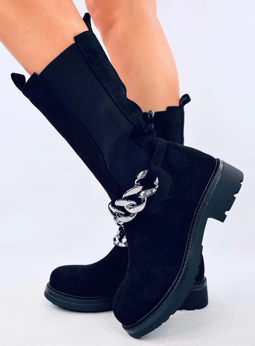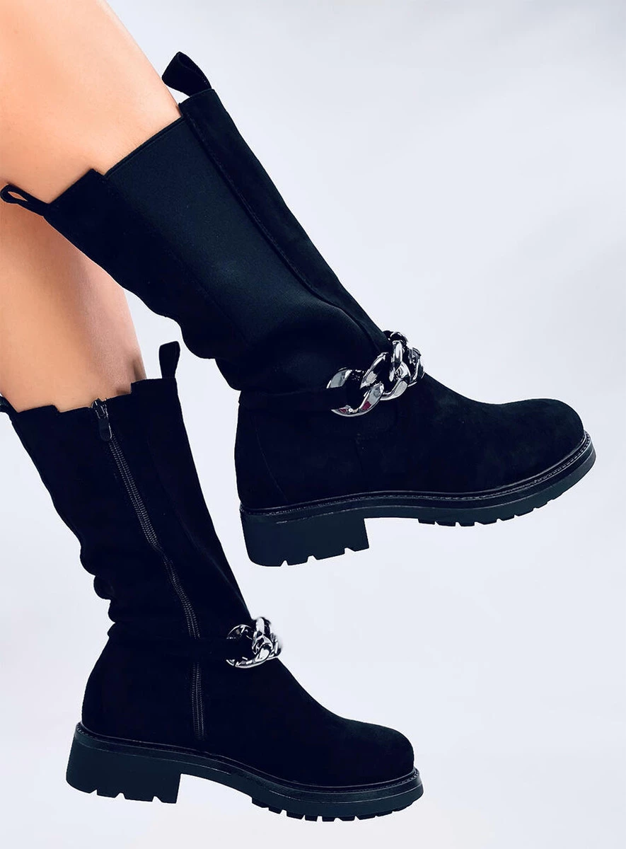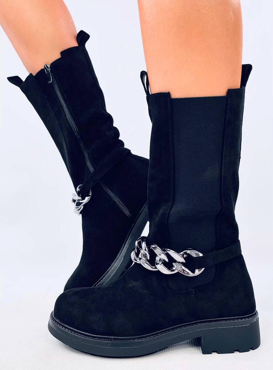 Zamszowe botki damskie - sztyblety. Mają unikalny fason z wysoką cholewką i elastyczną wstawką z boku, która nawiązuje do sztybletów. To co przyciąga wzrok to najmodniejszy łańcuch, który jest odpinany. Nie czekaj i zamów je już dziś! Praktyczne zapięcie na suwak ułatwia zakładanie. Wykonane są z zamszu ekologicznego, na piankowym podszyciu.