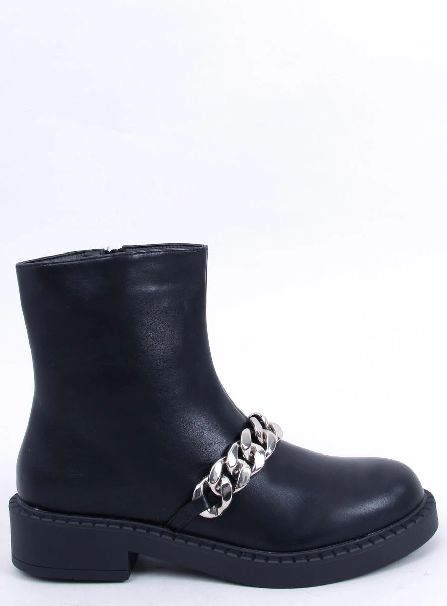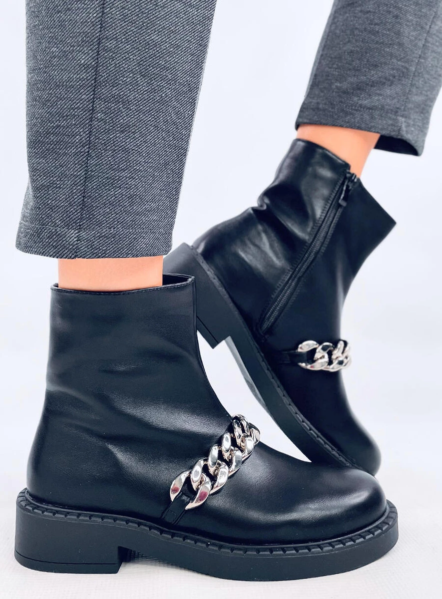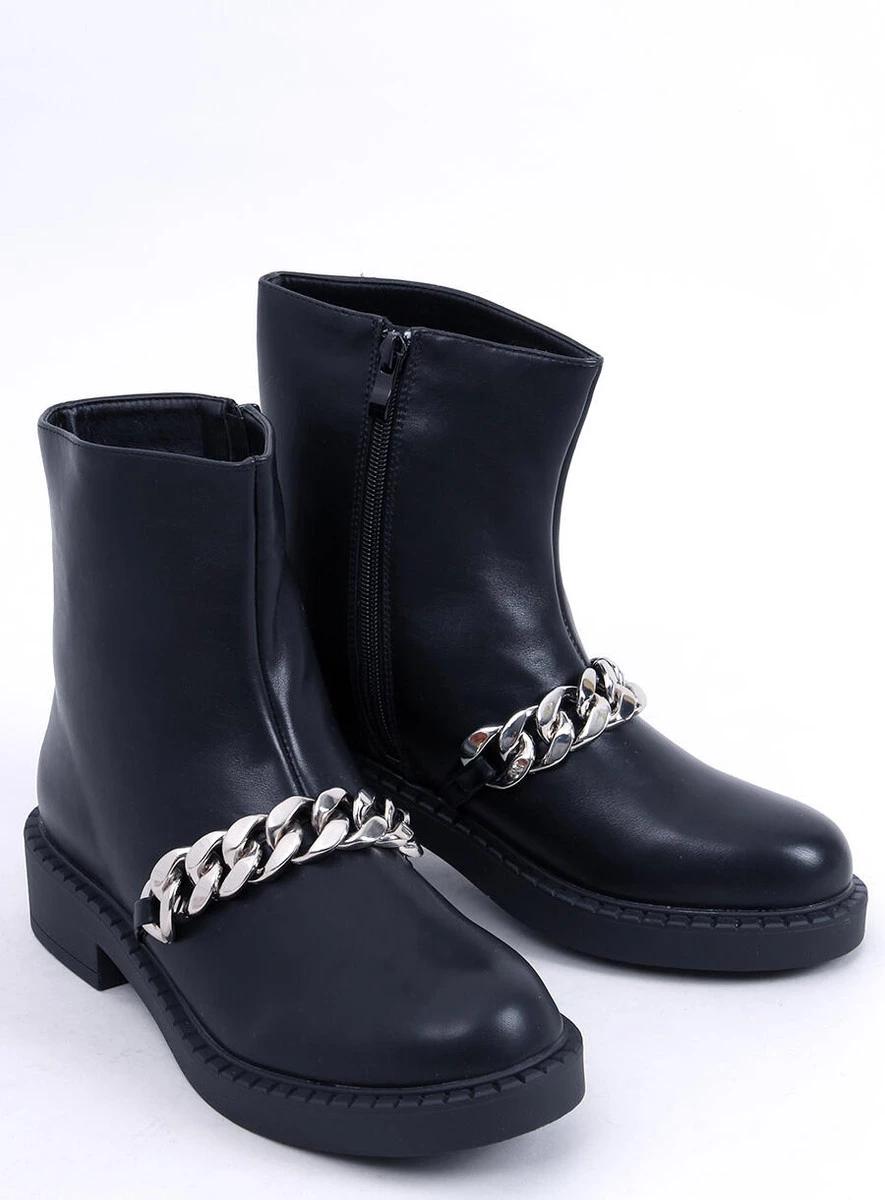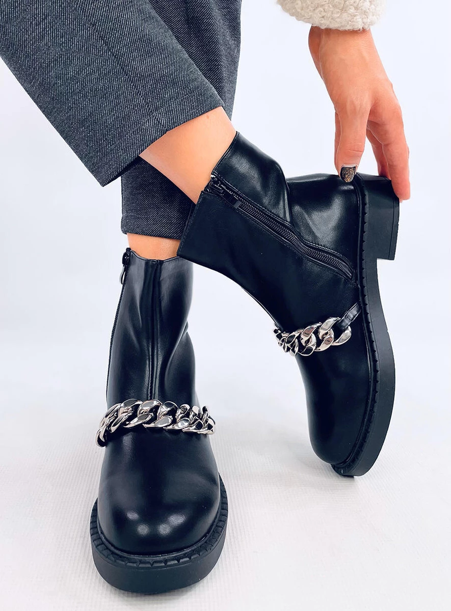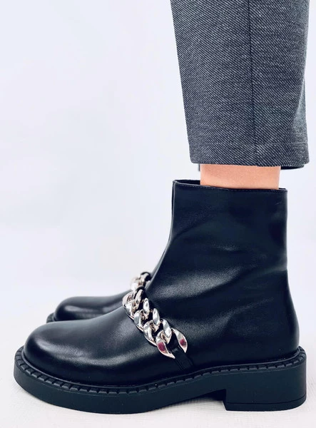 Licowe botki damskie. Ten efektowny model ze srebrnym łańcuchem to w tym sezonie modowy must have! Wygodne zapięcie na suwak z boku cholewki zapewnia komfortowe zakładanie. Zamów je już dziś, a nie pożałujesz : ) Wykonane są ze skóry ekologicznej, a wnętrze wyścielone jest delikatnym futerkiem.