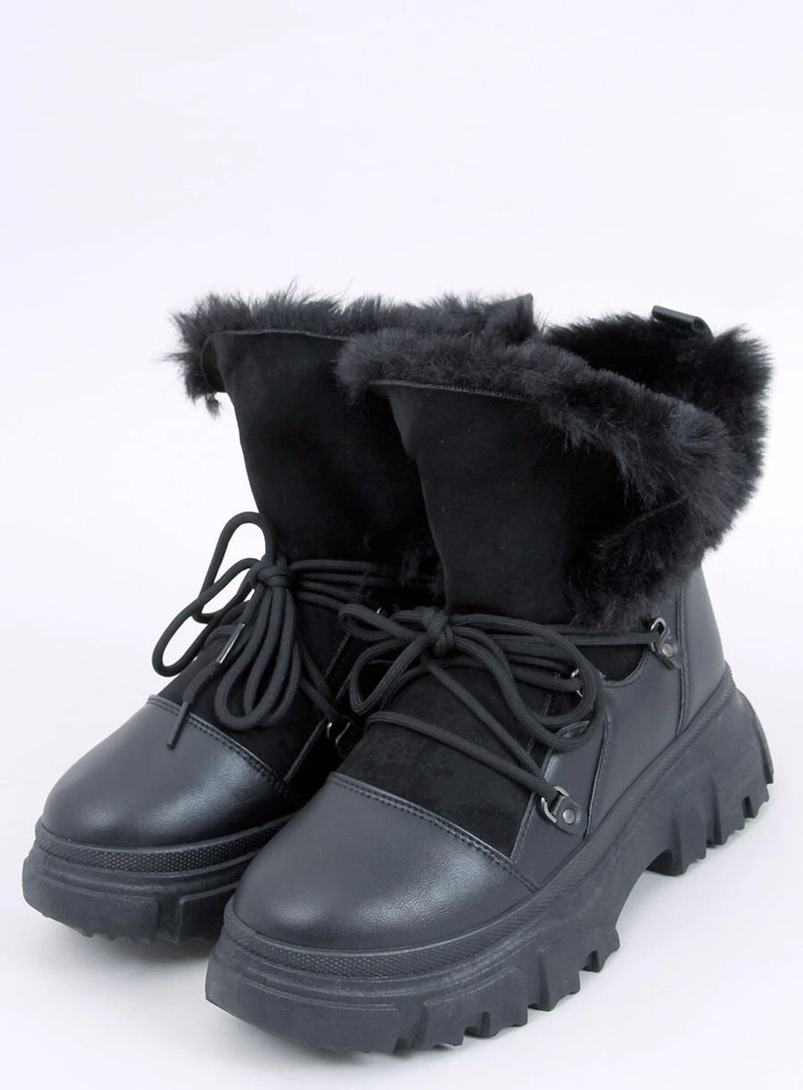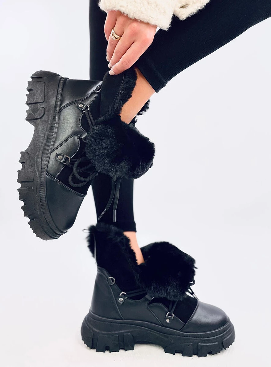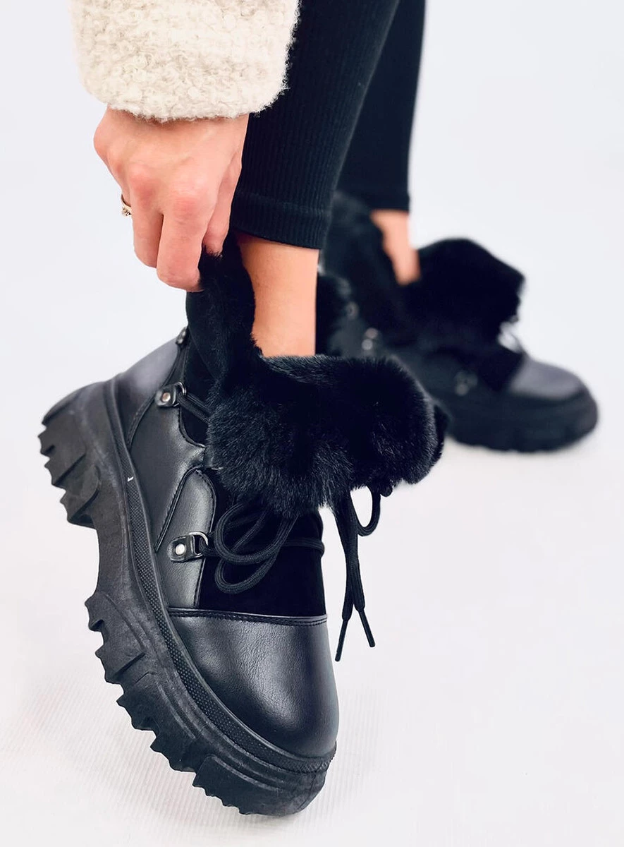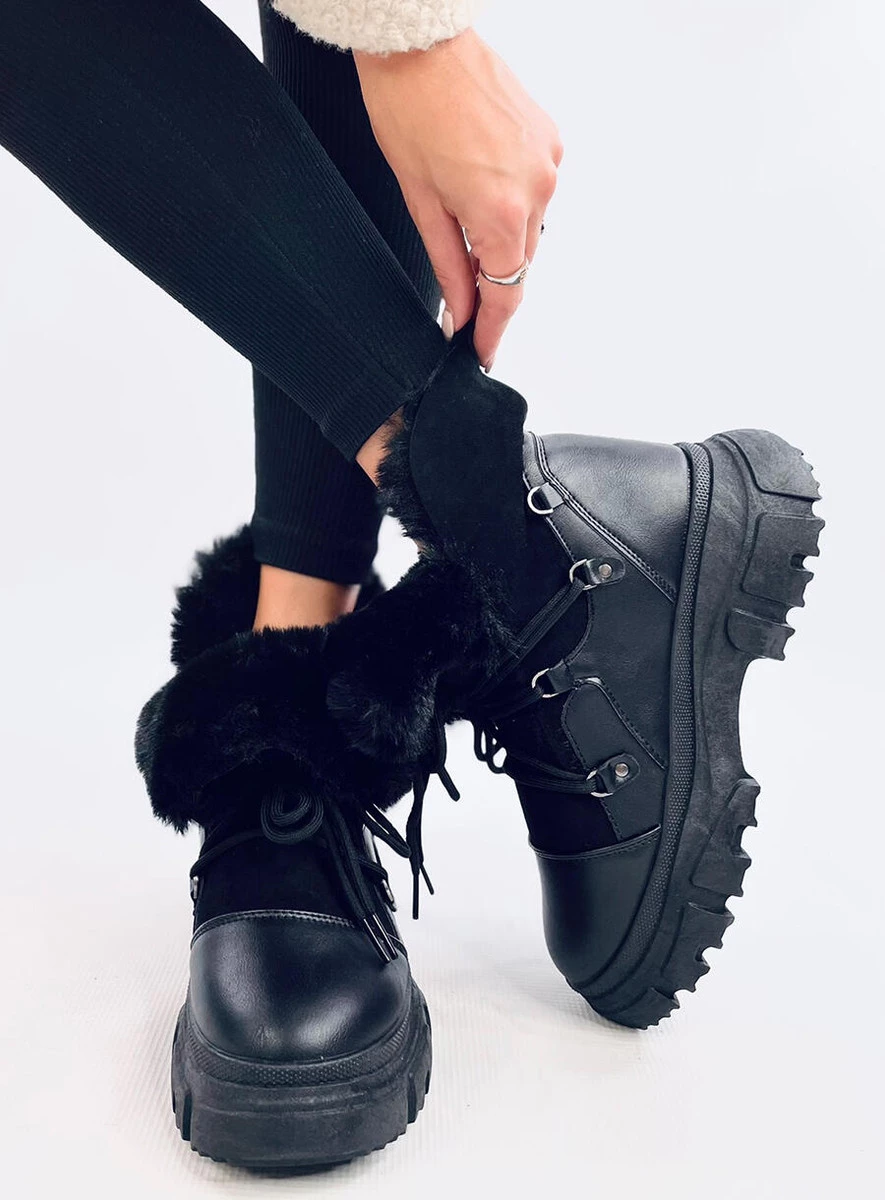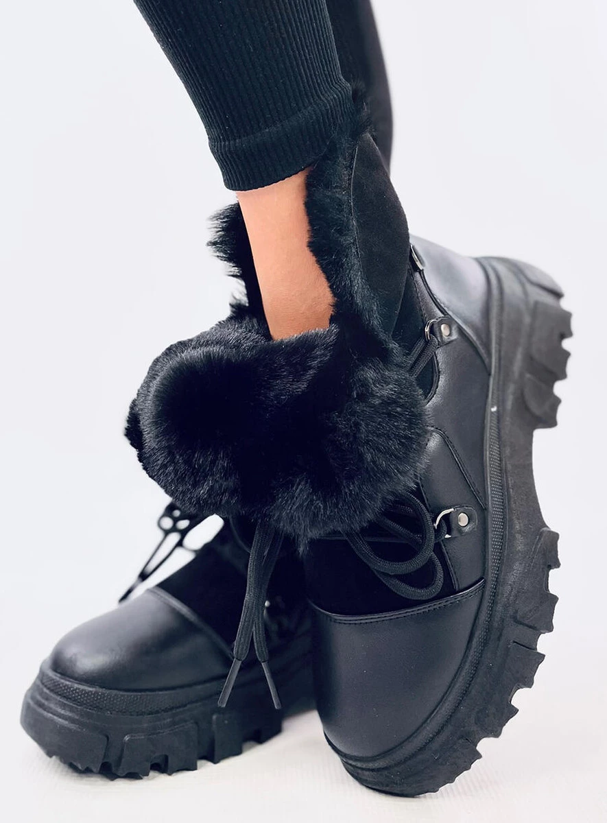 Śniegowce damskie z futerkiem. Model ma sportowy fason na wysokiej podeszwie, która świetnie izoluje od podłoża i idealnie sprawdzi się podczas zimowych spacerów zapewniając przyczepność i wygodę. Koniecznie zaopatrz się w te ocieplane futerkiem botki, a zima będzie Ci niestraszna! Materiał zewnętrzny – zamsz ekologiczny + skóra ekologiczna.