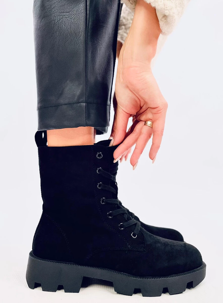 Zamszowe botki damskie - workery na grubej podeszwie. Praktyczne zapięcie na zamek błyskawiczny z boku cholewki zapewnia szybkie i bezproblemowe zakładanie, a dzięki tradycyjnemu sznurowaniu można buty idealnie dopasować do tęgości stopy. Workery to nie tylko praktyczne rozwiązanie na jesienne chłody, ale także modowy must have : ) Wykonane są z zamszu ekologicznego, a wnętrze wyścielone jest delikatnym futerkiem.