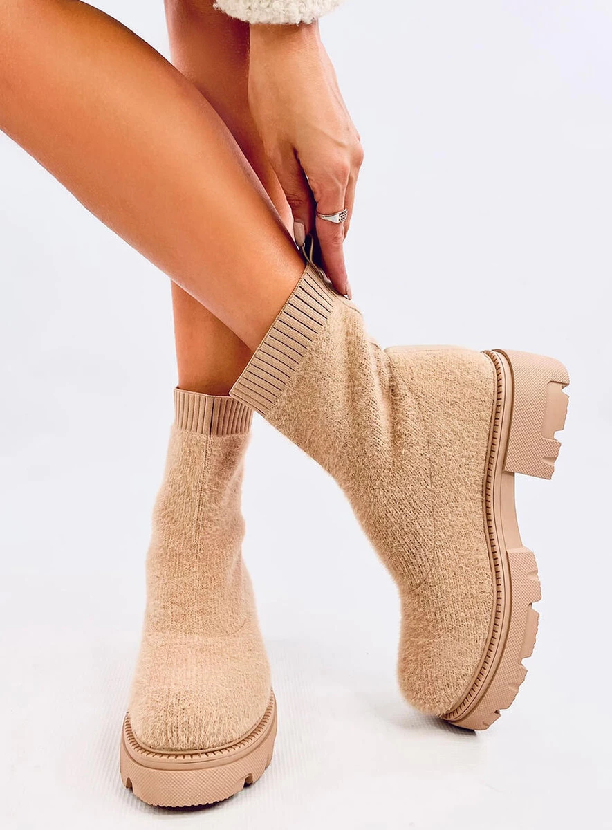 Botki damskie na grubej podeszwie. Doskonale wpisują się w trendy tego sezonu! Wykonane są z najmodniejszej, skarpetkowej tkaniny pokrytej milutkim i puszystym futerkiem, dzięki czeku idealnie dopasowują się do nogi... To absolutny hit, więc nie daj się dłużej namawiać : ) Ocieplacz - delikatne futerko w części stopy.