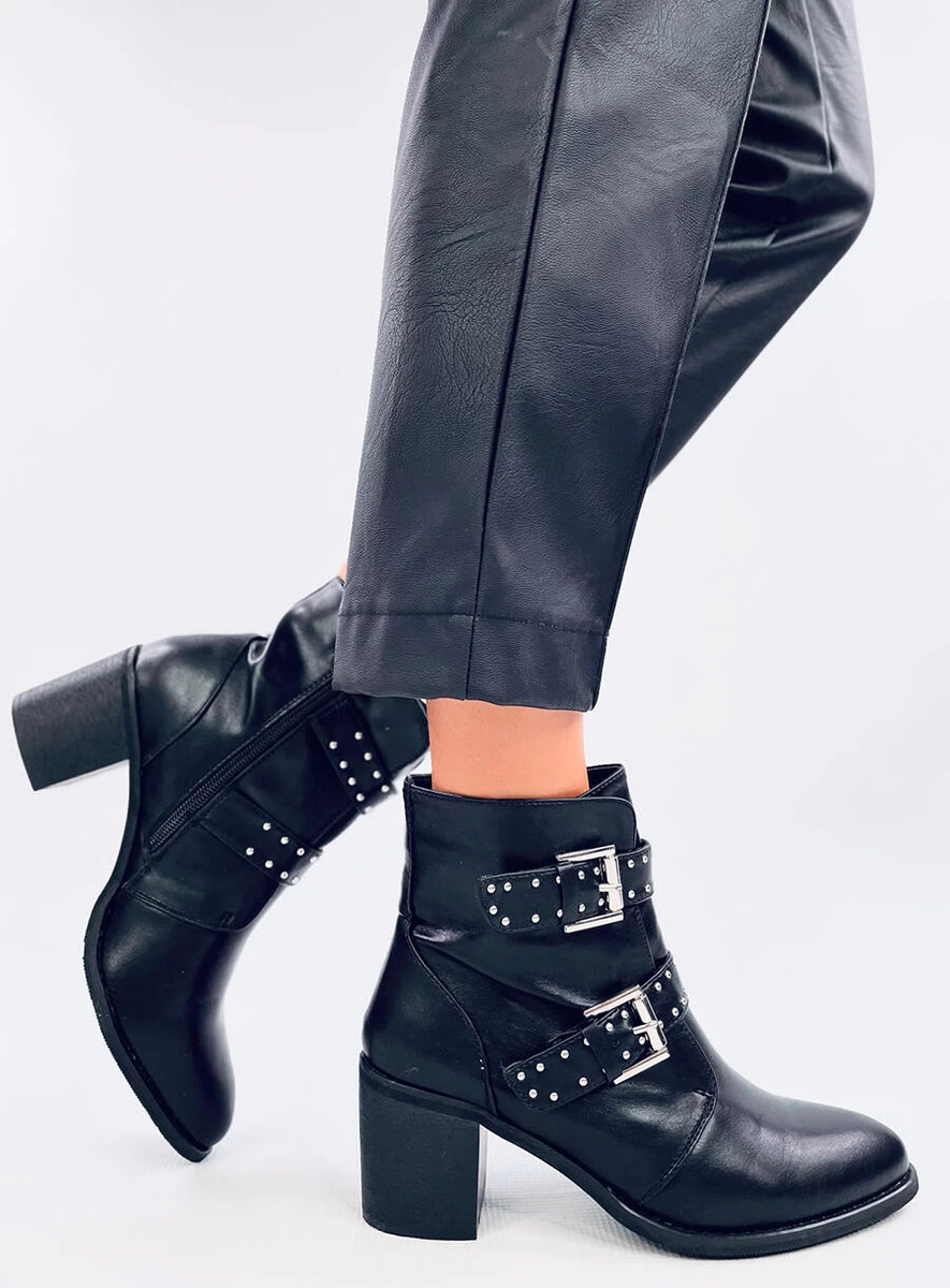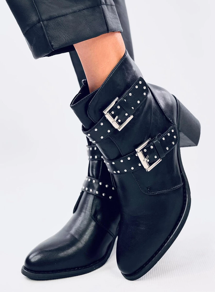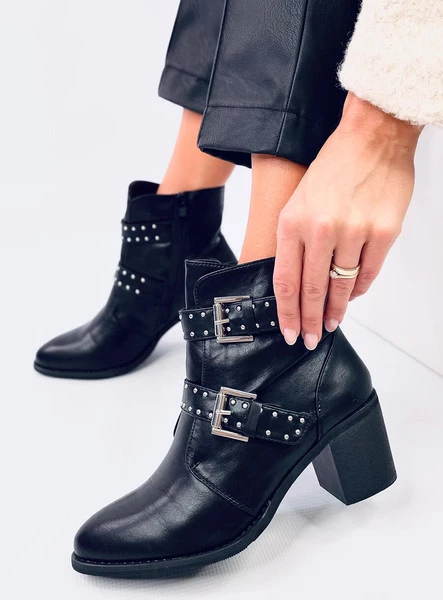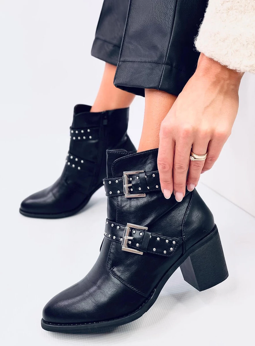 Licowe botki damskie na szerokim obcasie o wysokości 6,5 cm. Mają paski z klamerkami oraz liczne srebrne ćwieki, które rewelacyjnie komponują się z rockowym charakterem oraz czarnym kolorem tych butów. Uwielbiamy takie połączenia! Mają praktyczne zapięcie na zamek błyskawiczny po wewnętrznej stronie, który ułatwia zakładanie. Wykonane z licowej skóry ekologicznej, a wyścielone delikatnym futerkiem.
