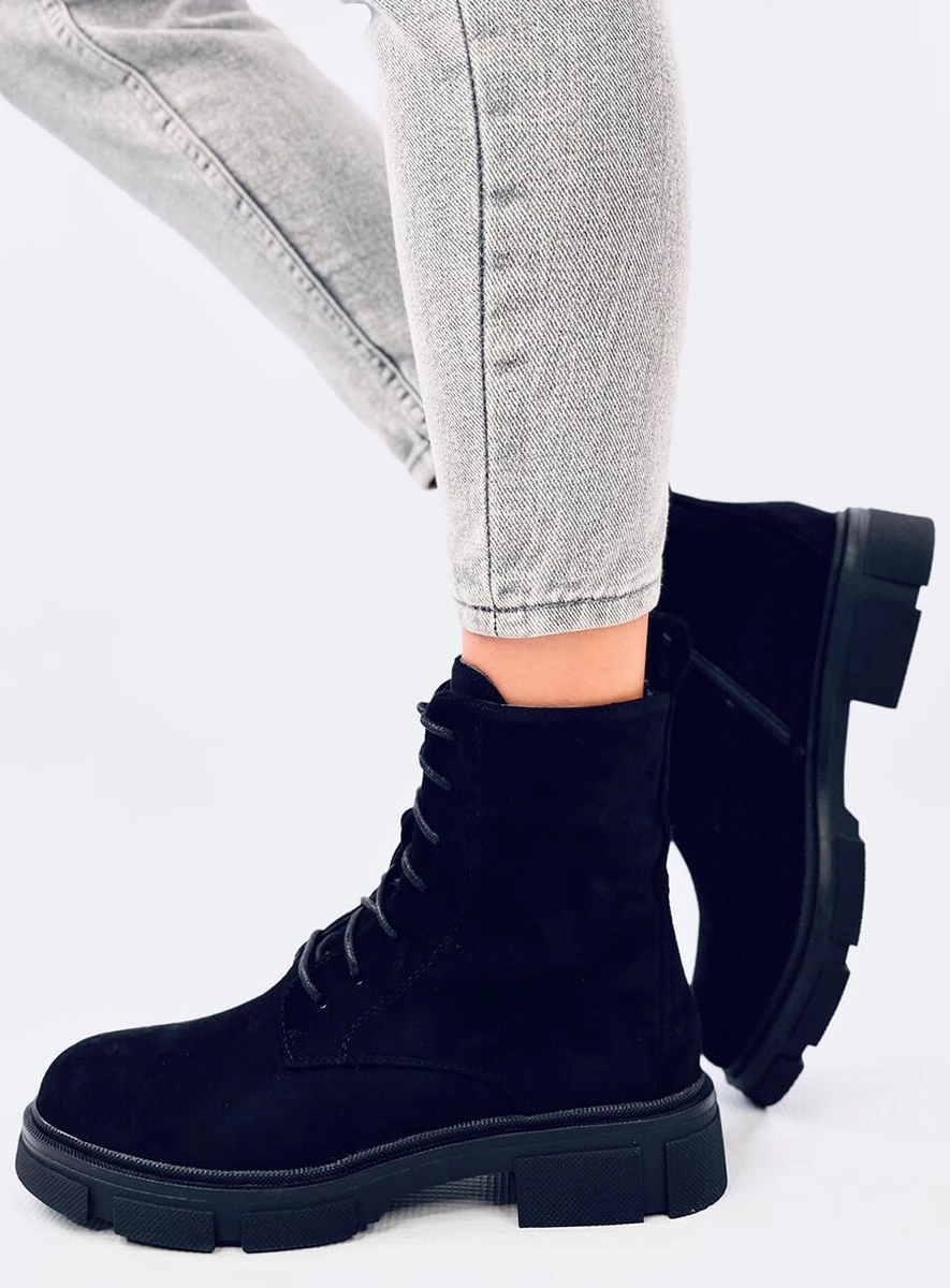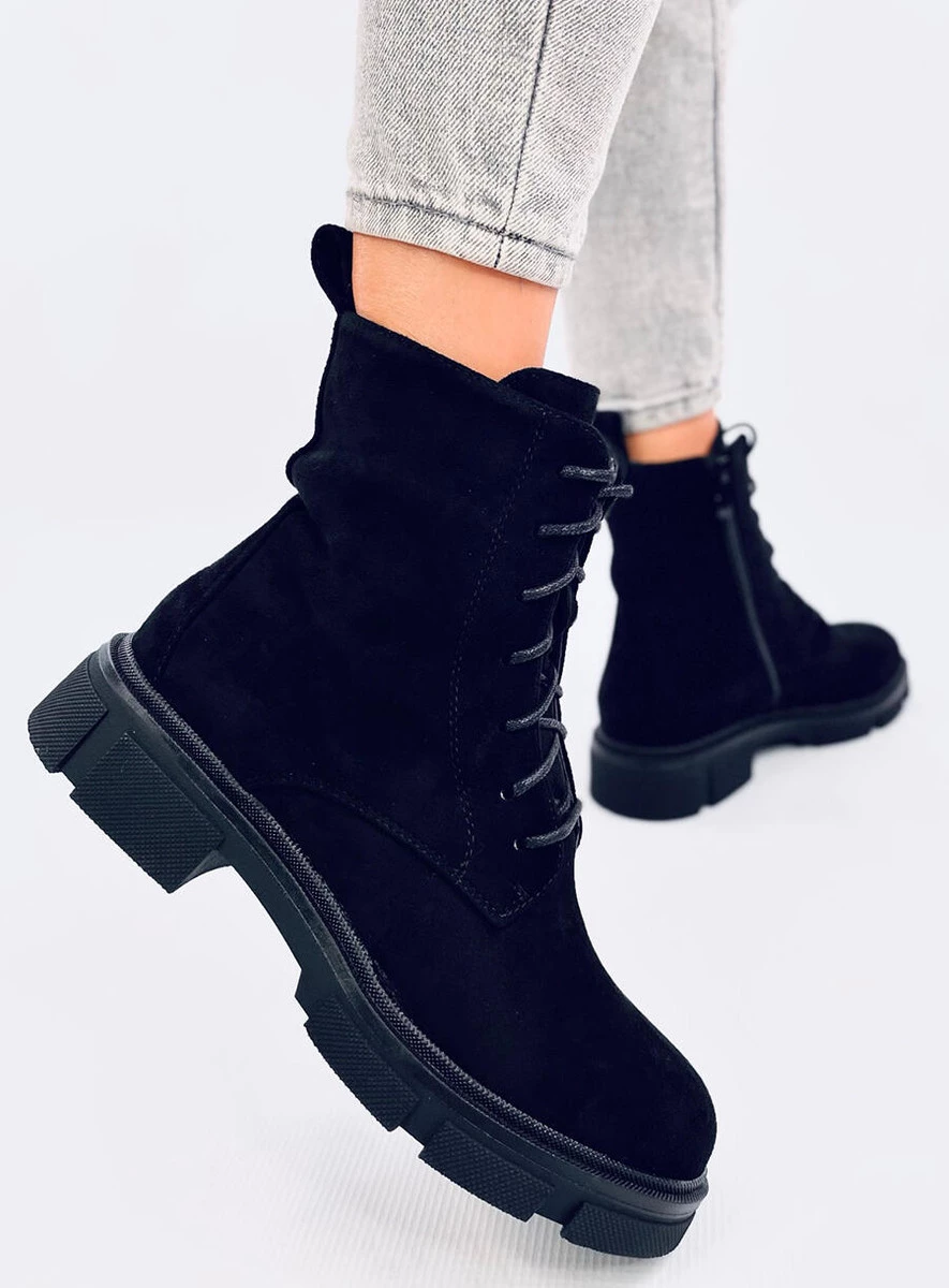 Sznurowane botki damskie - workery na grubej podeszwie. Praktyczne zapięcie na zamek błyskawiczny z boku cholewki zapewnia komfortowe zakładanie, a dzięki klasycznemu sznurowaniu można buty idealnie dopasować do stopy. Workery to pozycja obowiązkowa w każdej kobiecej garderobie : ) Wykonane są z zamszu ekologicznego, a wnętrze wyścielone jest delikatnym futerkiem.