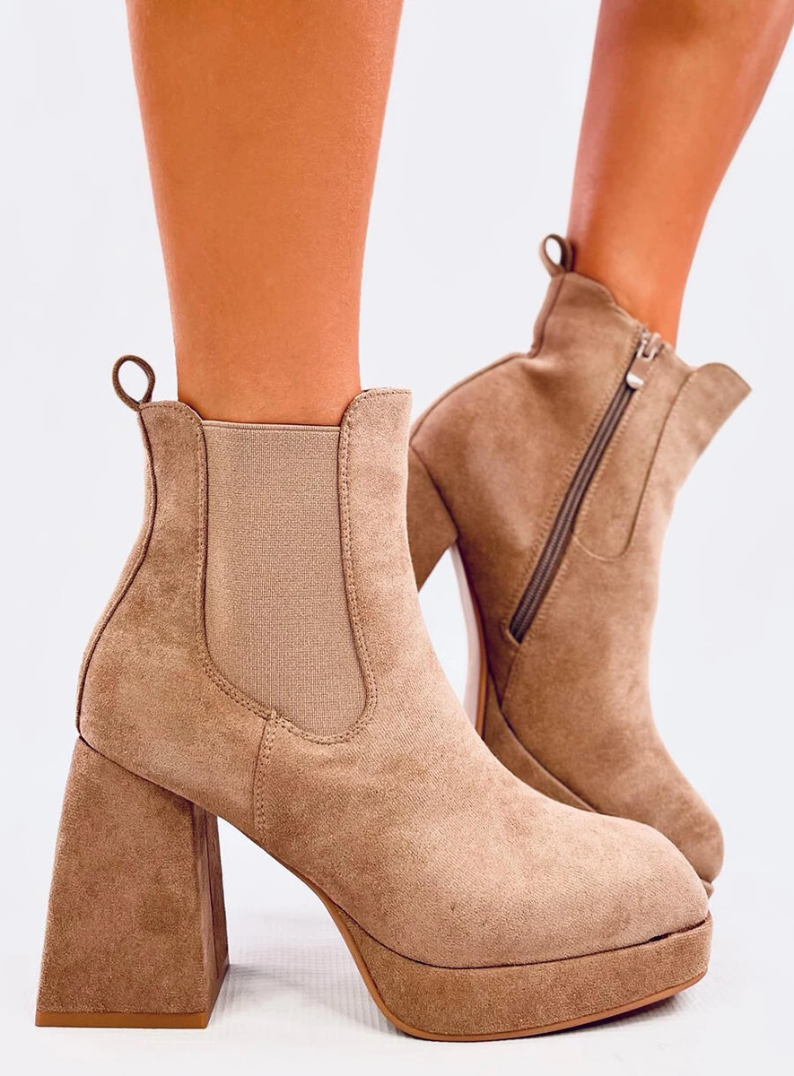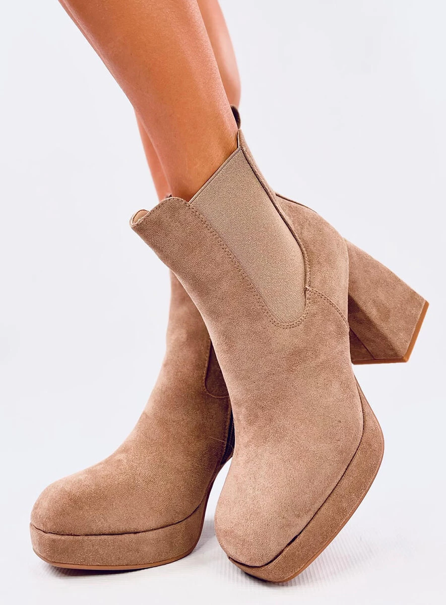 Botki damskie - sztyblety na platformie. Ten model butów to doskonała propozycja dla miłośniczek mody. Oryginalny, szeroki obcas o wysokości 9 cm wydłuża nogi i jest bardzo wygodny. To absolutny hit! Cholewka urozmaicona jest elastyczną wstawką, która nawiązuje do sztybletów. Dodatkowo posiadają zapięcie na suwak ułatwiające zakładanie. Wykonane są z zamszu ekologicznego, na piankowym podszyciu.