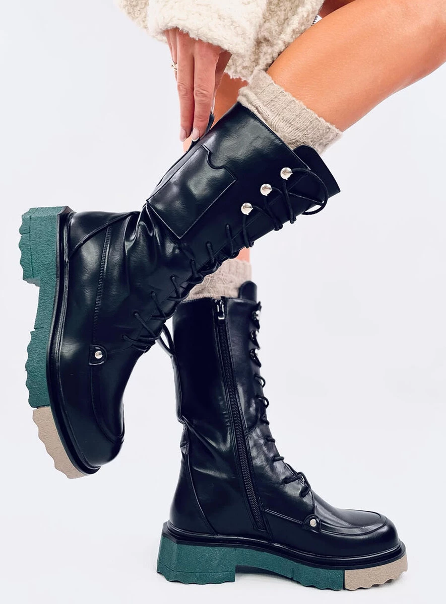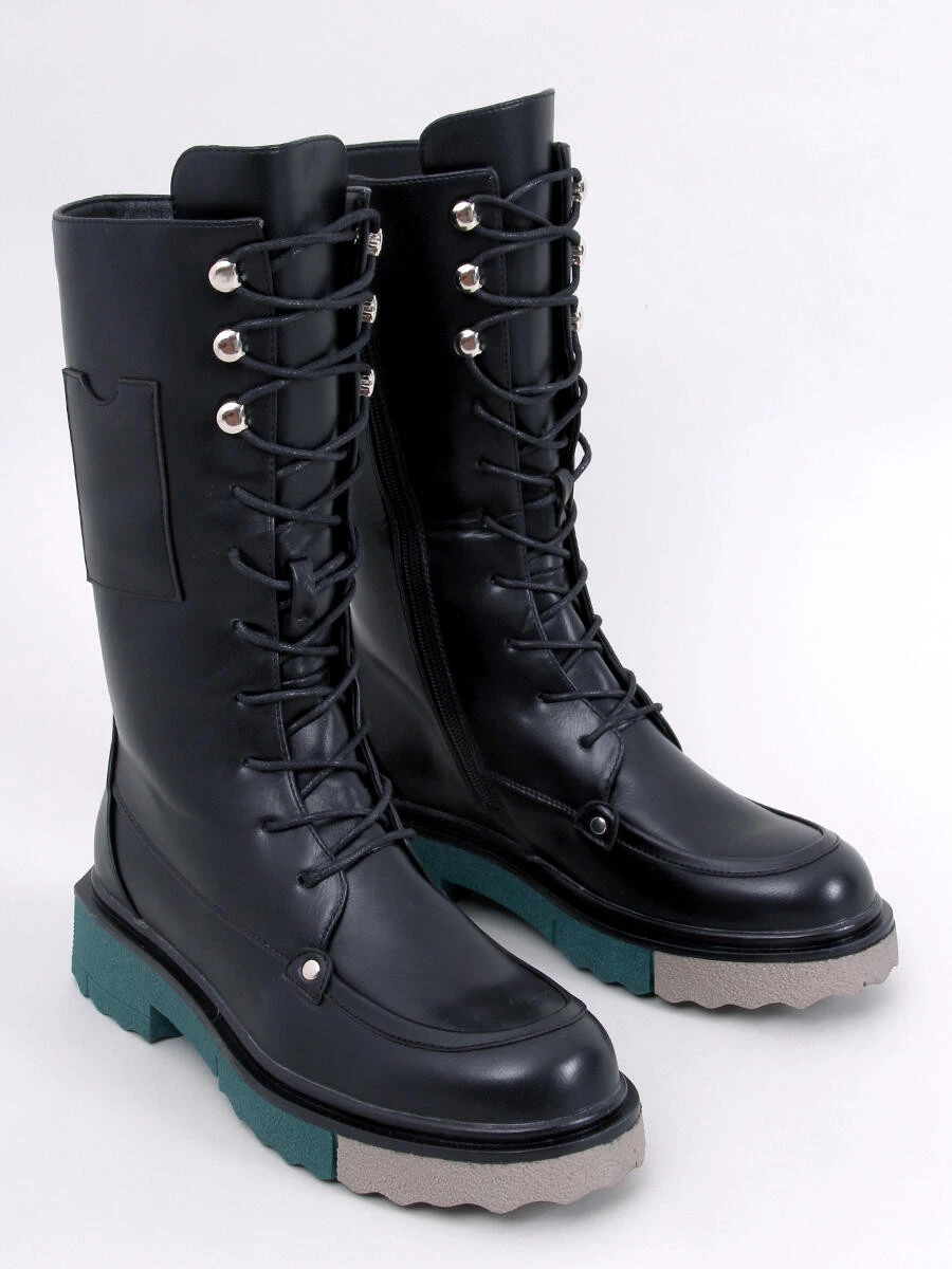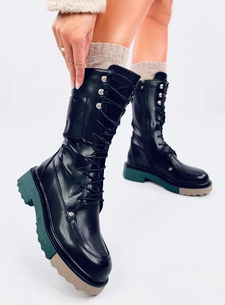 Kozaki damskie - oficerki na kolorowej podeszwie. Mają prosty fason z niższą cholewką, która została urozmaicona zakładką. Jeśli jesteś fanką nietuzinkowych połączeń to musisz je mieć : ) Komfort zakładania zapewnia zapięcie na suwak z boku cholewki. Wykonane są ze skóry ekologicznej, na piankowym podszyciu.