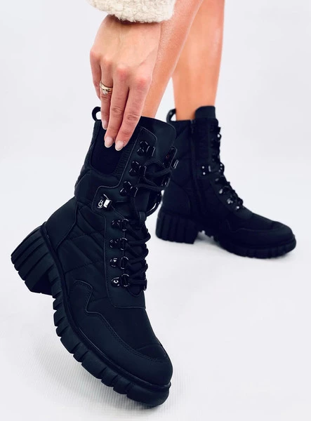 Sznurowane botki damskie na szerokim obcasie o wysokości 5,5 cm. Ten model wyróżnia modny fason z efektownym pikowaniem, wykonanym z tkaniny ortalionowej. Oprócz sznurowania jak w butach trekkingowych mają również zapięcie na suwak oraz charakterystyczną dla sztybletów gumową wstawkę. Zamów a nie pożałujesz : ) Wnętrze butów wyścielone jest delikatnym futerkiem. Materiał zewnętrzny - skóra ekologiczna + tkanina ortalionowa.