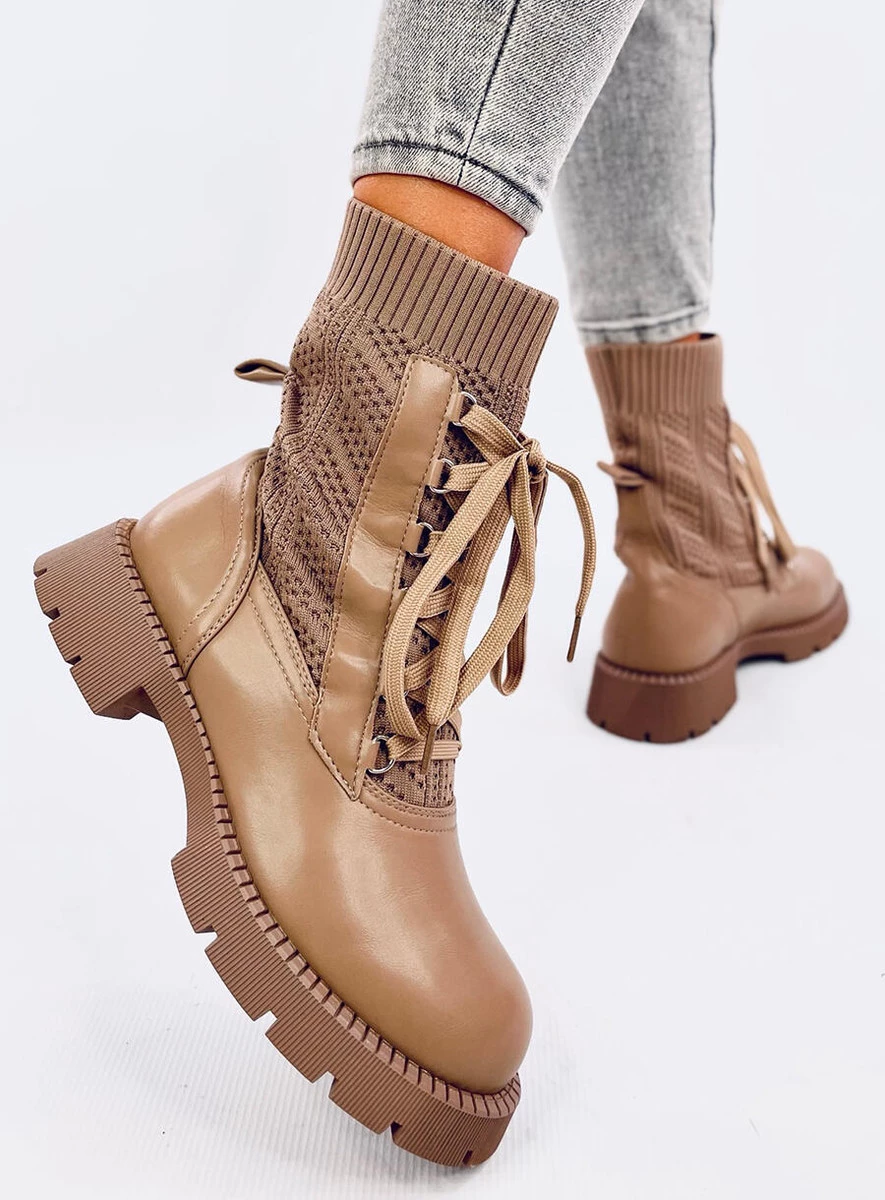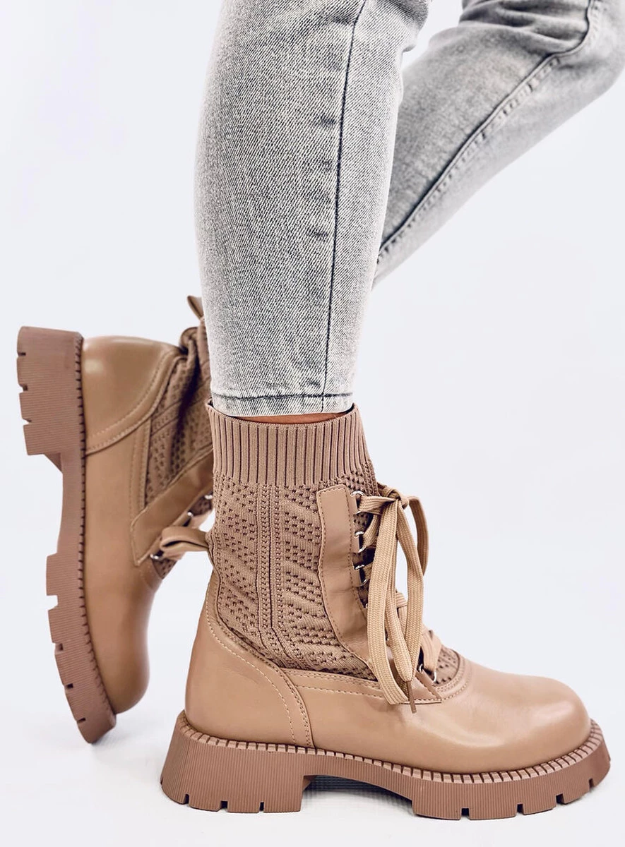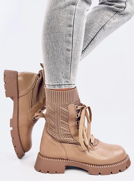 Skarpetkowe botki damskie na płaskiej podeszwie. Mają oryginalny design z elastyczną, sweterkową cholewką i z ozdobnym sznurowaniem z przodu. To idealne buty na co dzień - nie czekaj i zamów je już dziś! Materiał zewnętrzny - skóra ekologiczna + tkanina.