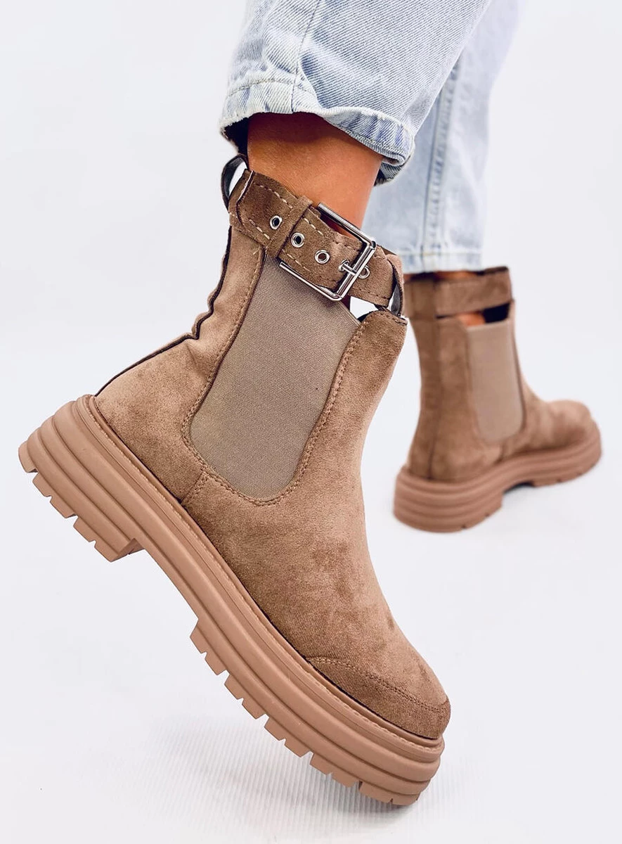 Zamszowe botki damskie - sztyblety na grubej podeszwie. Pasek z klamerką (odpinany) urozmaica design tego modelu. Jeśli jesteś gotowa na odrobinę szaleństwa to zamów je już dziś : ) Botki posiadają gumowe wstawki, które zapewniają komfortowe zakładanie. Wnętrze butów wyścielone jest delikatnym futerkiem. Materiał zewnętrzny - zamsz ekologiczny.