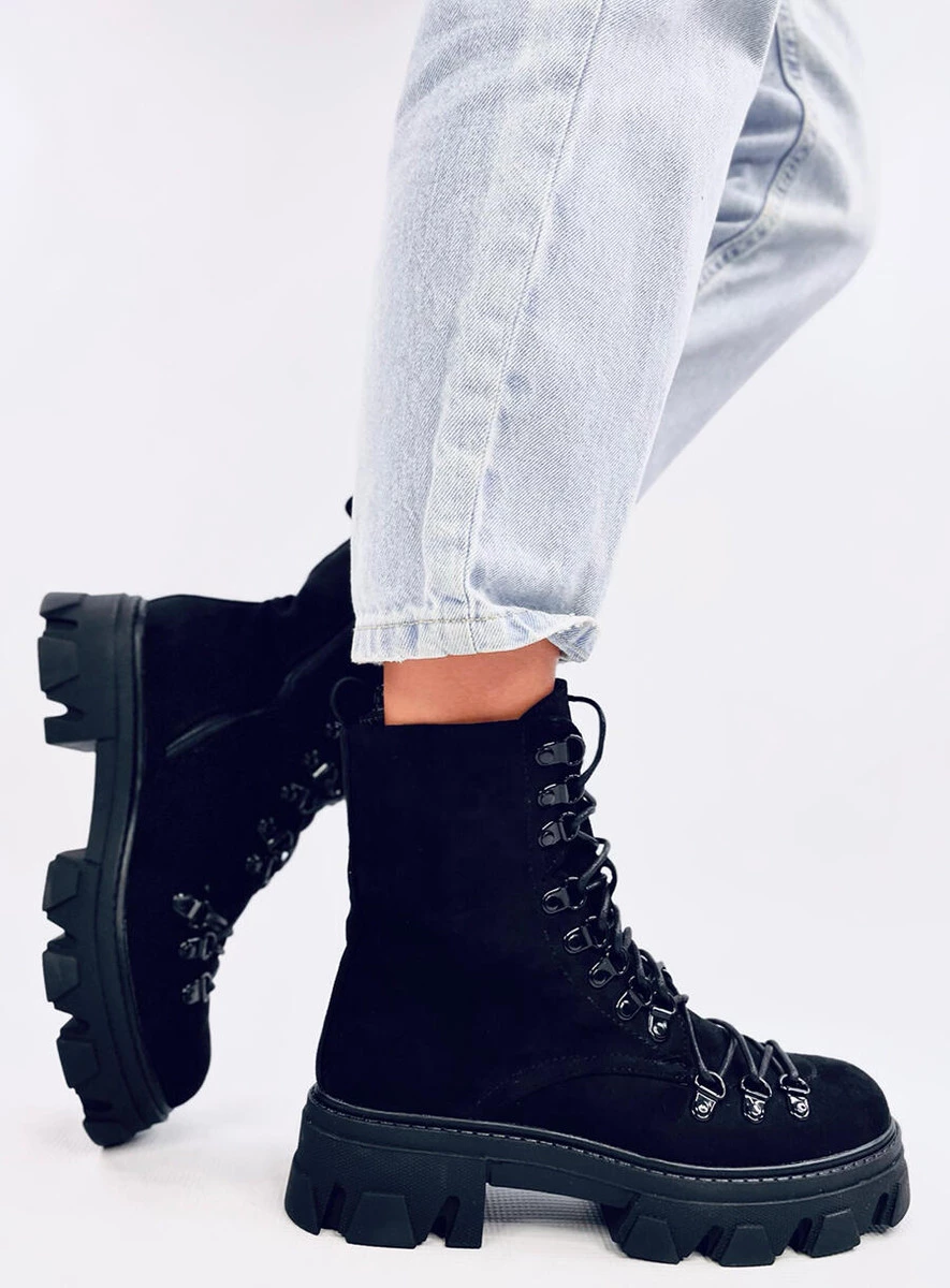 Zamszowe botki damskie - workery. Najmodniejszy fason na grubej podeszwie i z oryginalnym sznurowaniem przyciągnie wszystkie spojrzenia! To pozycja obowiązkowa w tym sezonie : ) Praktyczne zapięcie na zamek błyskawiczny ułatwi zakładanie na co dzień. Wykonane są z zamszu ekologicznego, a wnętrze wyścielone jest milutkim w dotyku delikatnym futerkiem.