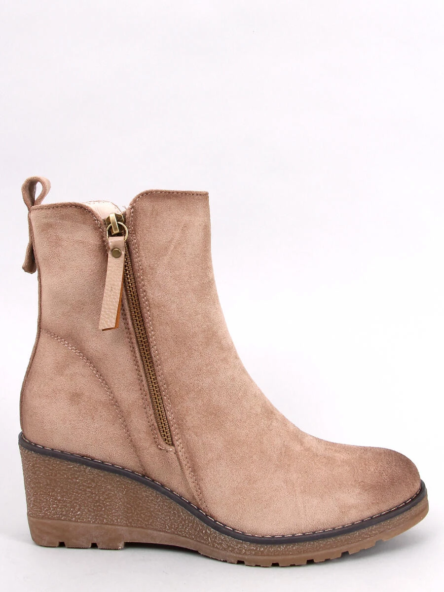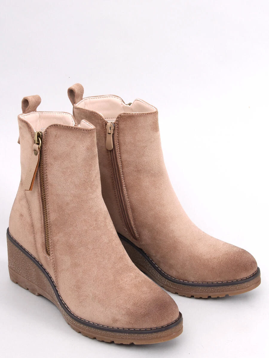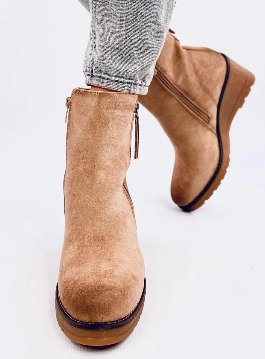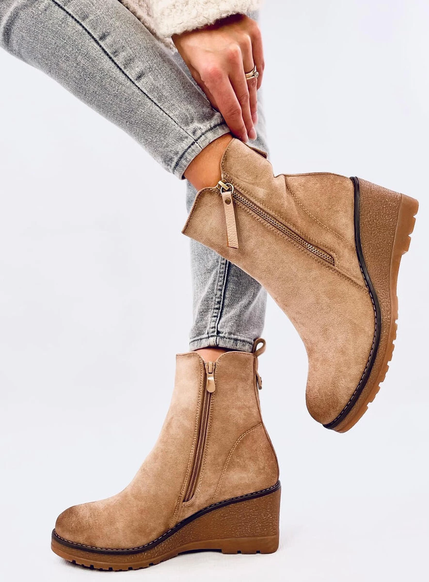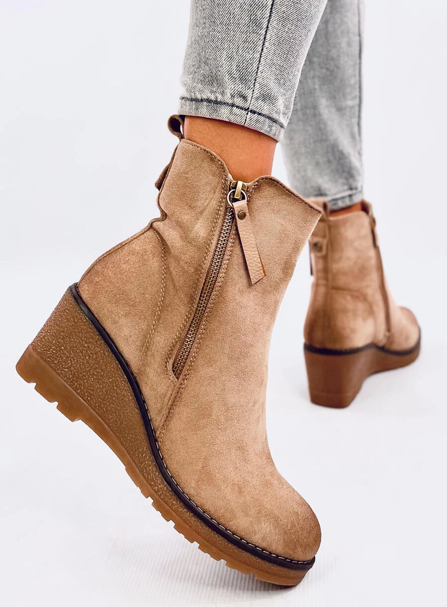 Zamszowe botki damskie na kauczukowym koturnie o wysokości 7 cm. Mają klasyczny fason z ozdobnym suwakiem z boku cholewki. Dodatkowym ich atutem jest praktyczne zapięcie na zamek błyskawiczny, które ułatwia zakładanie. To doskonałe buty na co dzień : ) Wnętrze butów wyścielone jest delikatnym futerkiem. Materiał zewnętrzny – zamsz ekologiczny.