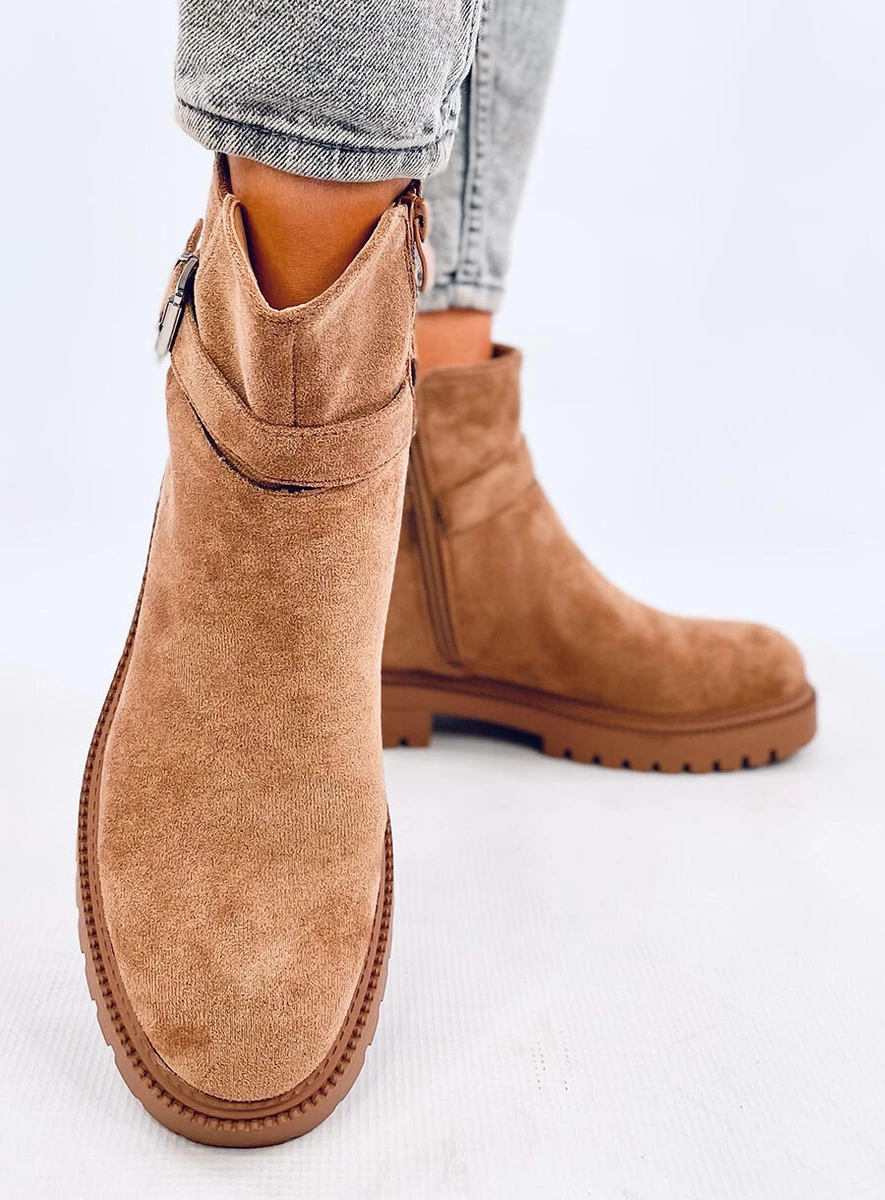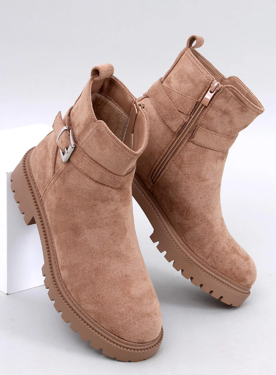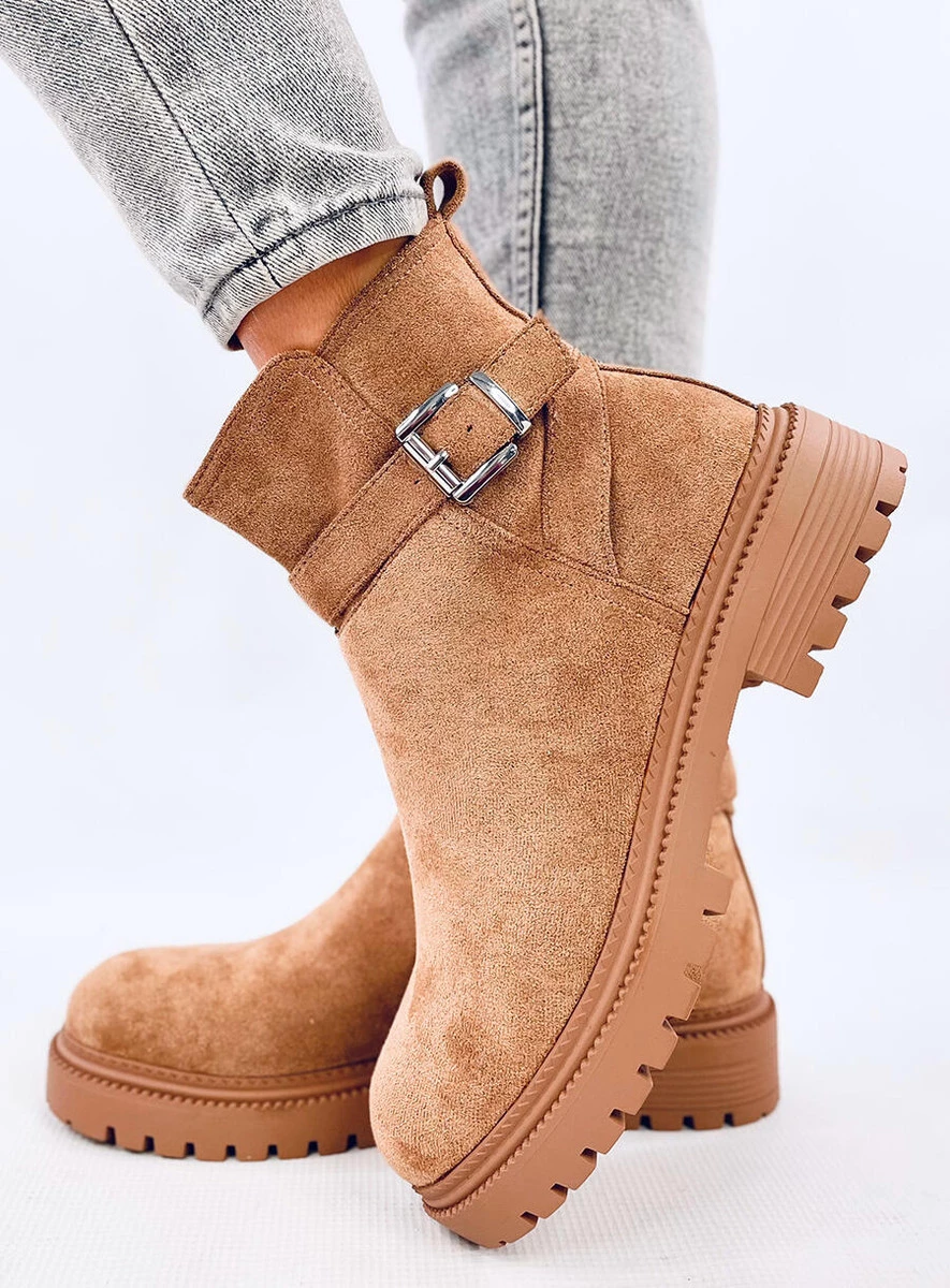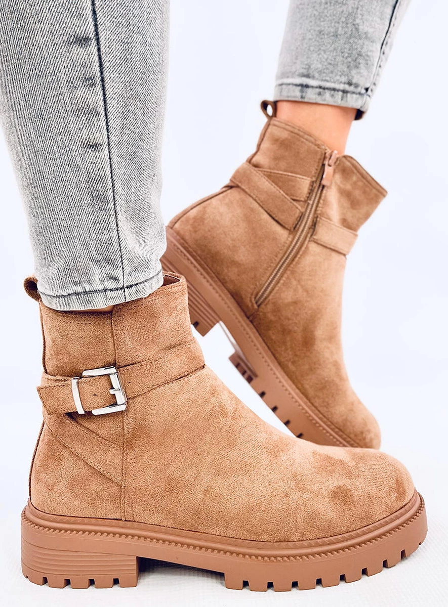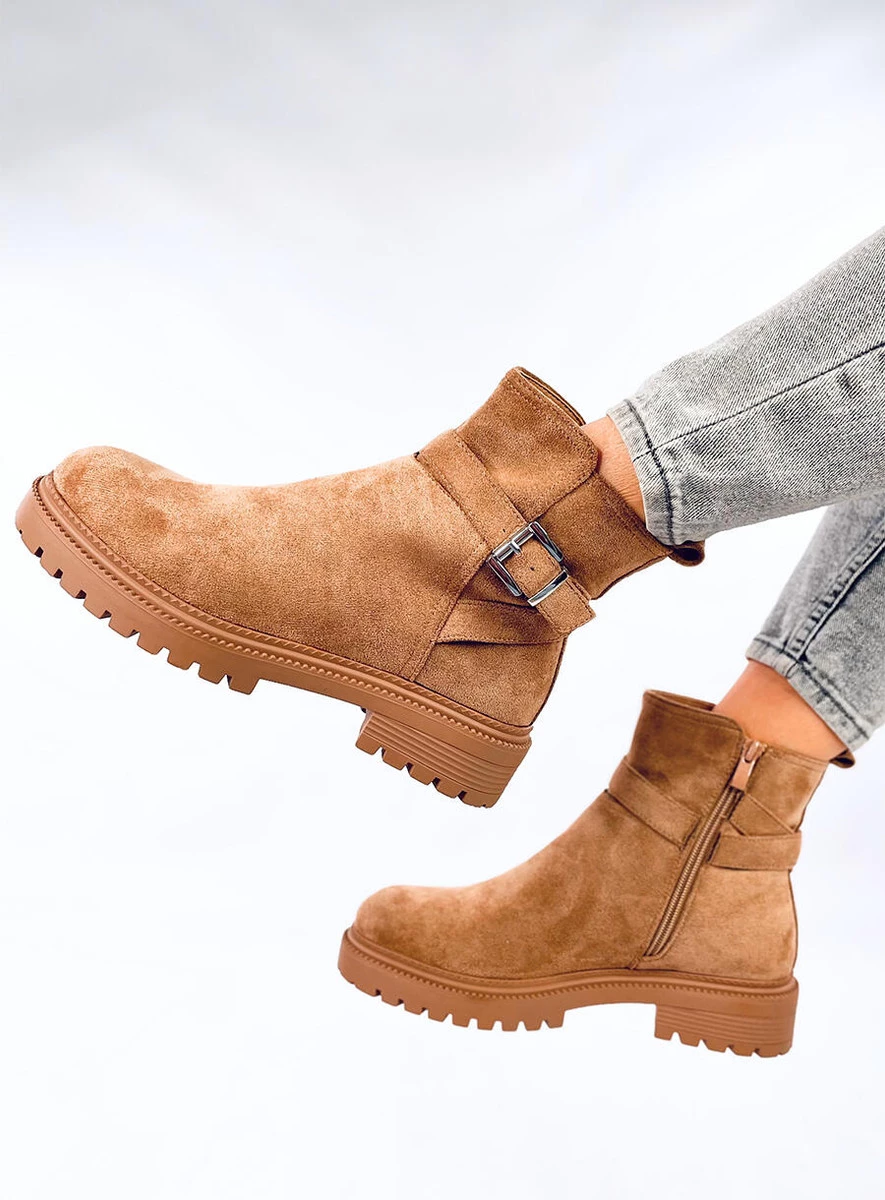 Zamszowe botki - sztyblety na protektorze. Mają ponadczasowy fason z zaokrąglonymi noskami oraz praktycznym zapięciem na suwak. Delikatna klamerka urozmaica cholewkę i nadaje im wyjątkowego stylu. Wykonane są z zamszu ekologicznego, a wnętrze wyścielone jest delikatnym futerkiem.