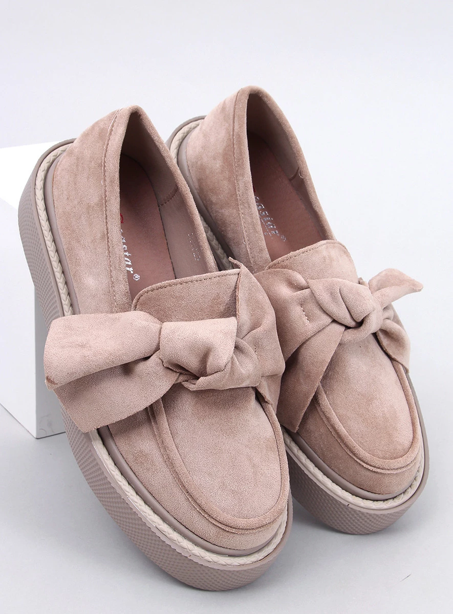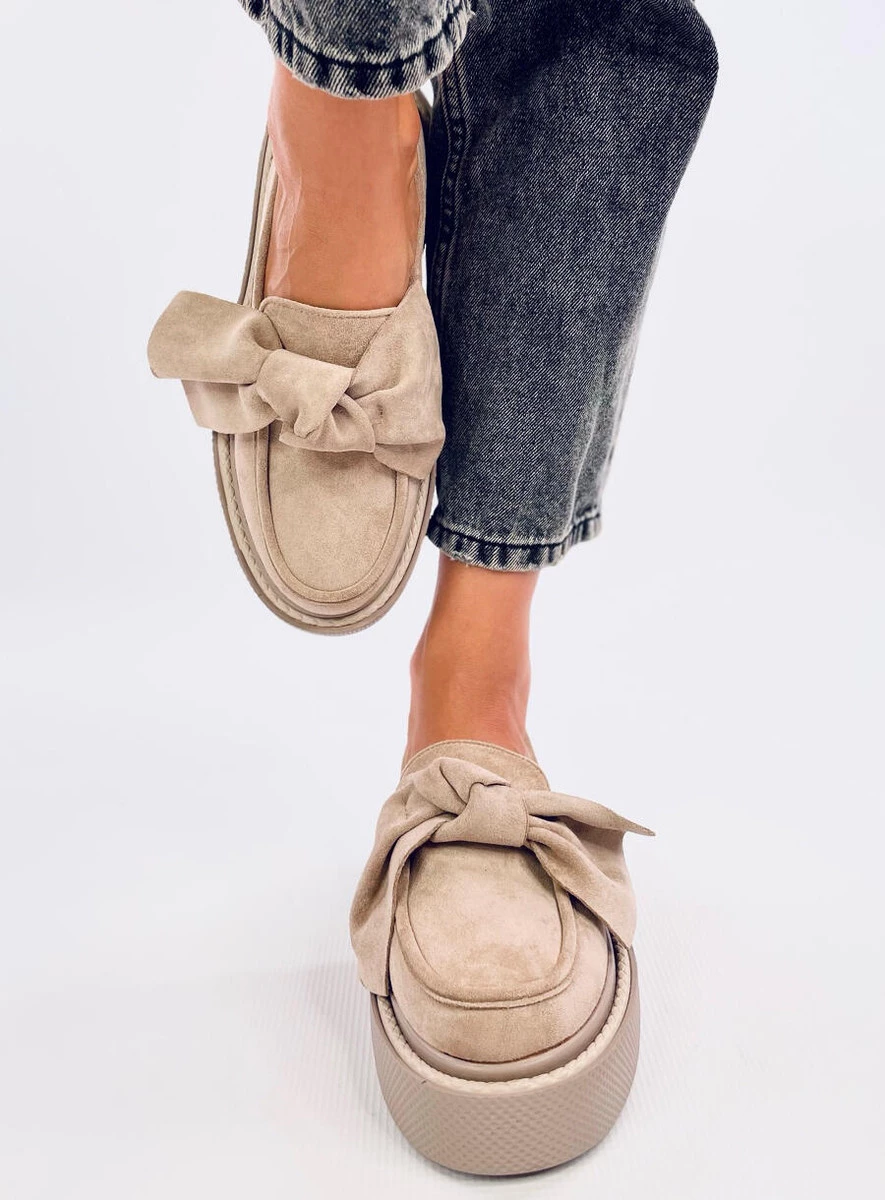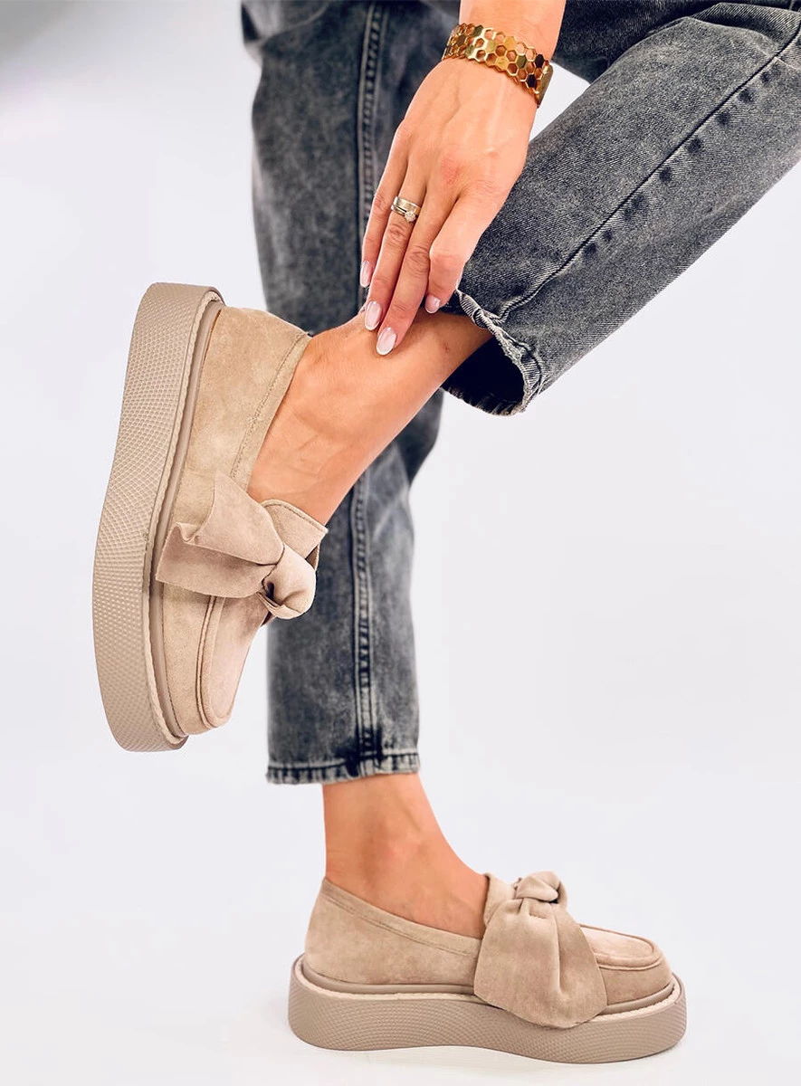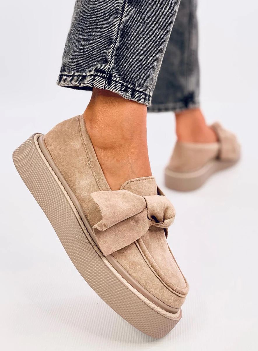 Mokasyny na platformie na dobre zagościły w aktualnych trendach . Ten model idealnie wpisuje się w jesienny kanon mody. Mimo wysokiej podeszwy, buty dobrze trzymają się stopy. Na przodzie wyjątkowa kokarda, przykuwająca wzrok. Mokasyny wykonane są z mięsistego zamszu ekologicznego, łatwego w utrzymaniu czystości.