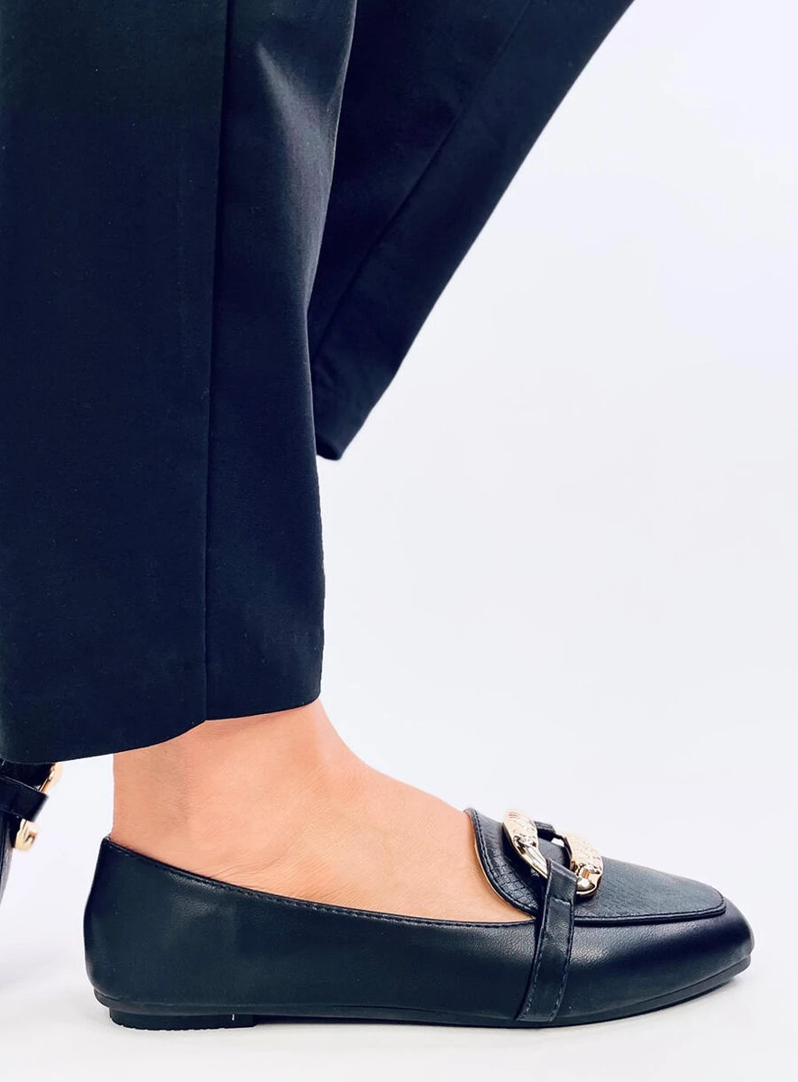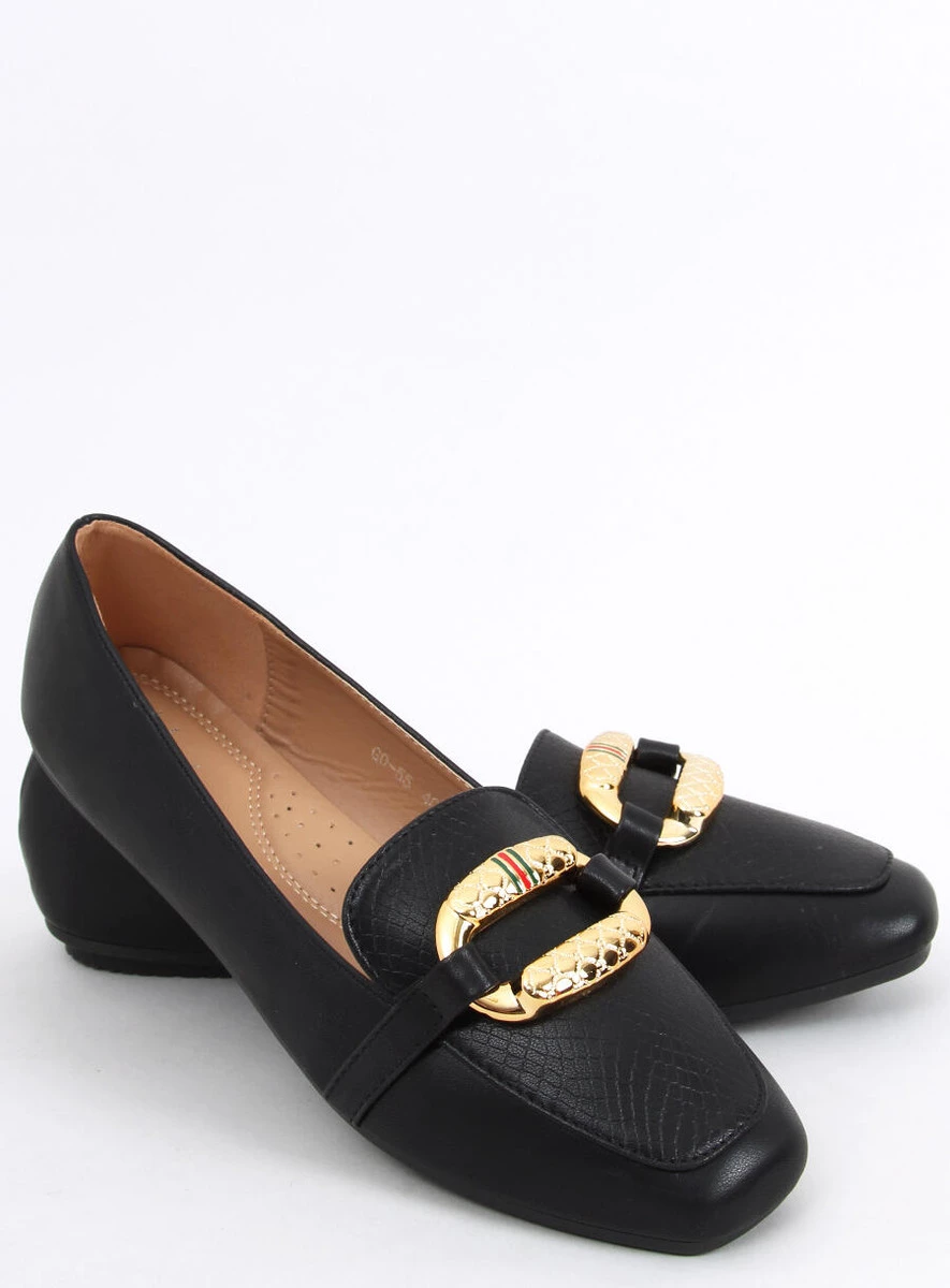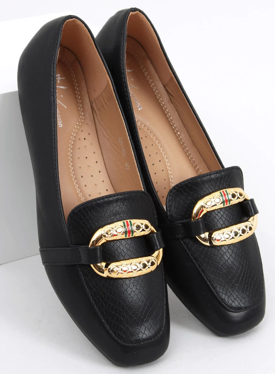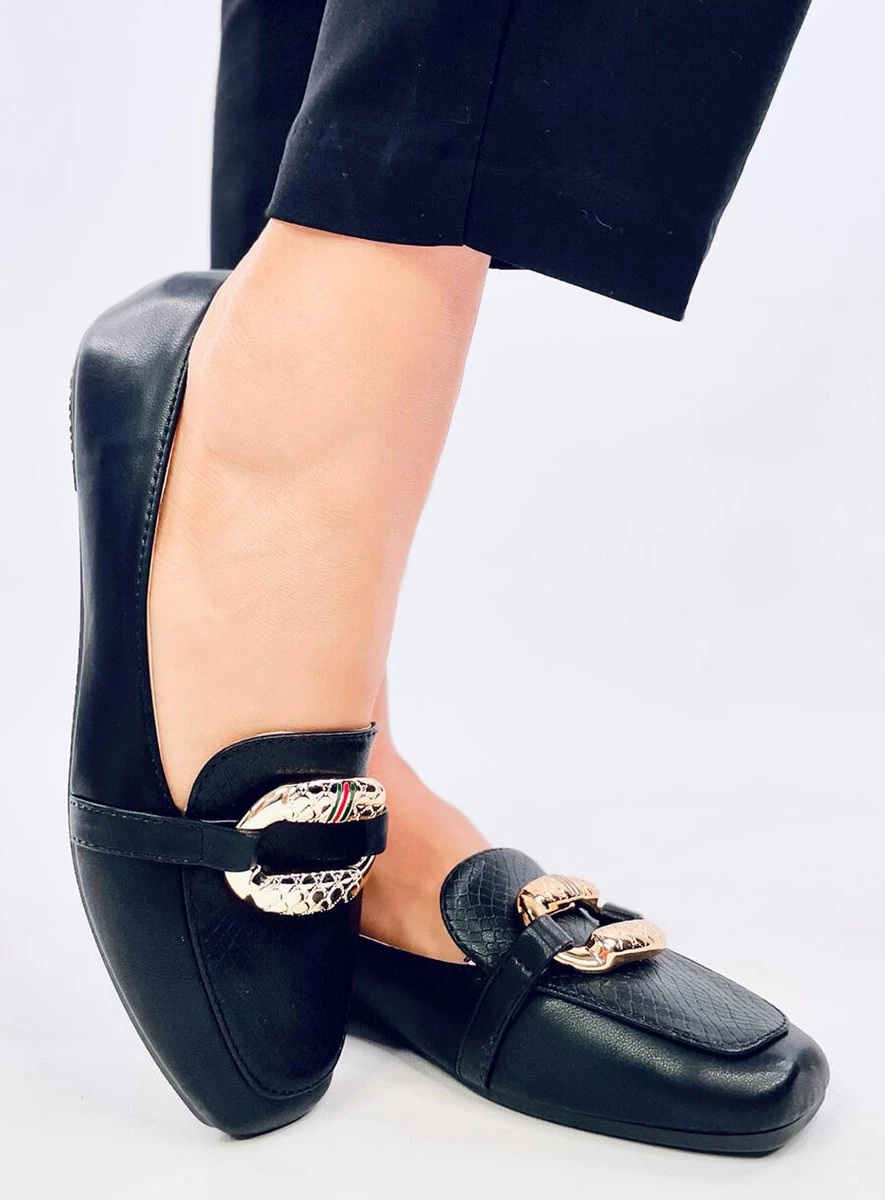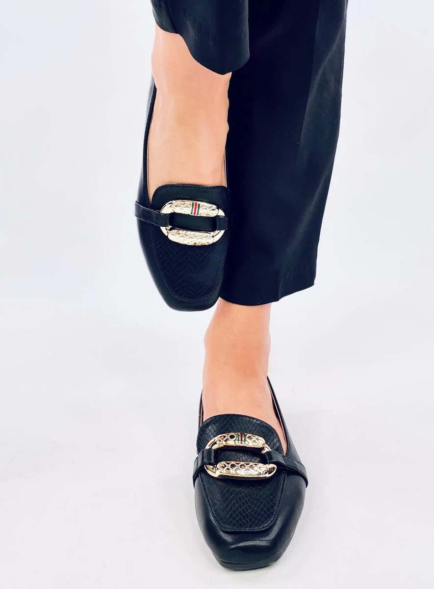 Szykowne mokasyny damskie. Uwagę zwraca najmodniejszy fason z kwadratowymi noskami i efektowną klamrą oraz wstawka z tłoczonej skóry. Pięknie prezentują się na nodze, a przy tym są niesamowicie wygodne - mają mięciutką wkładkę z poduszeczką. To pozycja obowiązkowa dla każdej eleganckiej kobiety : ) Materiał zewnętrzny – skóra ekologiczna.