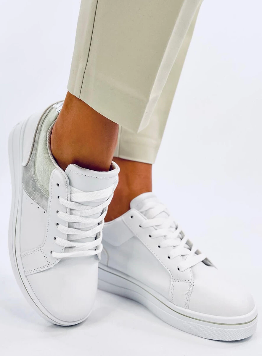 Dwukolorowe buty sportowe - sneakersy damskie na koturnie o wysokości 7 cm. Kontrastujące wstawki - zamszowe i metaliczne sprawią, że nie przejdziesz obok nich obojętnie : ) Dodatkowo będziesz cieszyła się wygodą na każdym kroku! Wnętrze butów wyścielone jest tkaniną. Materiał zewnętrzny - skóra ekologiczna + zamsz ekologiczny.