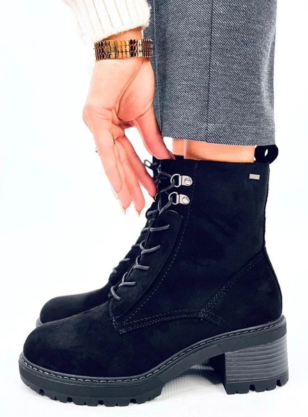 Zamszowe botki damskie na wygodnym obcasie o wysokości 5,5 cm i protektorze. Model w całości tradycyjnie sznurowany, ale posiada również praktyczne zapięcie na suwak, które ułatwia zakładanie. Jeśli cenisz sobie wygodę i klasyczne fasony to musisz je mieć : ) Wykonane są z bardzo miłego w dotyku zamszu ekologicznego, który podkreśla ich wyjątkowy styl. Wnętrze natomiast jest wyścielone delikatnym futerkiem.