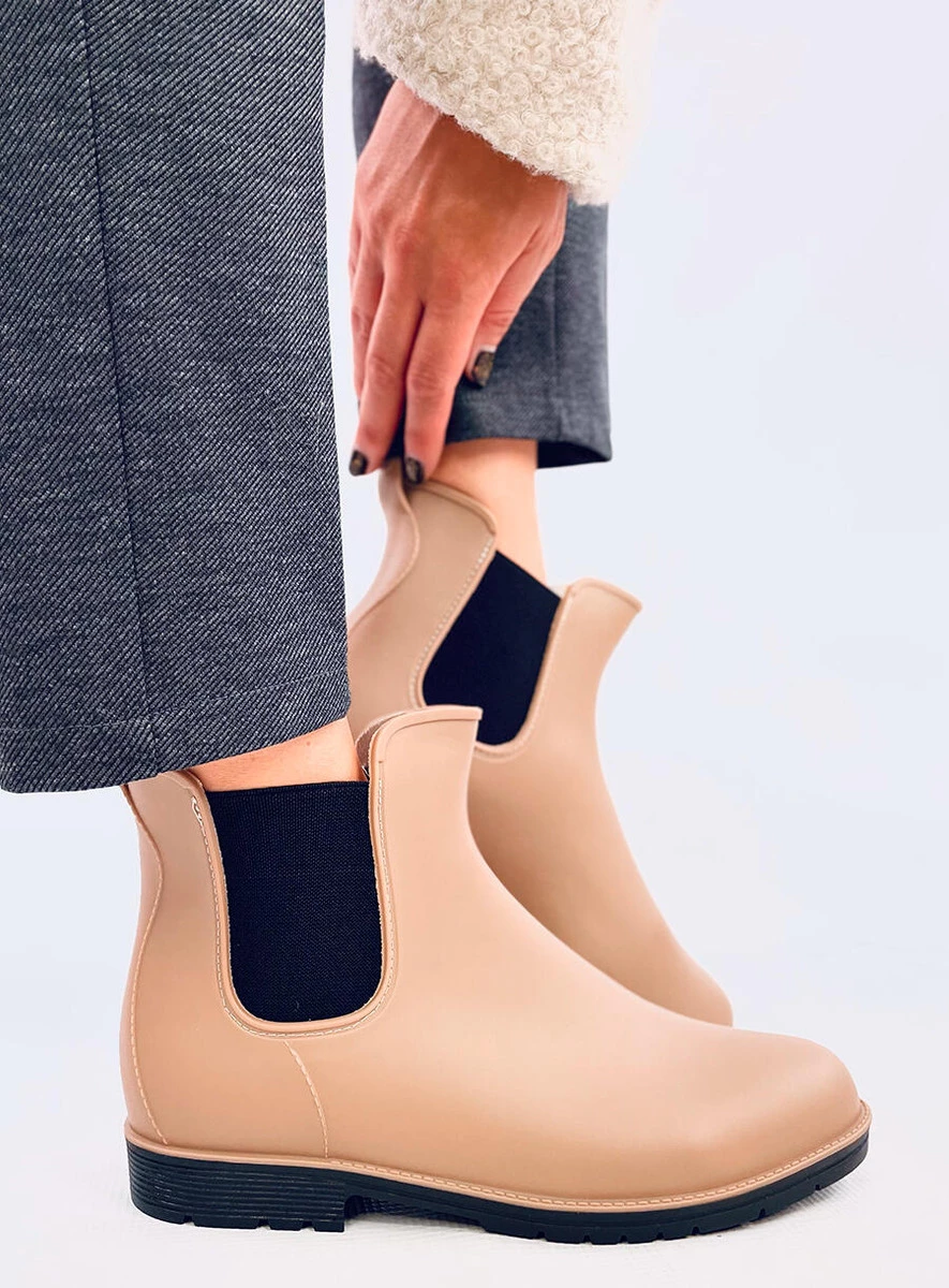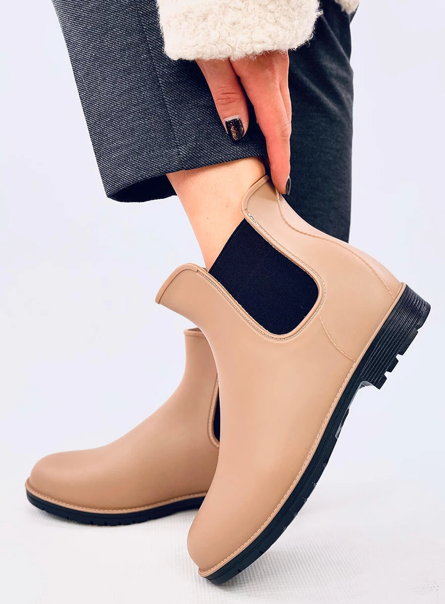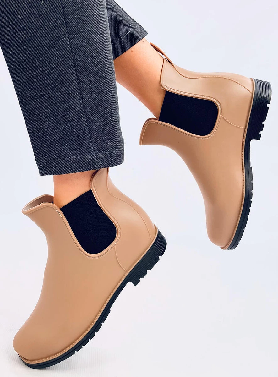 Kalosze damskie o kroju botków – sztybletów. Wykonane są z gumy w stylowym, matowym wykończeniu. Wyglądają jak klasyczne botki i gwarantują nieprzemakalność. Mają elastyczną gumową wstawkę przy kostce w kontrastowym kolorze, która ułatwia zakładanie. Buty świetnie prezentują się na nodze, a przy tym są bardzo wygodne.