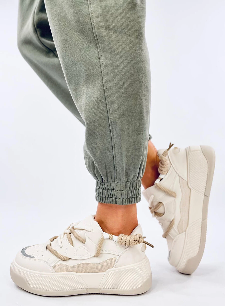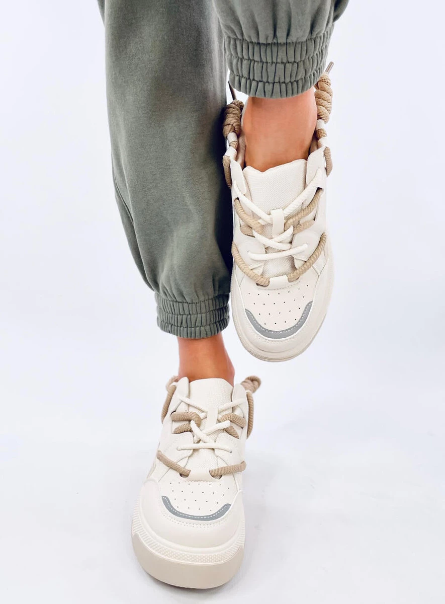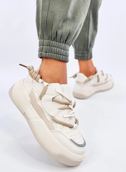 Sneakersy damskie na platformie. Ten model jest idealnym rozwiązaniem dla osób, które cenią sobie wygodę, a przy tym podążają za trendami modowymi. Oryginalny fason oraz designerskie, szerokie sznurówki przyciągają wzrok. Te buty mają charakter! Wnętrze butów wyścielone jest tkaniną. Materiał zewnętrzny – skóra ekologiczna + tkanina.