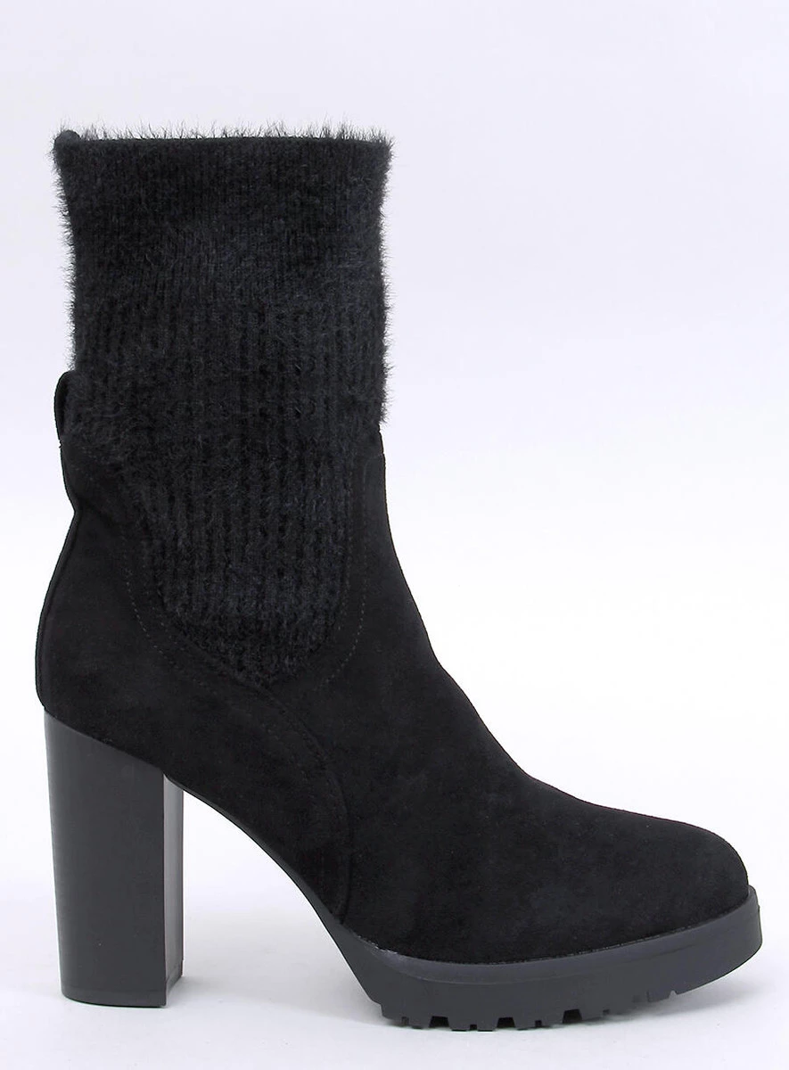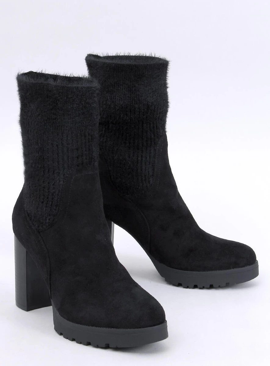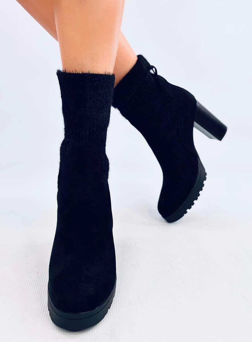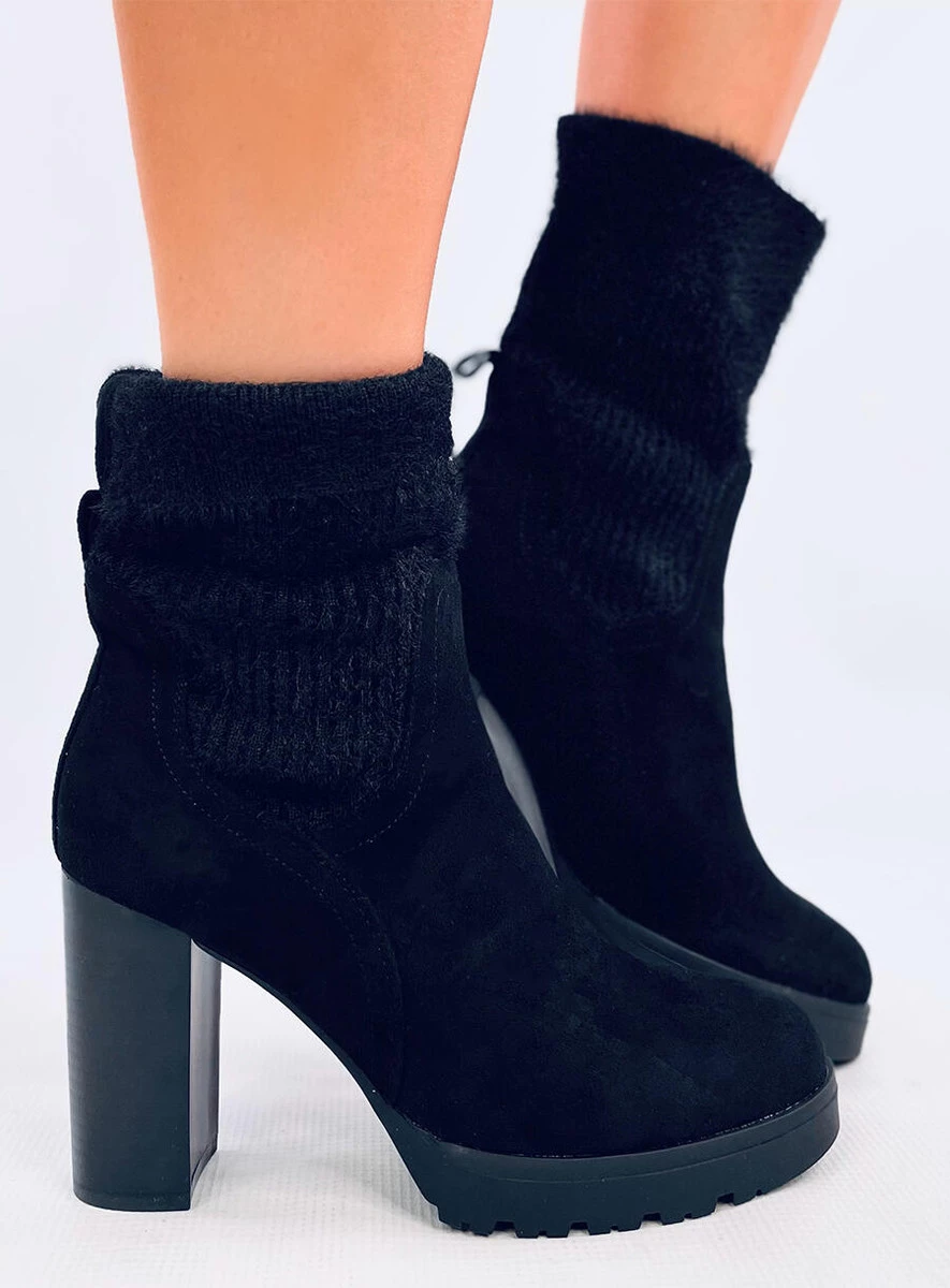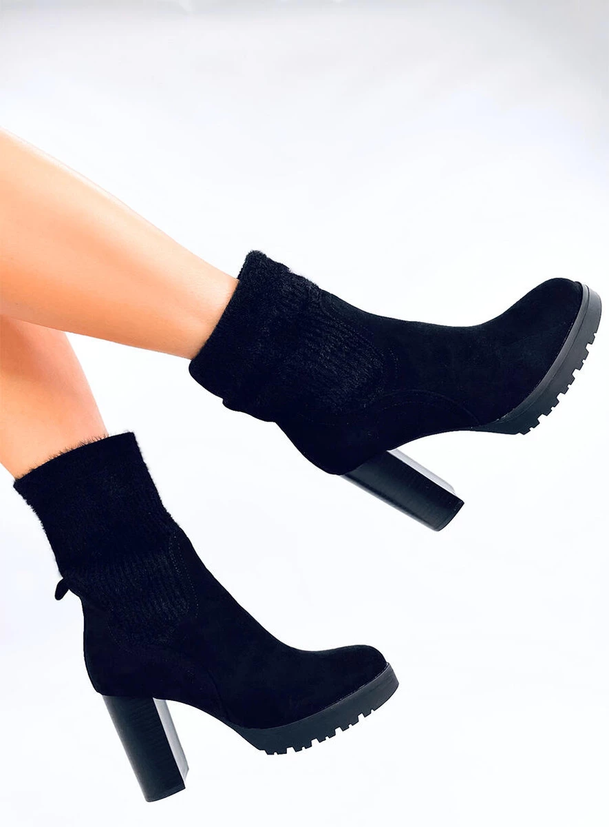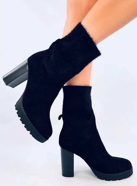 Zamszowe botki damskie na obcasie o wysokości 10 cm i platformie 2 cm. Model został urozmaicony elastycznym ściągaczem w dotyku przypominającym futerko, który też ułatwia zakładanie. Nie czekaj i zamów je już dziś! Materiał zewnętrzny – zamsz ekologiczny.