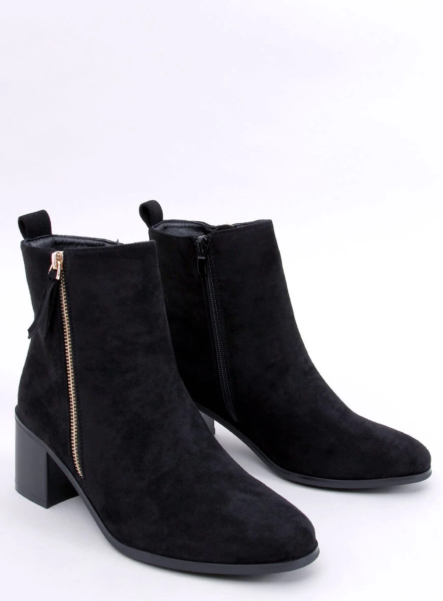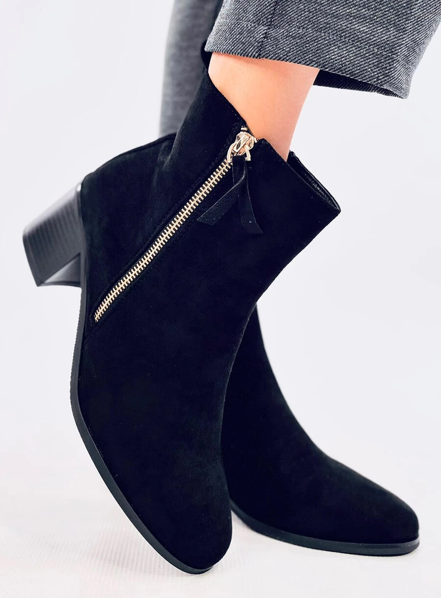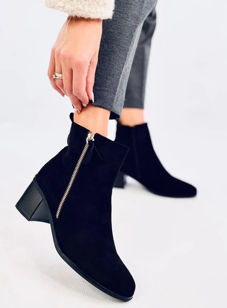 Zamszowe botki damskie ze złotym suwakiem. Model na stabilnym obcasie o wysokości 6 cm na pewno zachwyci wielbicielki wygody : ) Przekonaj się sama jak wyjątkowo poczujesz się w tych botkach! Ich niewątpliwa zaleta to praktyczne zapięcie na zamek błyskawiczny z boku cholewki. Wykonane są z zamszu ekologicznego, a wnętrze wyścielone jest delikatnym futerkiem.