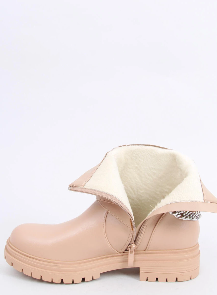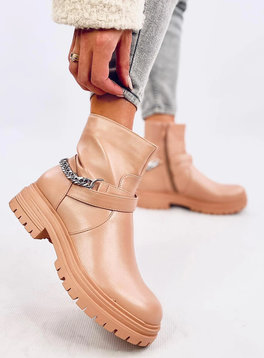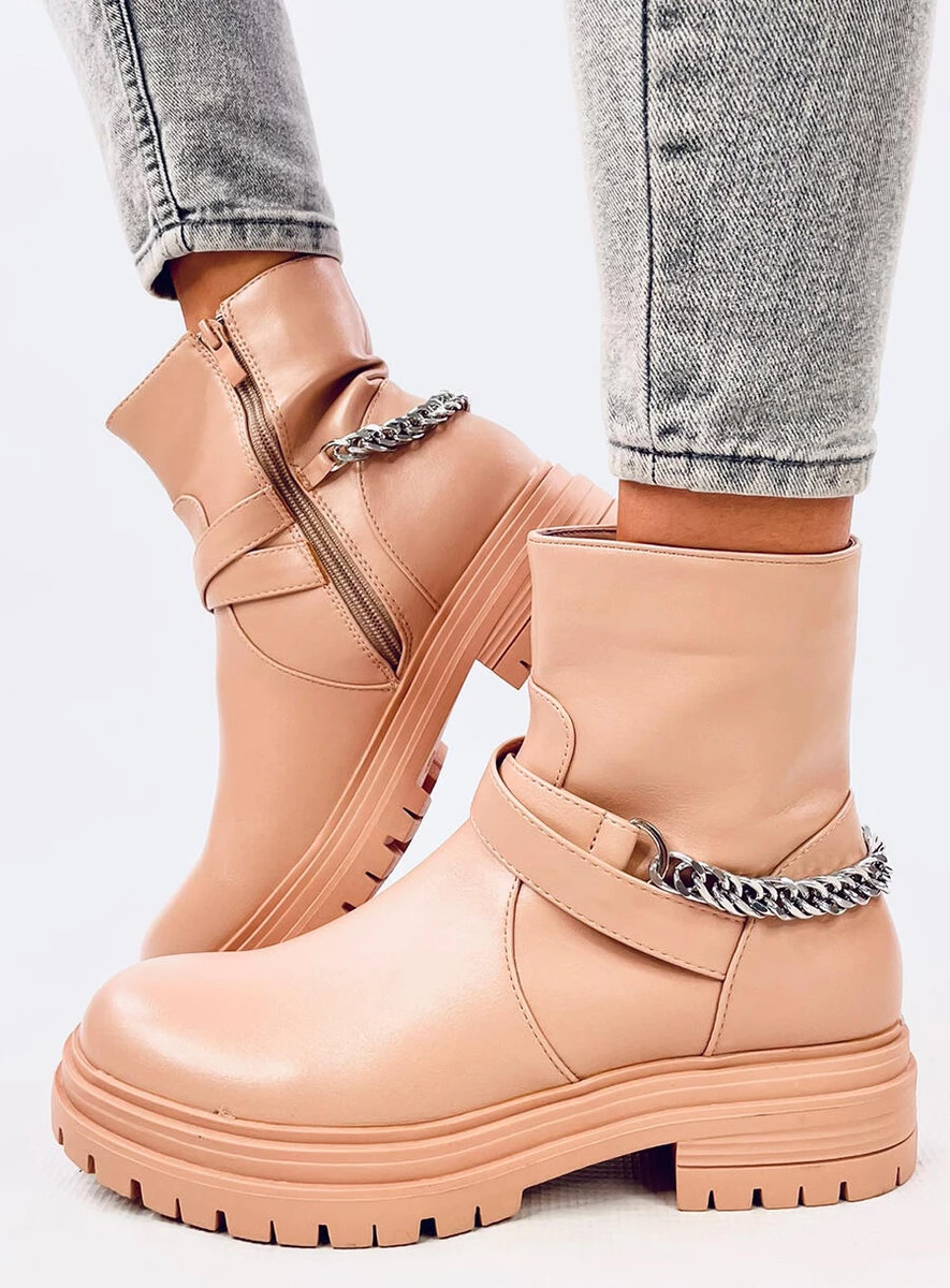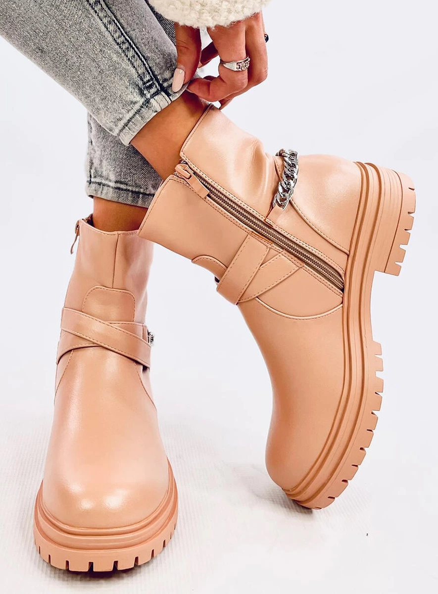 Botki damskie na protektorze. Ten wyjątkowy model z łańcuszkiem to nie tylko praktyczne rozwiązanie na jesienne chłody, ale w tym sezonie to także modowy must have! Wygodne zapięcie na suwak z boku cholewki zapewnia komfortowe zakładanie. Zamów je już dziś! Wykonane są ze skóry ekologicznej, a wnętrze wyścielone jest delikatnym futerkiem.