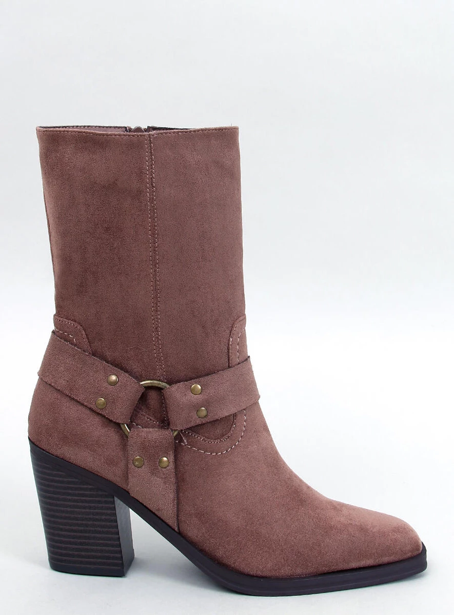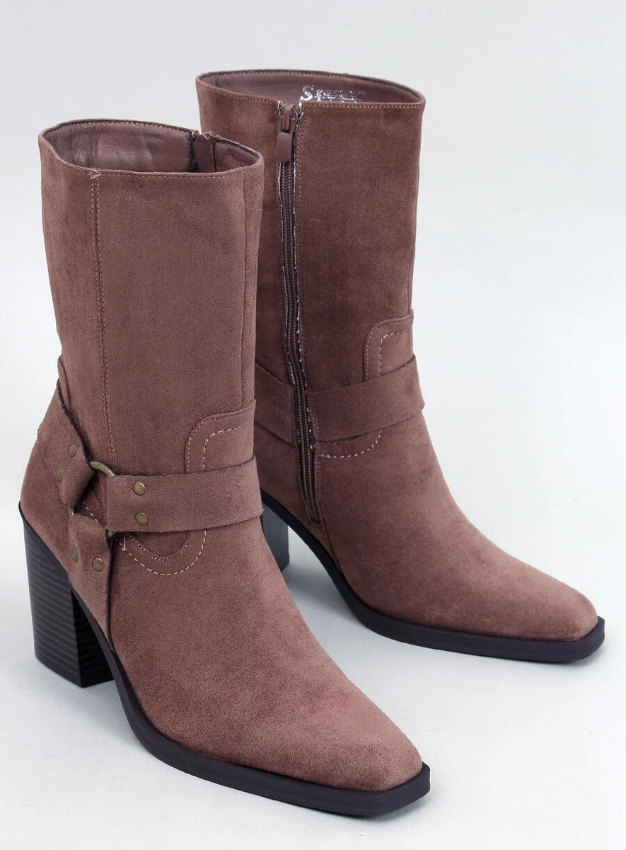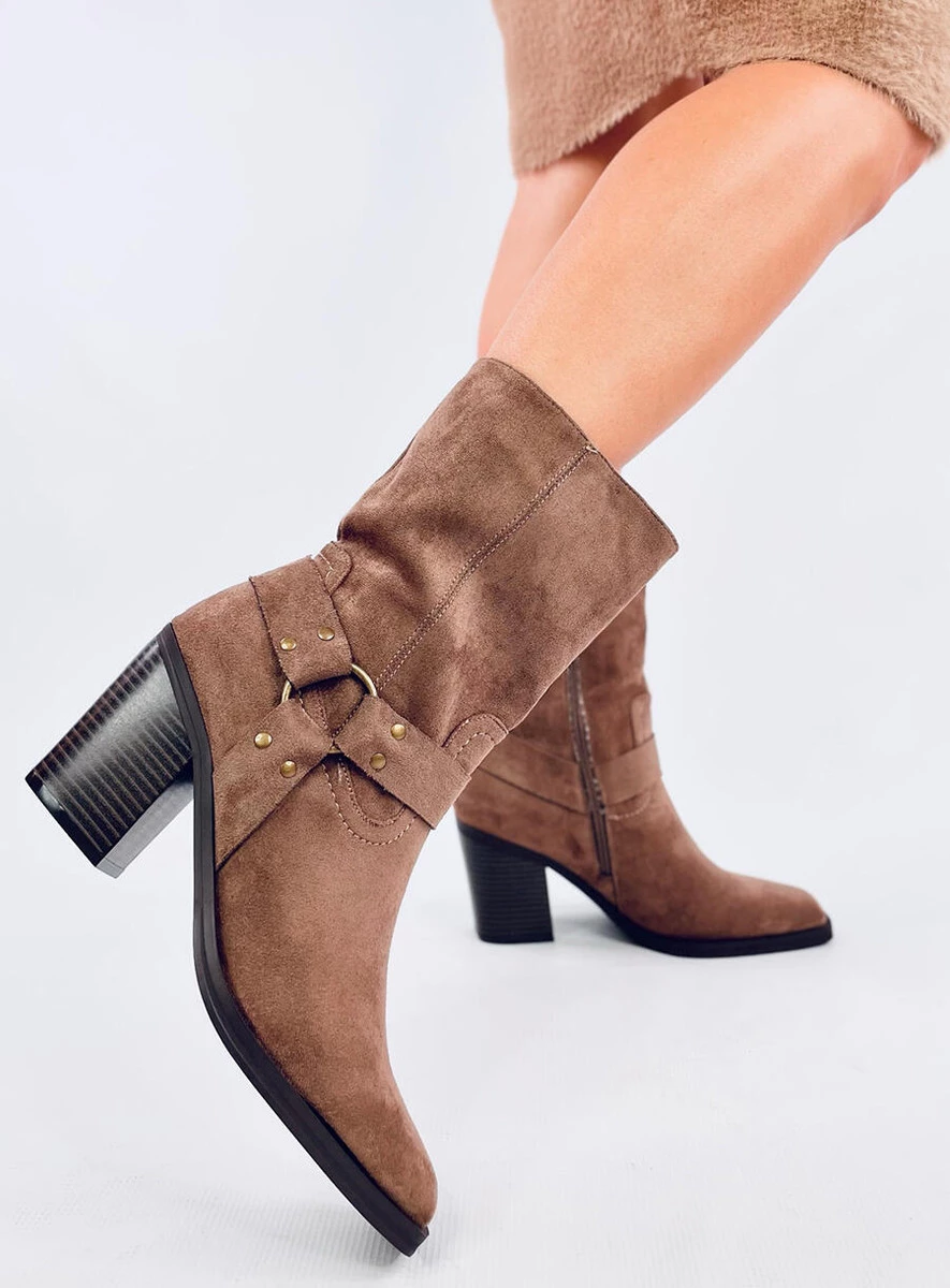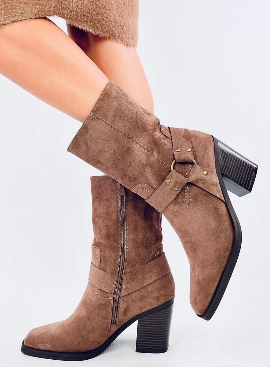 Zamszowe botki damskie – kowbojki z wysoką cholewką. Model ma nietuzinkowy fason z kwadratowymi noskami. Zapięcie na zamek z boku cholewki zapewnia komfortowe zakładanie. Wykonane są z zamszu ekologicznego, a wnętrze wyścielone jest delikatnym futerkiem.