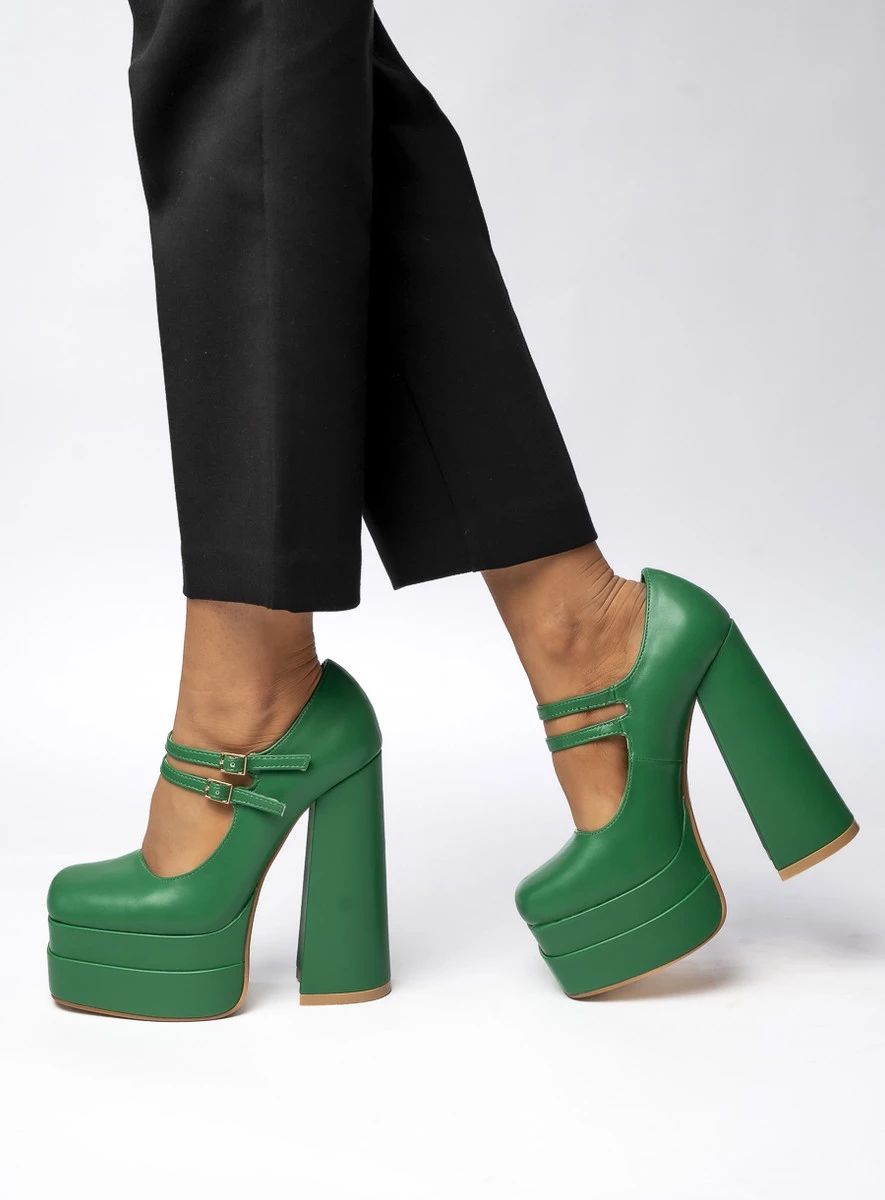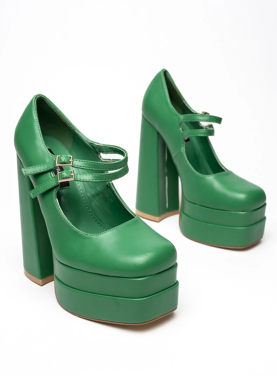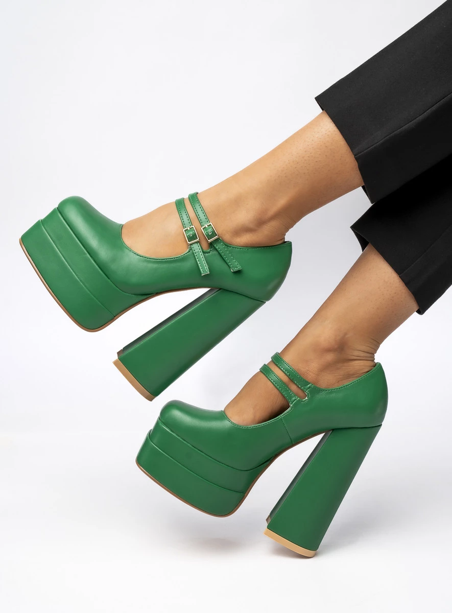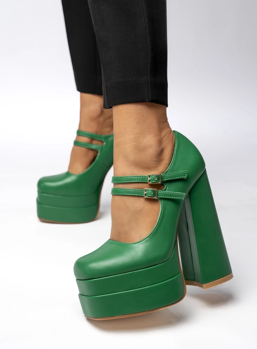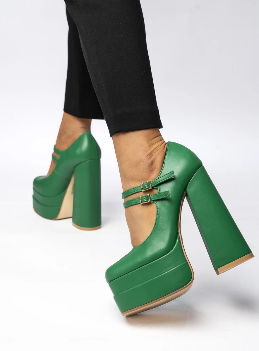 Damskie Czółenka LOIT GREEN to niebanalne połączenie klasycznego fasonu z nowoczesnym wyrazem. Ich masywna platforma oraz gruby słupkowy obcas zapewniają stabilność i komfort noszenia, jednocześnie dodając kilka centymetrów wzrostu. Soczysty, zielony kolor przyciąga spojrzenia i wprowadza do stylizacji energię oraz odrobinę ekstrawagancji. Dwie sprzączki nad podbiciem stopy podkreślają unikalny charakter modelu.