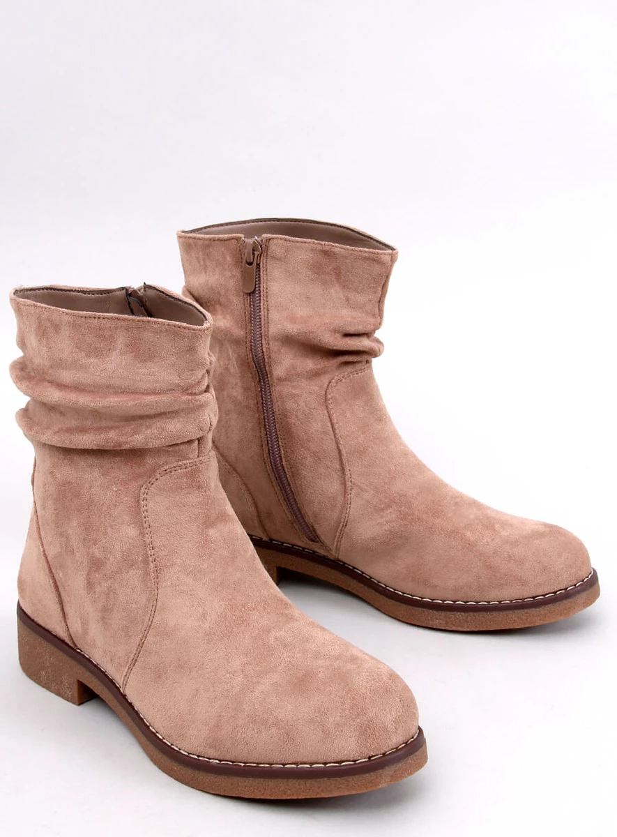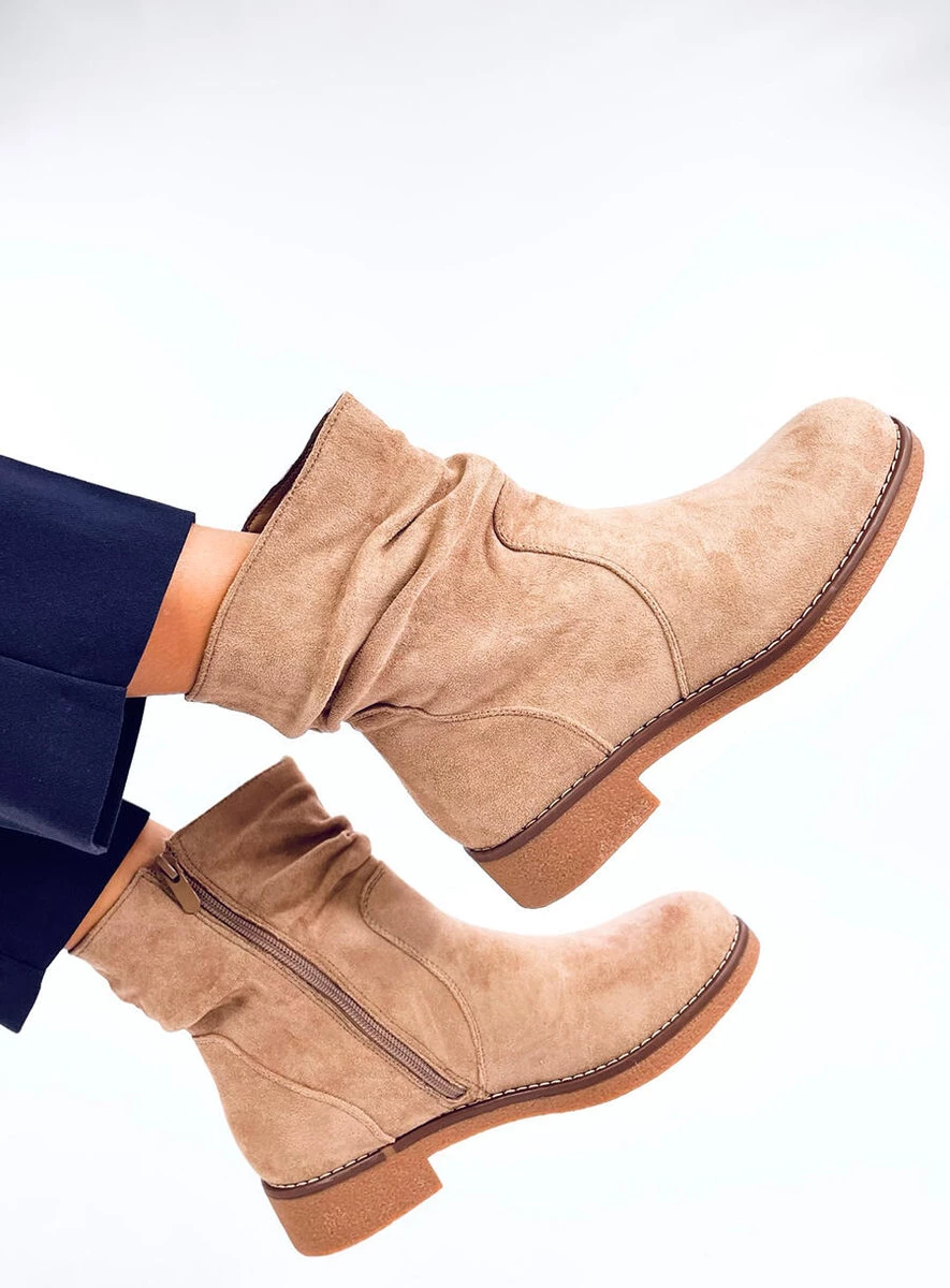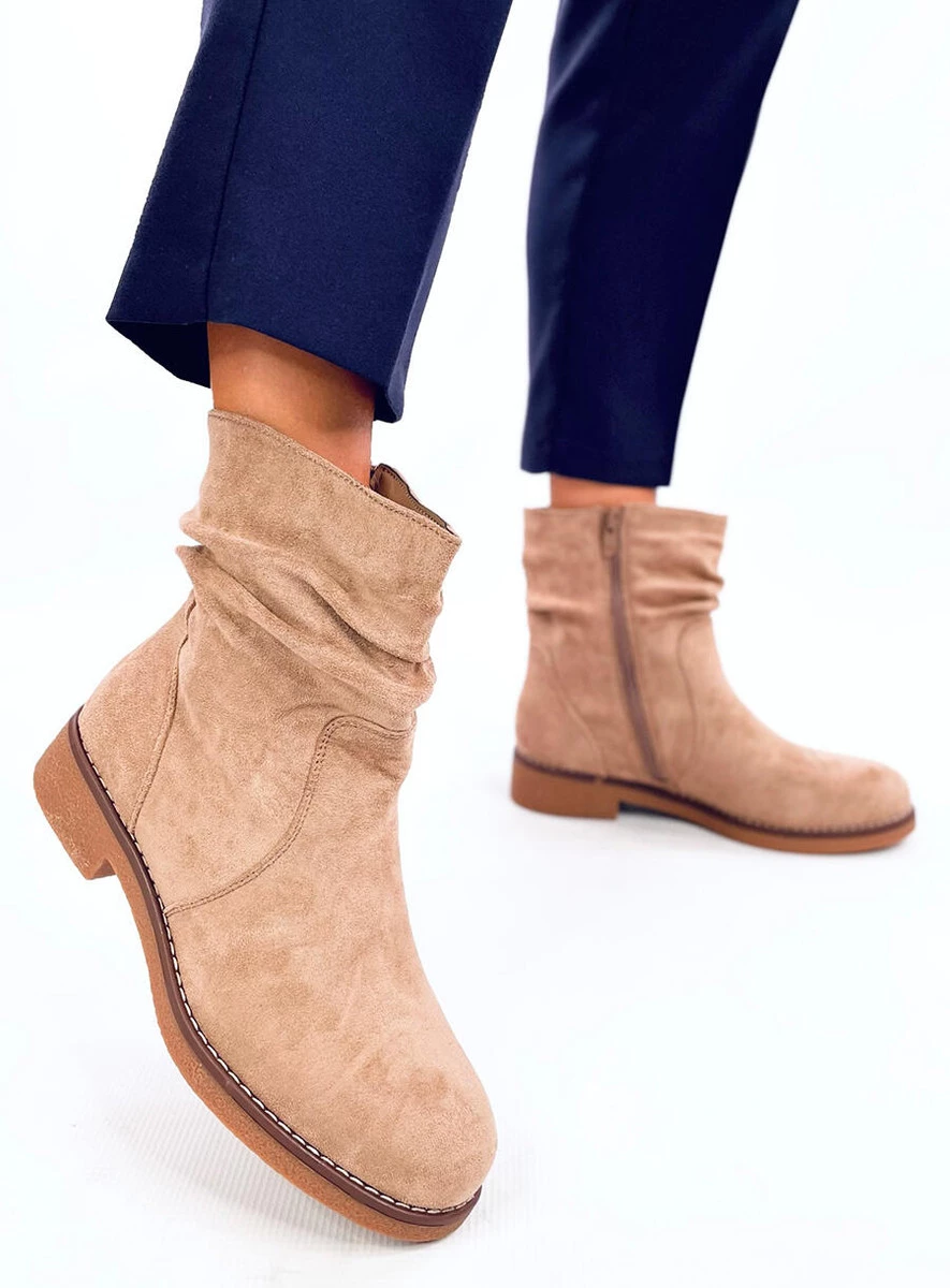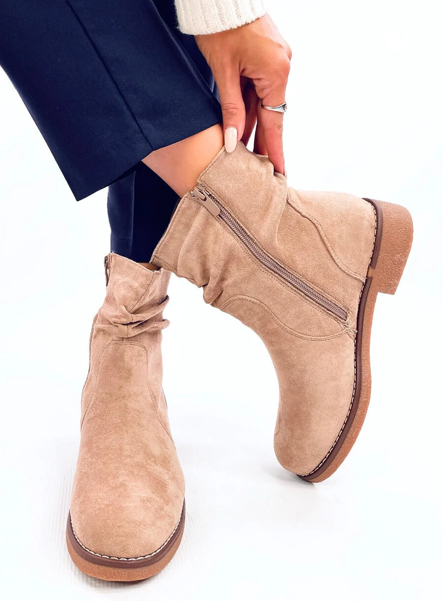 Zamszowe botki damskie na płaskiej podeszwie. Wyjątkowy urok tego modelu tkwi w jego prostym i klasycznym fasonie z modnie marszczoną cholewką. Wygodne zapięcie na zamek błyskawiczny z boku cholewki to kolejny argument, który za nimi przemawia : ) Wykonane są z zamszu ekologicznego, a wnętrze wyścielone jest delikatnym futerkiem.
