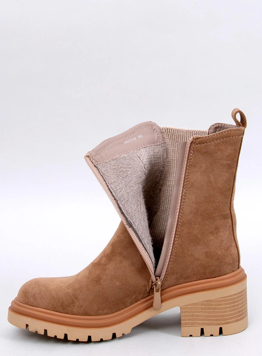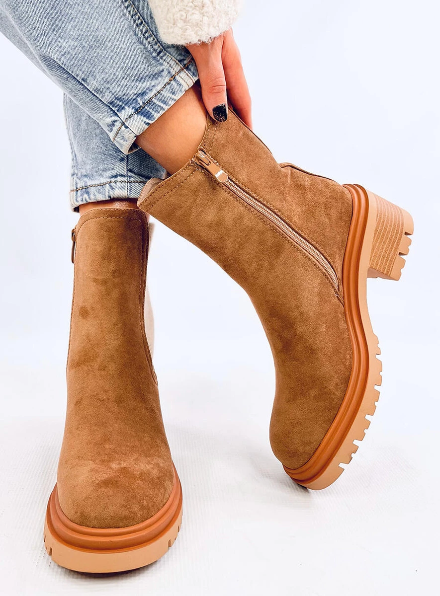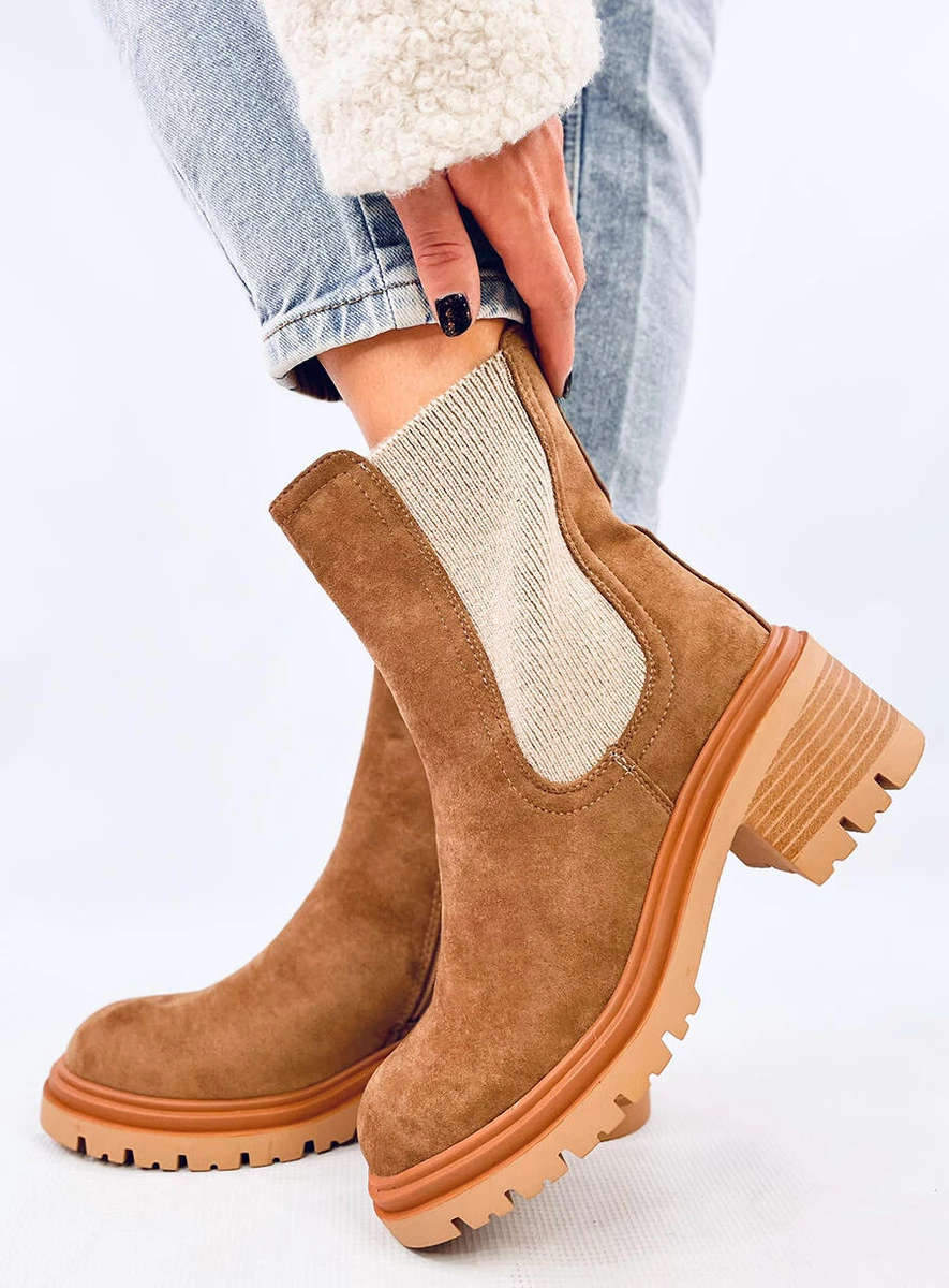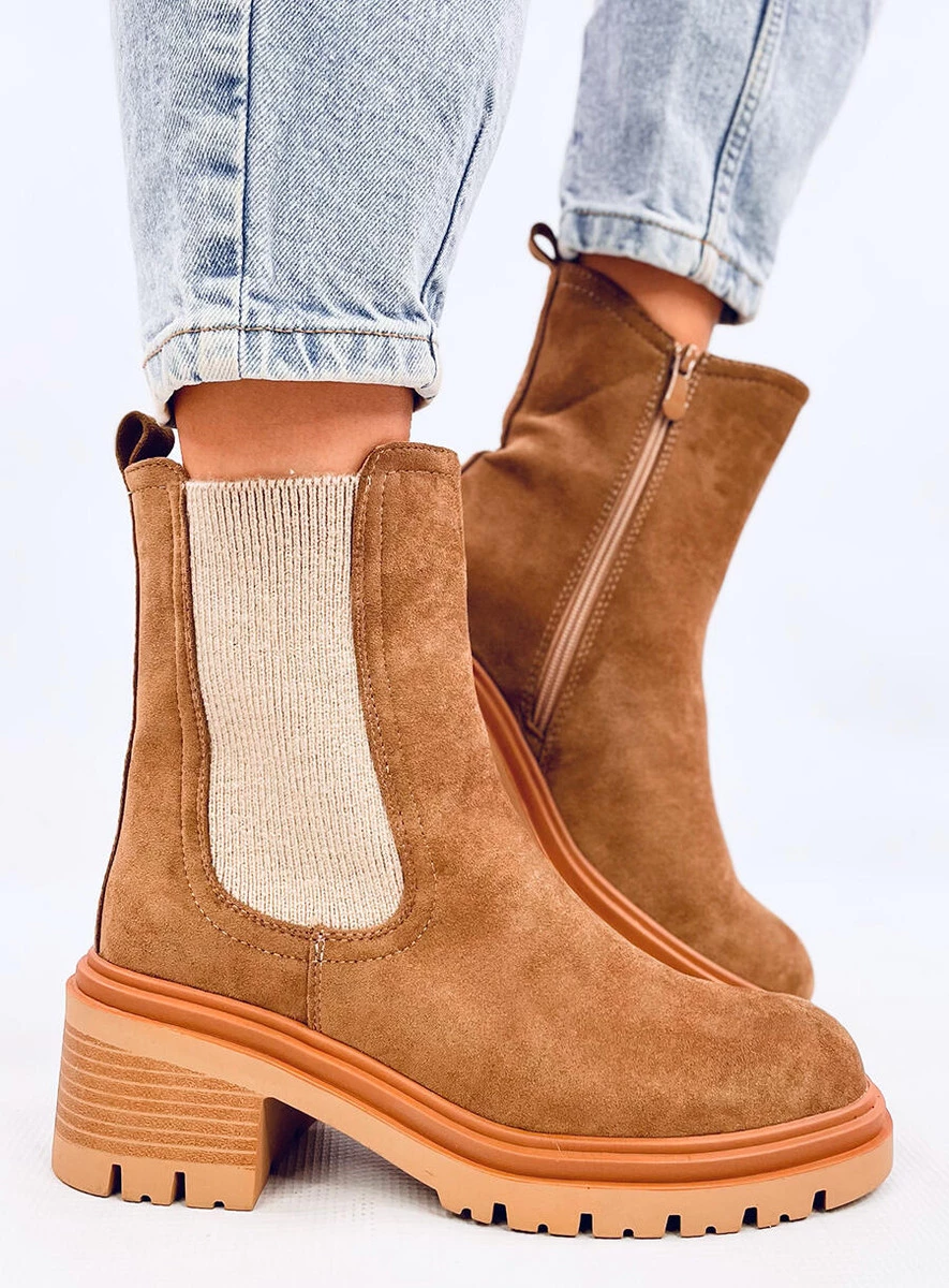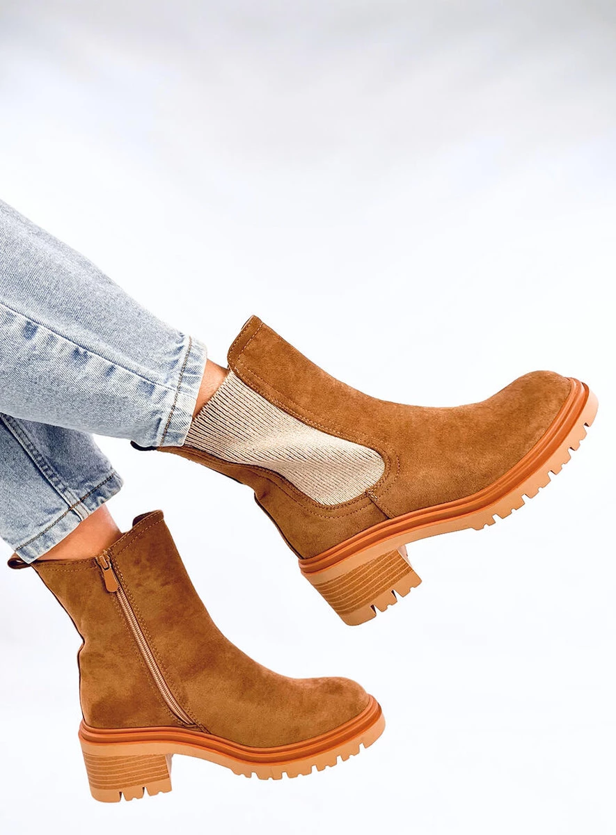 Zamszowe botki damskie o kroju sztybletów. Klasyczny design tego modelu został urozmaicony swetrowym, kontrastującym ściągaczem. Szeroki obcas o wysokości 5,5 cm oraz praktyczne zapięcie na zamek błyskawiczny to ich niewątpliwe zalety. To idealne buty na co dzień! Wykonane są z zamszu ekologicznego, a wnętrze wyścielone jest delikatnym futerkiem.