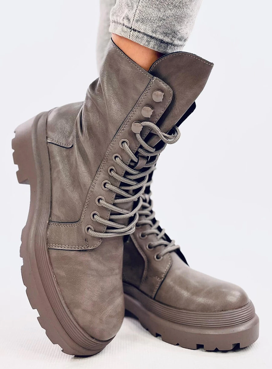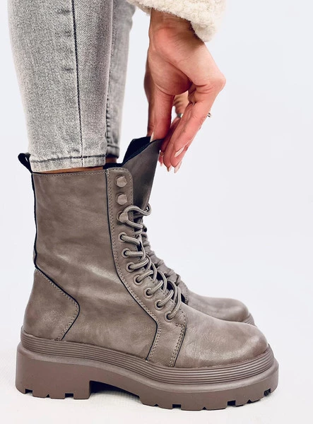 Sznurowane botki damskie – workery na protektorze. Mają ponadczasowy fason w militarnym stylu - absolutny must have : ) Klasycznie sznurowane, dzięki czemu można je idealnie dopasować do tęgości stopy, ale mają również zapięcie na zamek błyskawiczny z boku cholewki. Wykonane są z delikatnej skóry ekologicznej przypominającej w dotyku skórę cielęcą...