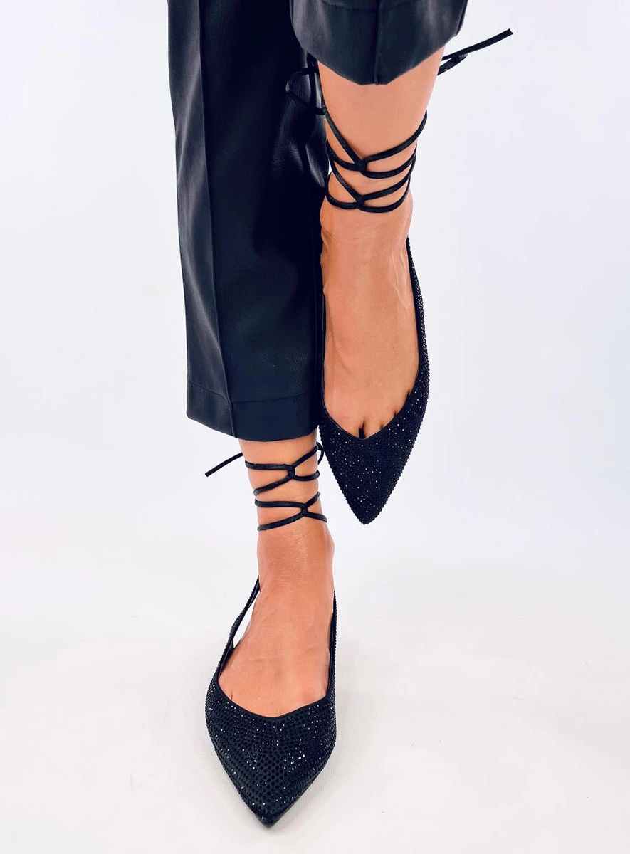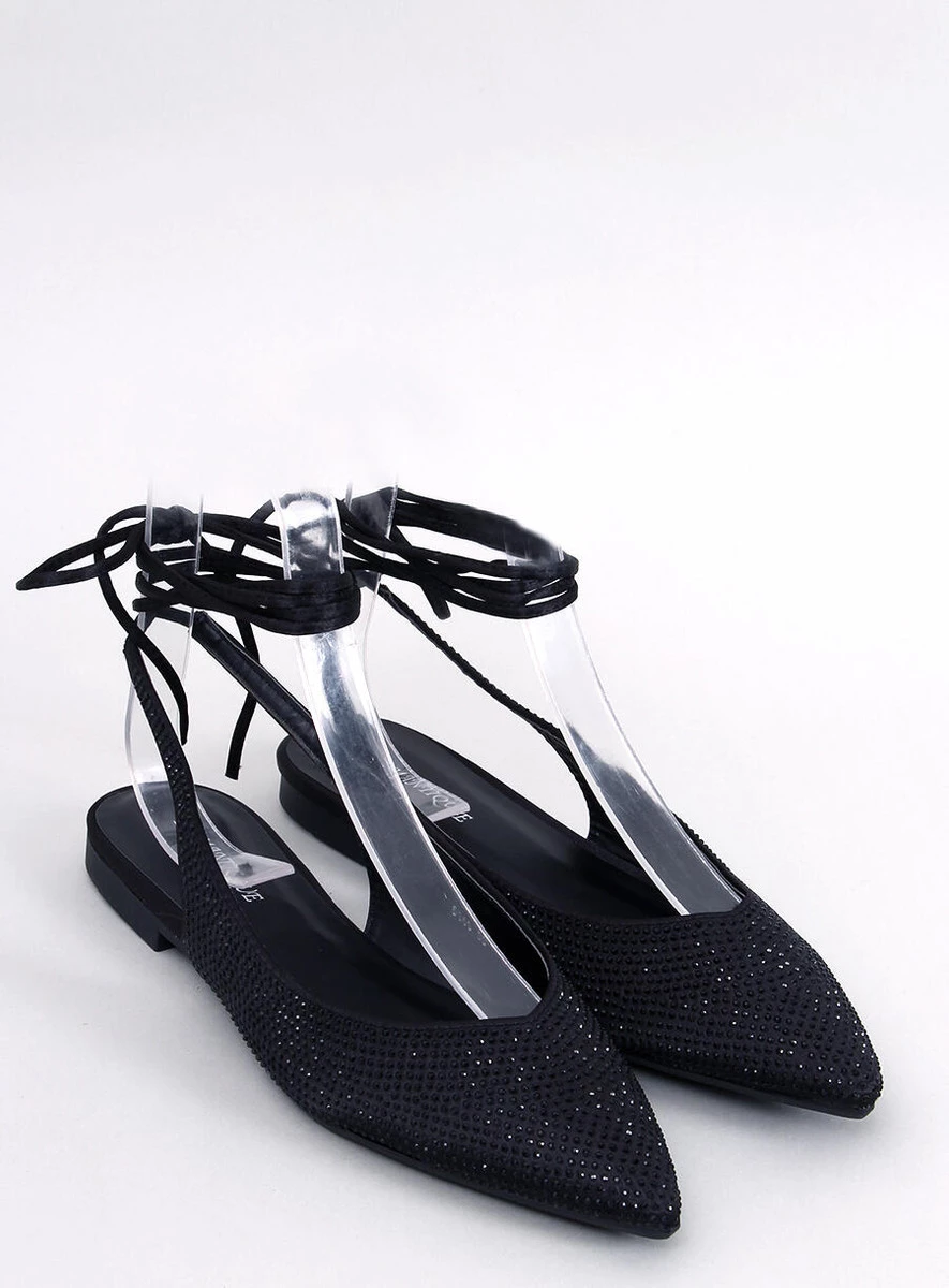 Wiązane baleriny damskie z odkrytą piętą. Model ma zgrabny fason ze zwężającymi się noskami i zmysłowym wiązaniem, które pięknie oplata kostkę.. W tych butach wysadzanych błyszczącymi cyrkoniami można się zakochać! Materiał zewnętrzny – tkanina.