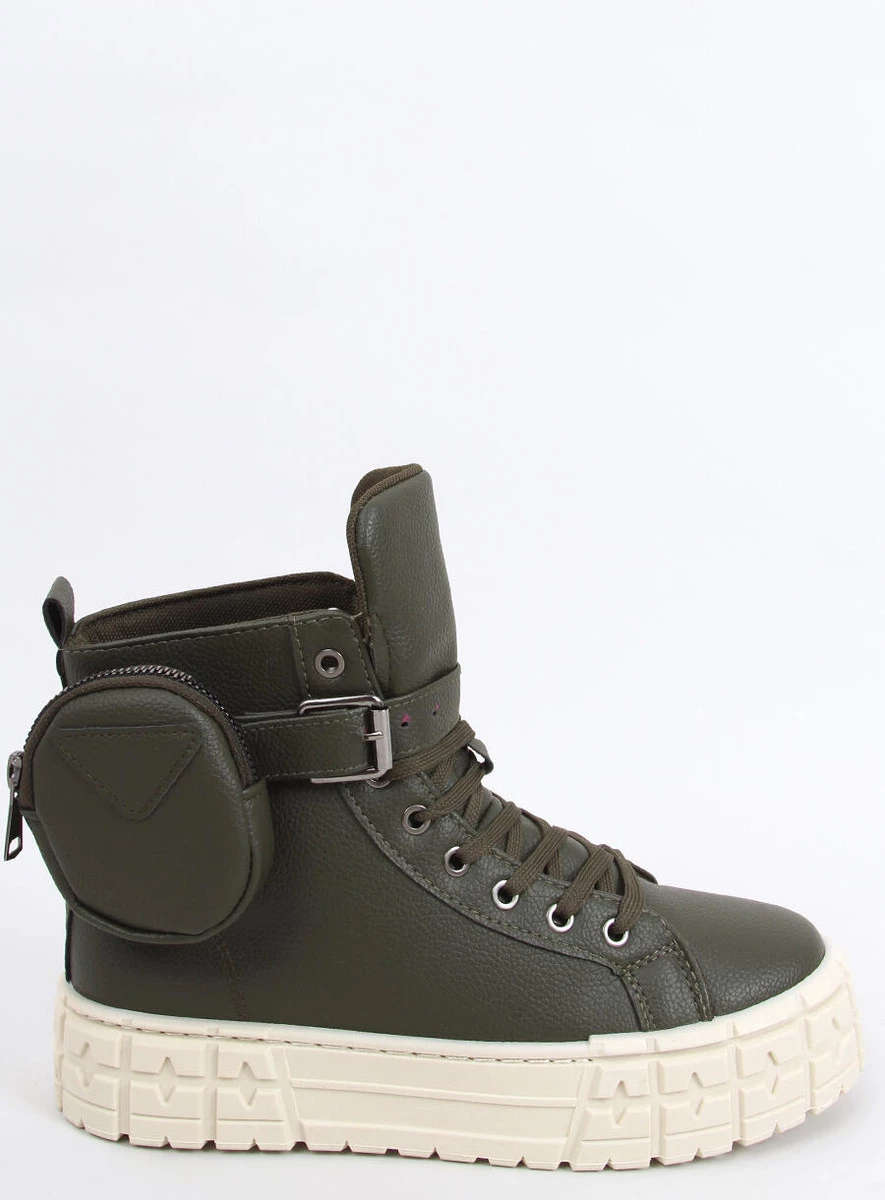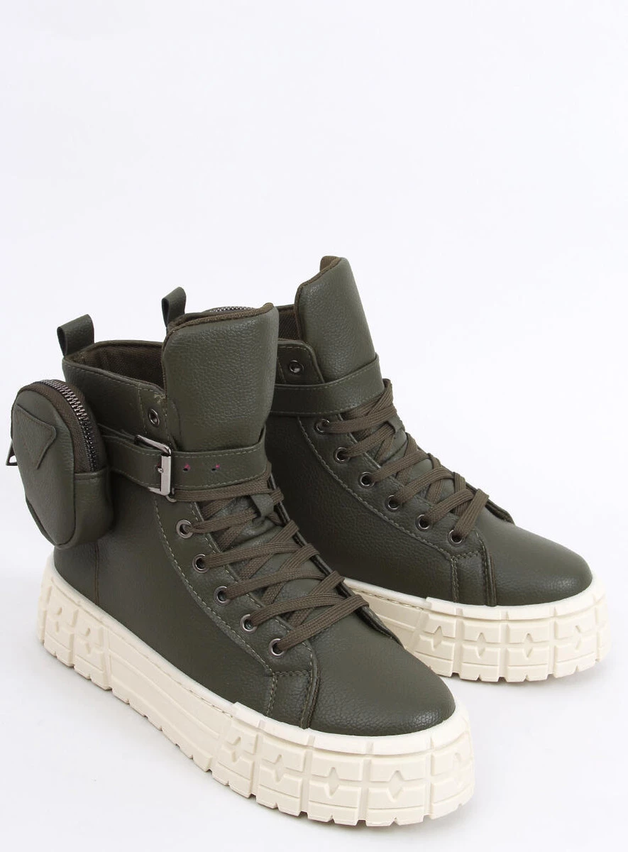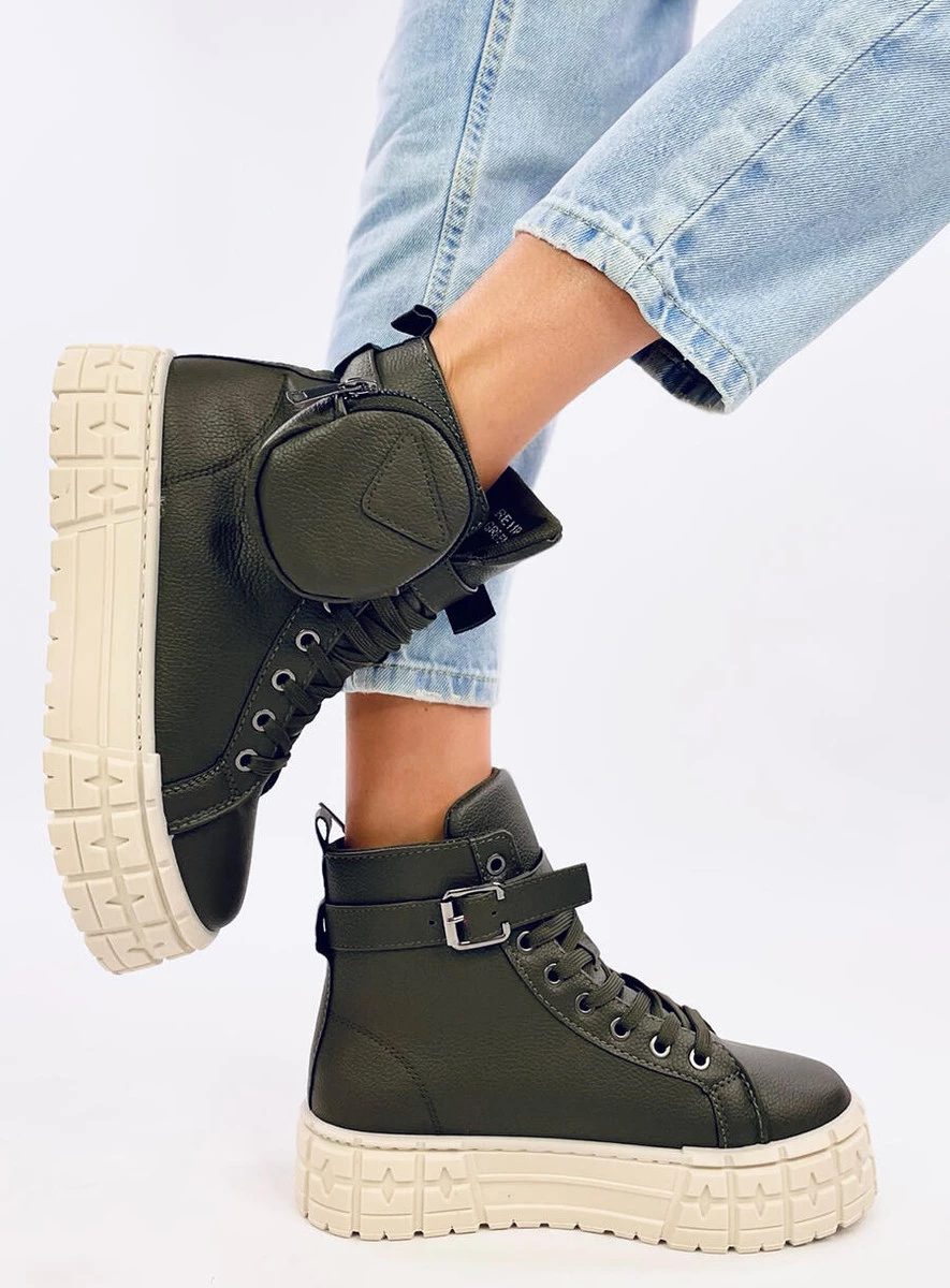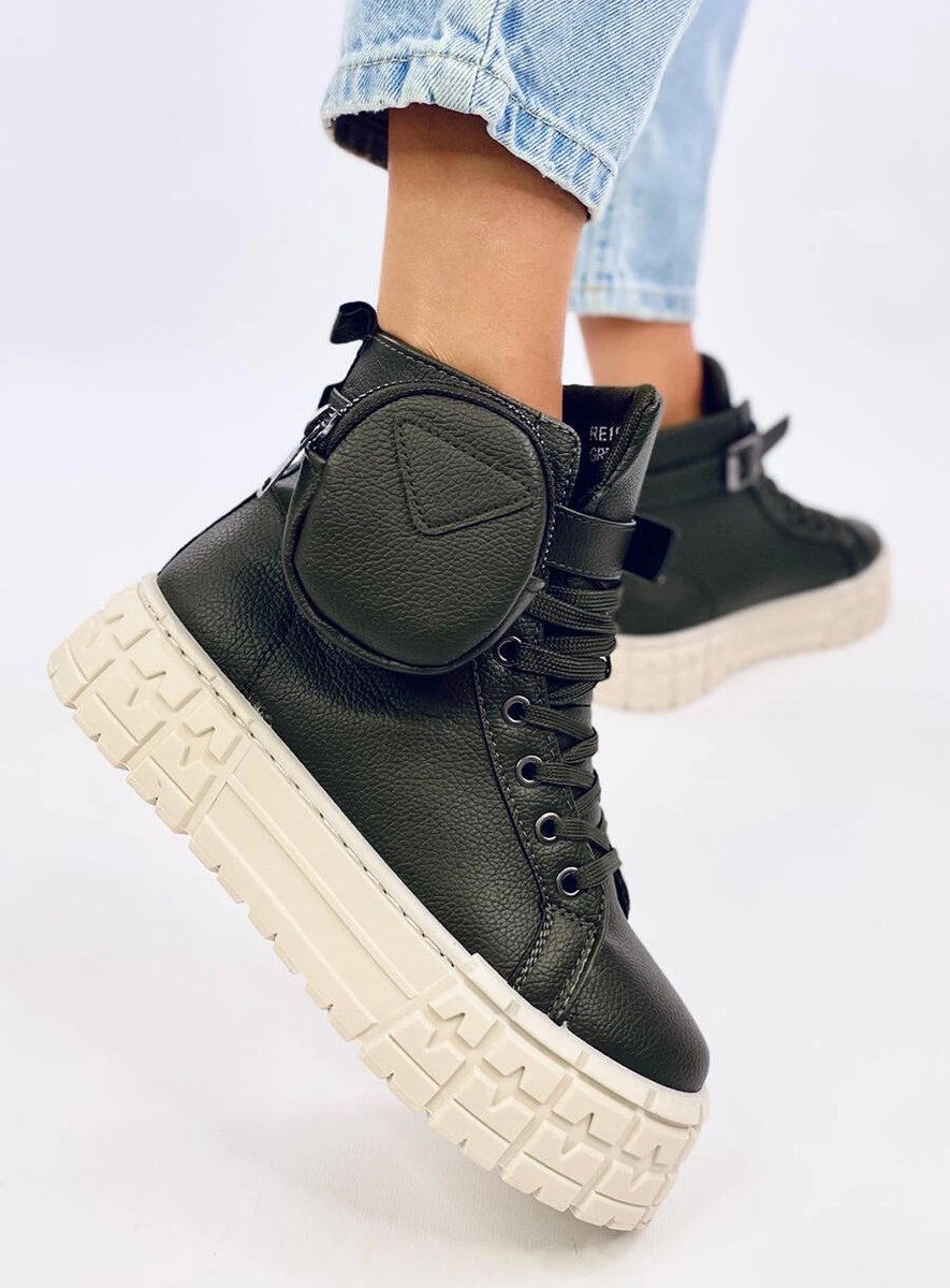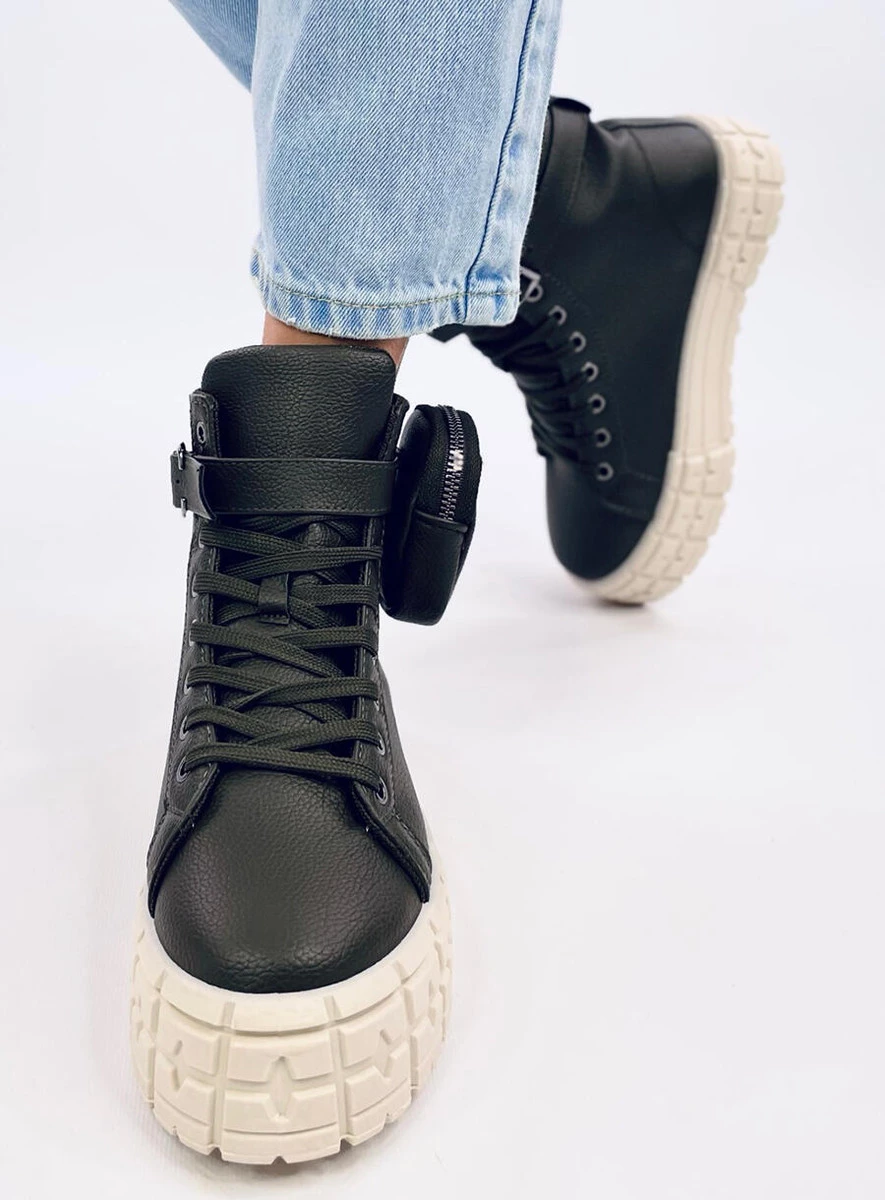 Sznurowane trampki damskie za kostkę. Model wyróżnia przede wszystkim klasyczny, sportowy fason ze zdejmowaną na pasku najmodniejszą saszetką. Obok tych butów na wysokiej podeszwie (4 cm) nie można przejść obojętnie : ) Wnętrze wyścielone jest tkaniną. Materiał zewnętrzny - skóra ekologiczna.