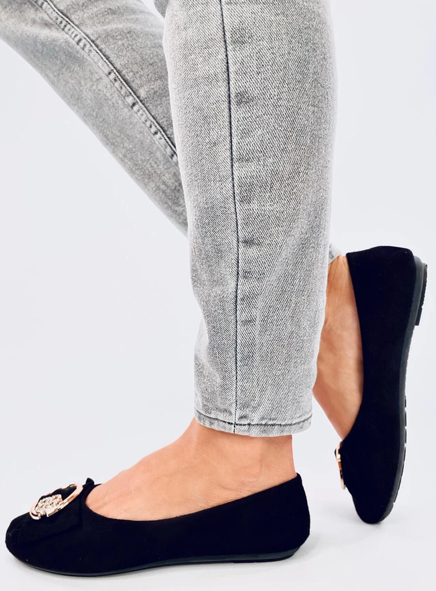 Eleganckie baleriny damskie w czarnym kolorze. Model wyróżnia przepiękna aplikacja z kokardką, która przyciągnie wszystkie spojrzenia... Buty wyglądają modnie i szykownie, a dodatkowo są bardzo wygodne. Materiał zewnętrzny - zamsz ekologiczny.