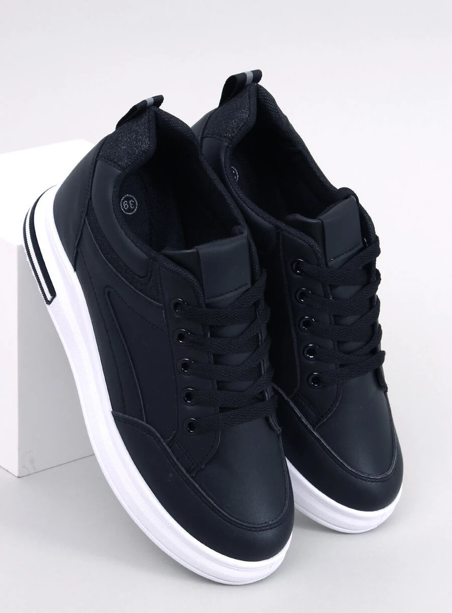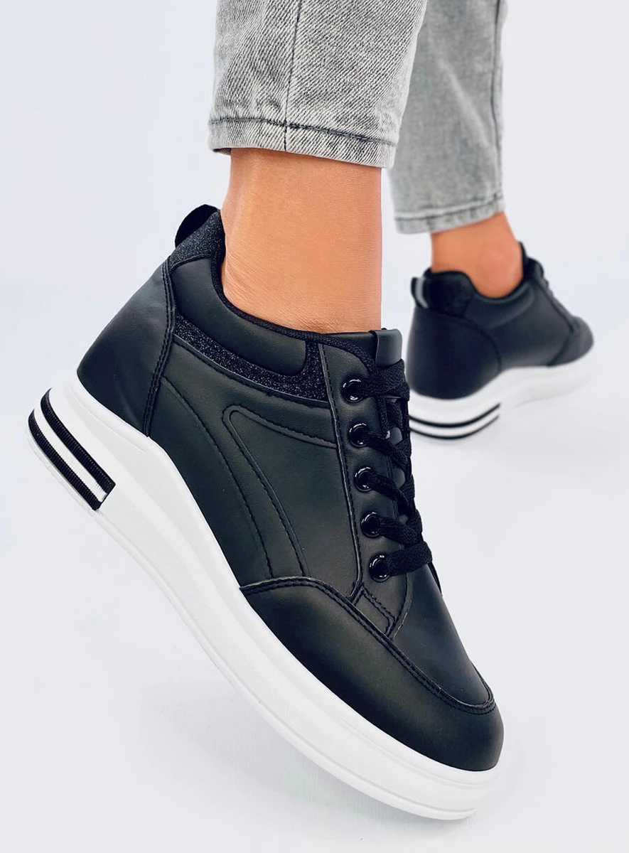 Buty sportowe - sneakersy damskie na koturnie o wysokości 7,5 cm. Błyszczące wstawki z pewnością przyciągną wszystkie spojrzenia... Nie dość, że świetnie wyglądają to jeszcze są niesamowicie wygodne - przekonaj się o tym sama : ) Wykonane są ze skóry ekologicznej, a wnętrze wyścielone jest tkaniną.