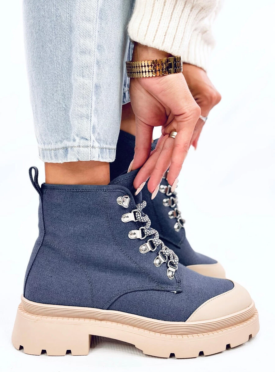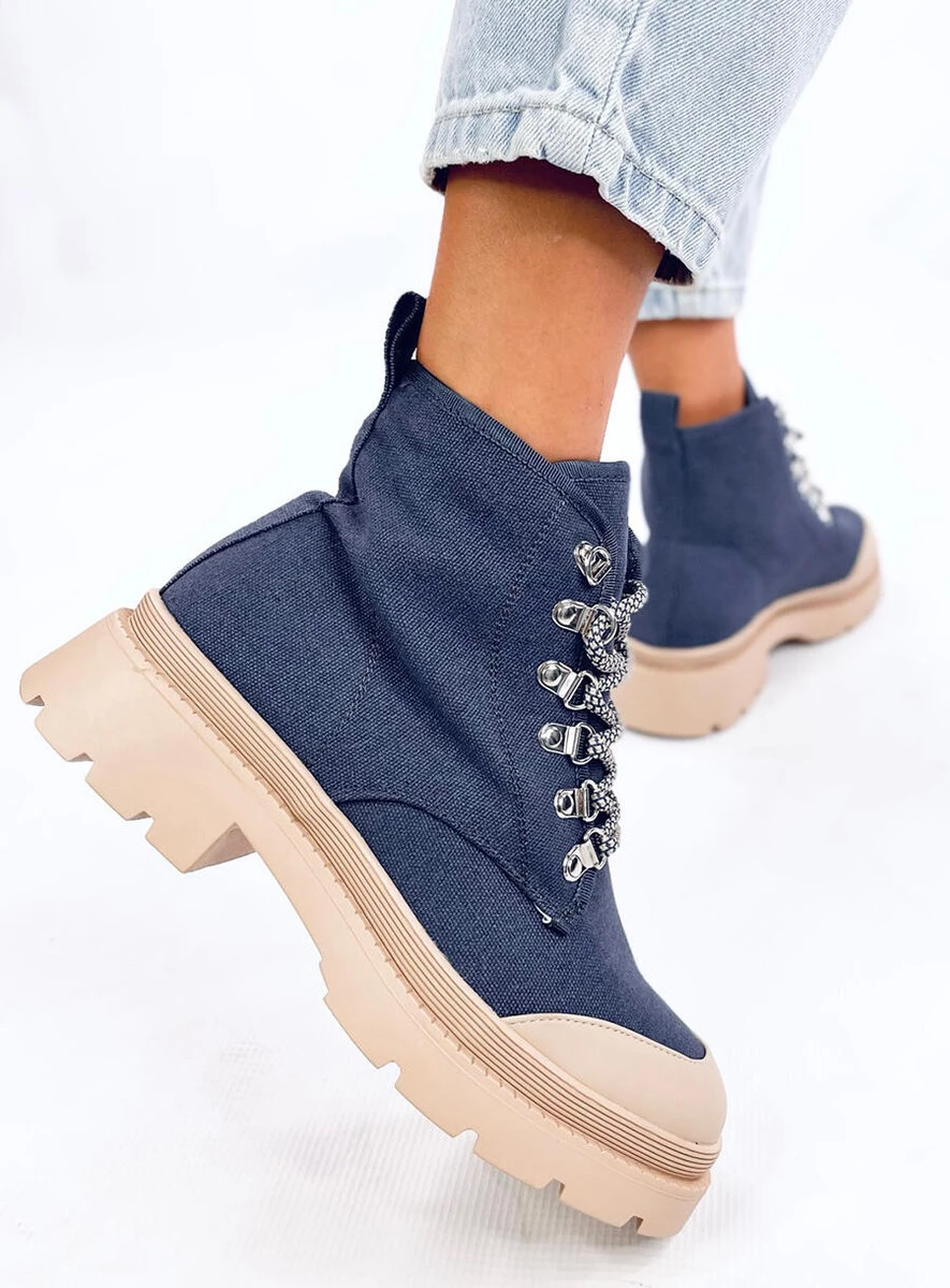 Trekkingowe trampki damskie za kostkę. Mają unikatowy fason na najmodniejszej, wysokiej podeszwie, która doda centymetrów : ) Koniecznie przygarnij je do swojej szafy, a staną się Twoją ulubioną parą butów! Materiał zewnętrzny + wewnętrzny - tkanina.