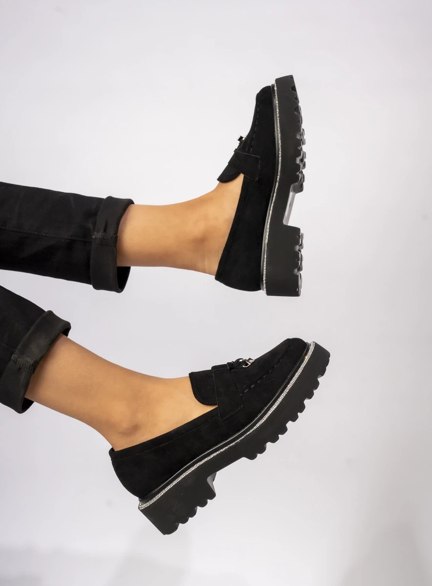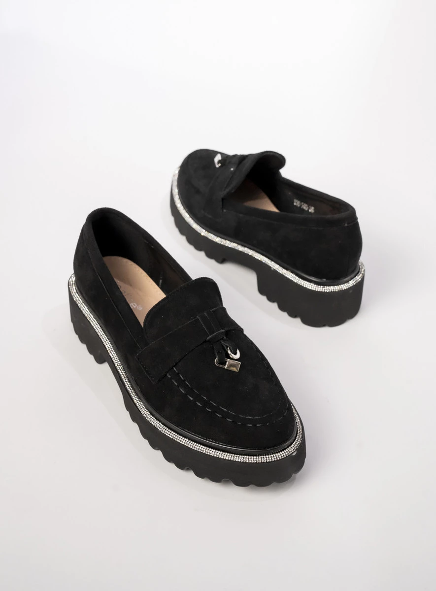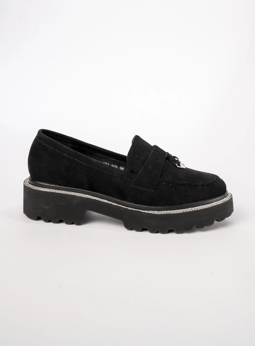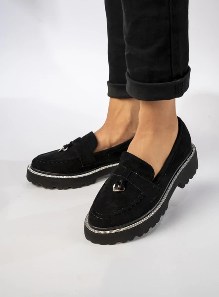 Mokasyny Alessa BLACK to połączenie klasyki i nowoczesnego stylu, idealne na każdą okazję. Wykonane z wysokiej jakości czarnej eko skóry zamszowej, zapewniają komfort noszenia przez cały dzień. Subtelne zdobienia cyrkoniami dodają im wyjątkowego charakteru, a gruba, bieżnikowana podeszwa gwarantuje stabilność i wygodę. Świetnie komponują się zarówno z jeansami, jak i eleganckimi cygaretkami, tworząc stylowy i ponadczasowy look.
